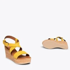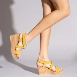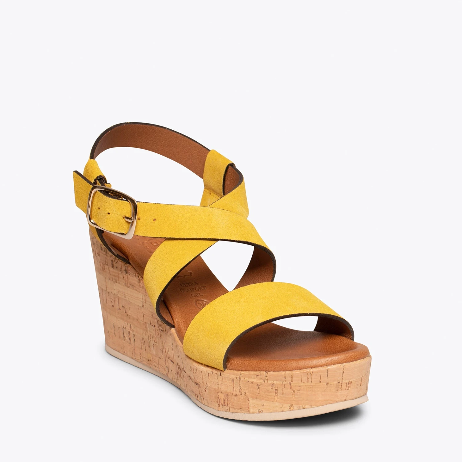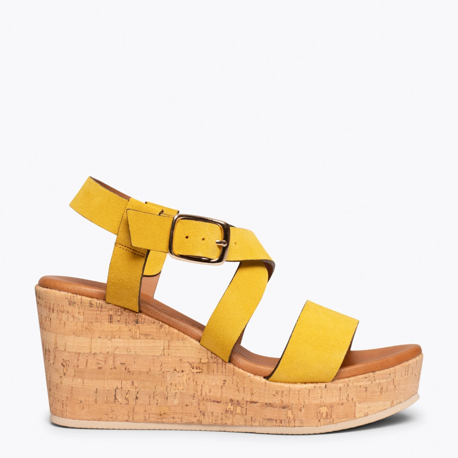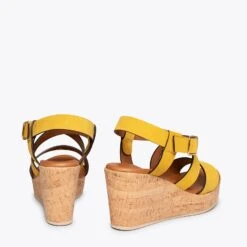 Sandales compensées JAUNE en liège pour femme de la nouvelle collection Printemps-Été 2021. Ces sandales en liège ont un design avec brides croisées et sont fabriquées en cuir nubuck. Compensées en liège pour femme, une sandale légère très confortable grâce à la semelle intérieure ultra rembourrée en cuir Ultra Confort Gel, pour que votre pied soit reposé toute la journée. Vous pouvez désormais acheter des sandales en liège en ligne sur notre site miMaO. Choisissez parmi toutes les couleurs de cette collection et profitez d’une chaussure pour femme Made in Spain.