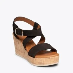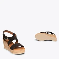 Sandales compensées NOIR en liège pour femme de la nouvelle collection Printemps-Été 2021. Ces sandales en liège ont un design avec brides croisées et sont fabriquées en cuir nubuck. Compensées en liège pour femme, une sandale légère très confortable grâce à la semelle intérieure ultra rembourrée en cuir Ultra Confort Gel, pour que votre pied soit reposé toute la journée. Vous pouvez désormais acheter des sandales en liège en ligne sur notre site miMaO. Choisissez parmi toutes les couleurs de cette collection et profitez d’une chaussure pour femme Made in Spain.
