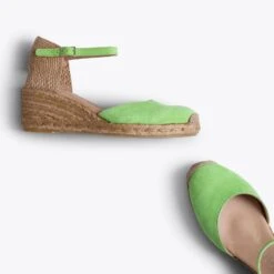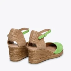 Espadrille à talon compensé moyen pour femme couleur VERT avec talon de 6 cm et plateforme à l’avant de 2 cm, à bout arrondi, fermeture avec courroie à boucle et talon en toile. Espadrilles compensées en daim avec semelle intérieure avec Goutte Ultra Confort Gel et semelle extérieure en caoutchouc antidérapant. Essayez la qualité de ces chaussures fabriquées en Espagne. Achetez vos chaussures confortables online et recevez-les sous 2 à 4 jours ouvrables.