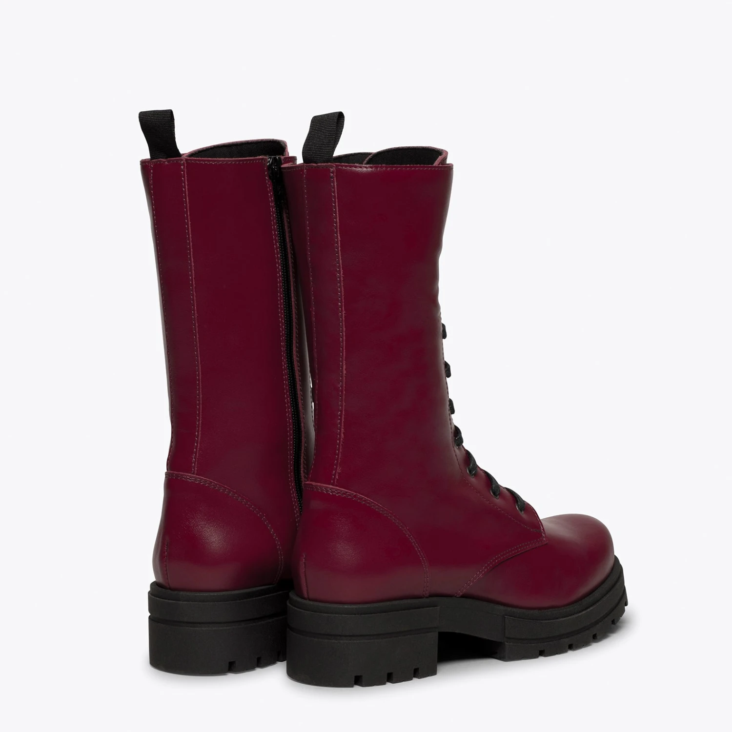 Force. Le mot parfait pour dĂ©crire cette botte haute Ă lacets BORDEAUX. Un style militaire rĂ©volutionnaire. Un style tendance total. Et si vous n’avez pas envie d’attacher vos lacets? Pas de soucis, la fermeture Ă glissière latĂ©rale vous permettra de ne pas perdre une minute Ă les chausser. De plus, le confort de sa semelle intĂ©rieure ultra-confort gel et son talon de 4,5 cm vous enchanteront.. Choisissez votre couleur!