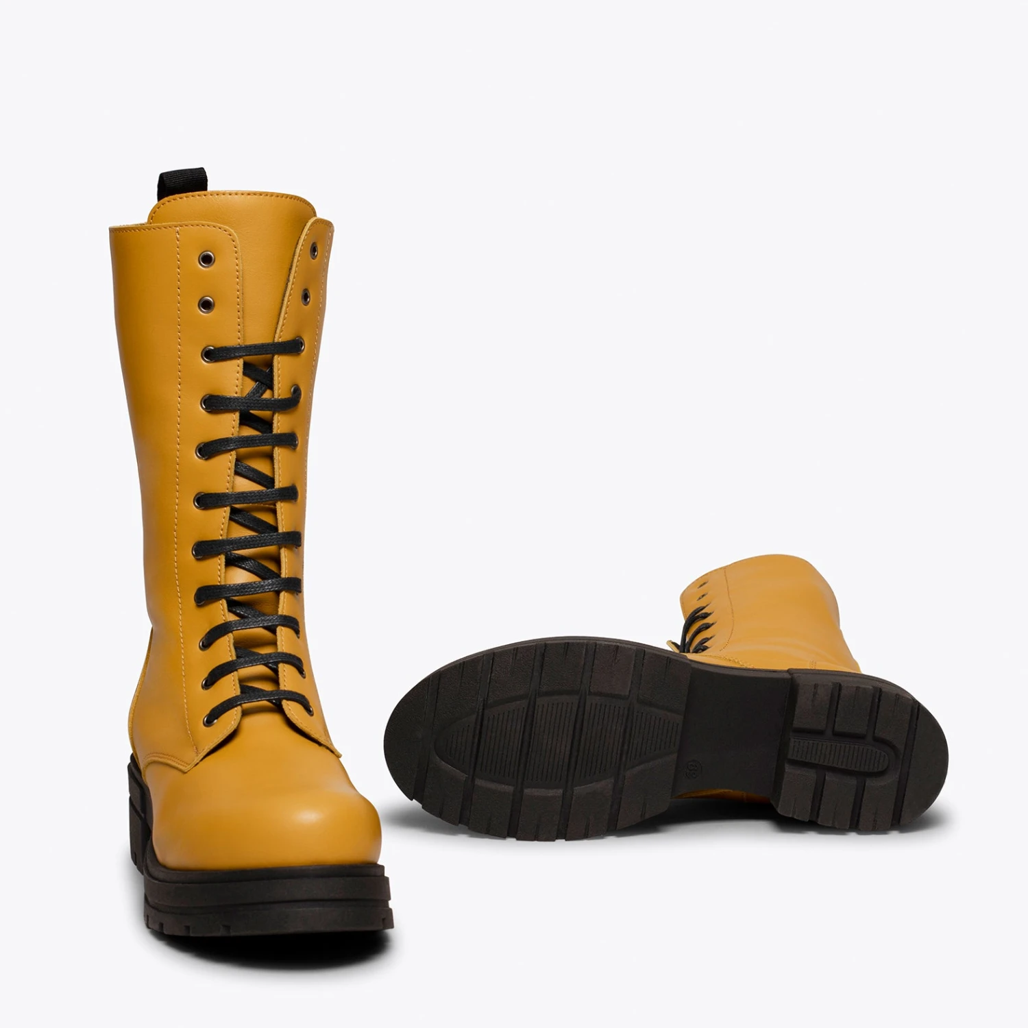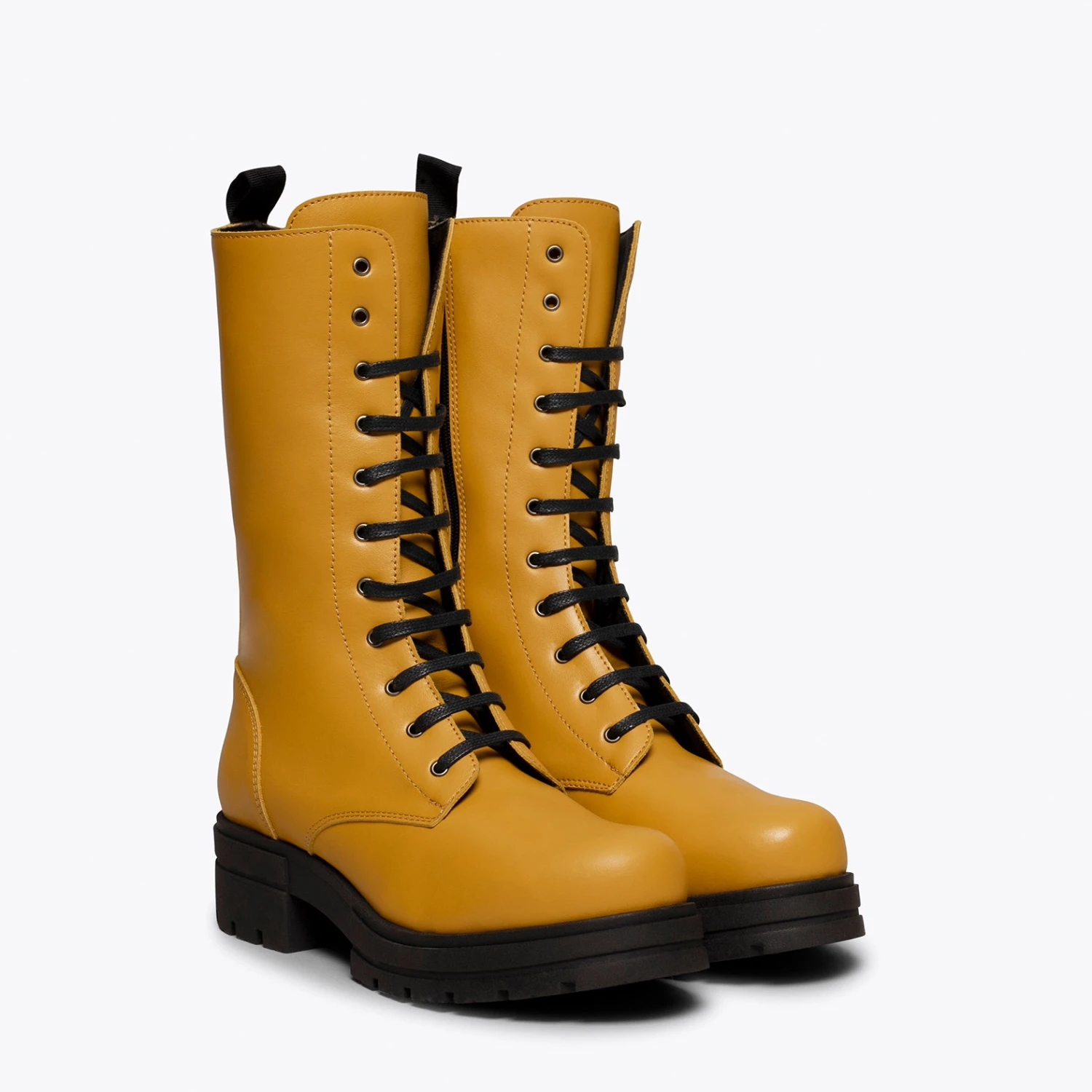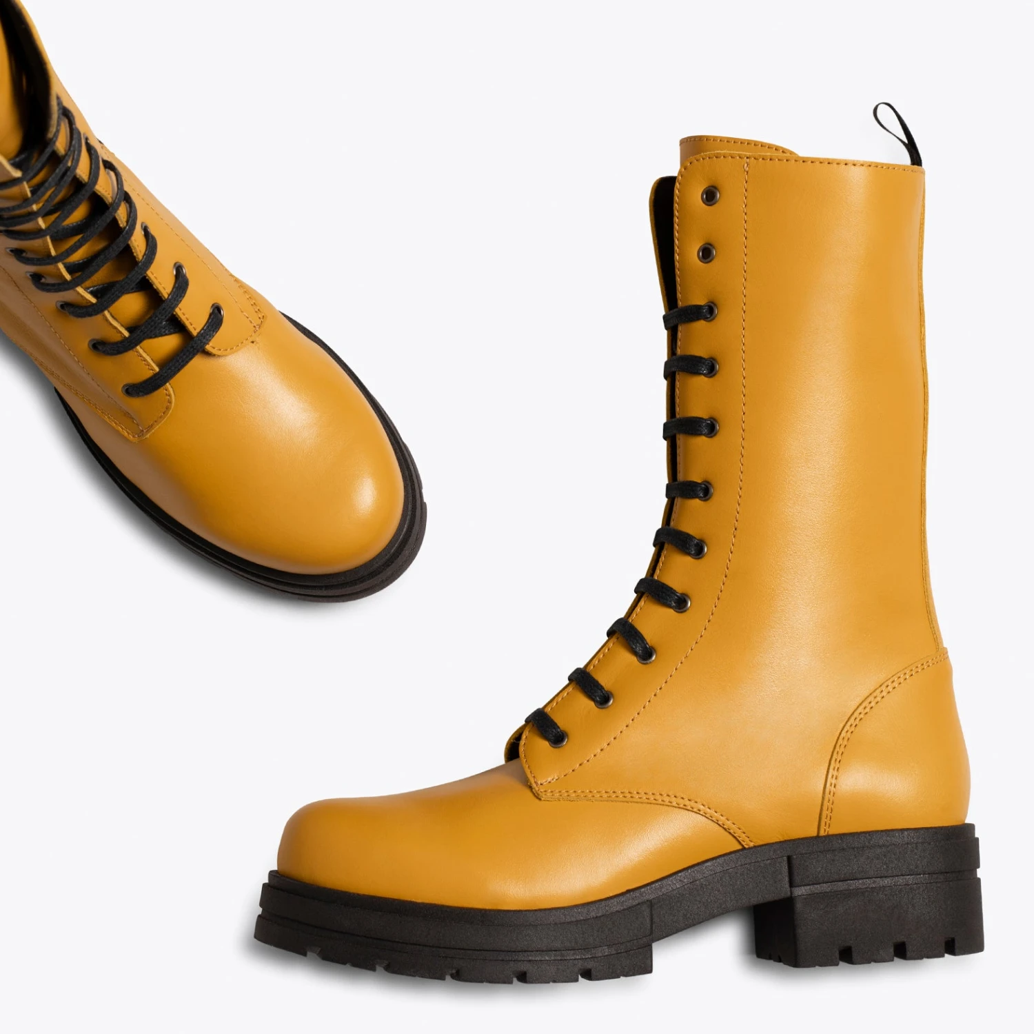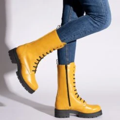 Force. Le mot parfait pour dĂ©crire cette botte haute Ă lacets MOUTARDE. Un style militaire rĂ©volutionnaire. Un style tendance total. Et si vous n’avez pas envie d’attacher vos lacets? Pas de soucis, la fermeture Ă glissière latĂ©rale vous permettra de ne pas perdre une minute Ă les chausser. De plus, le confort de sa semelle intĂ©rieure ultra-confort gel et son talon de 4,5 cm vous enchanteront.. Choisissez votre couleur!