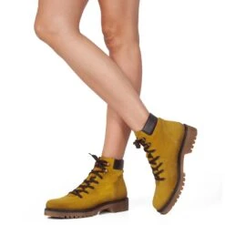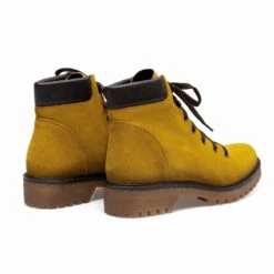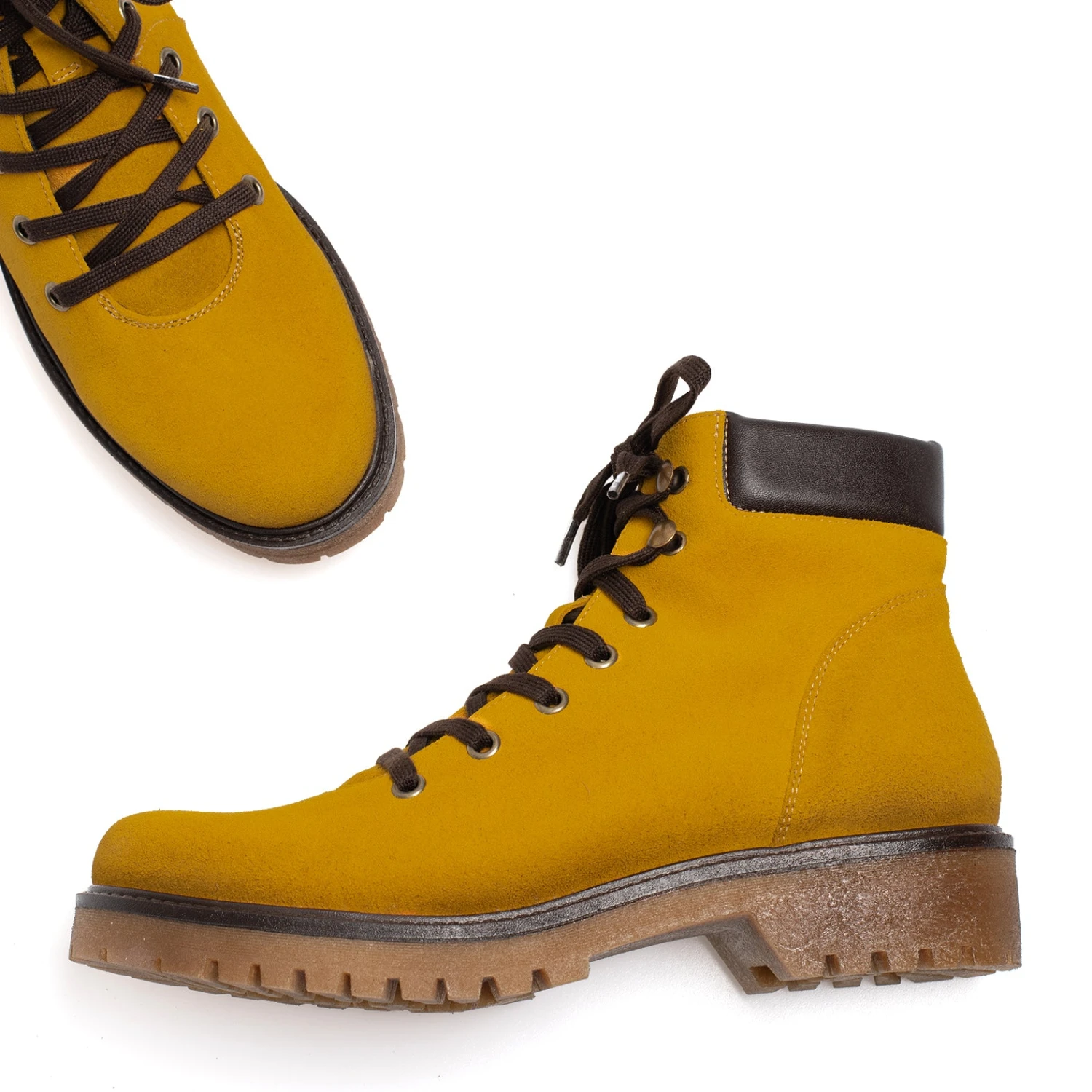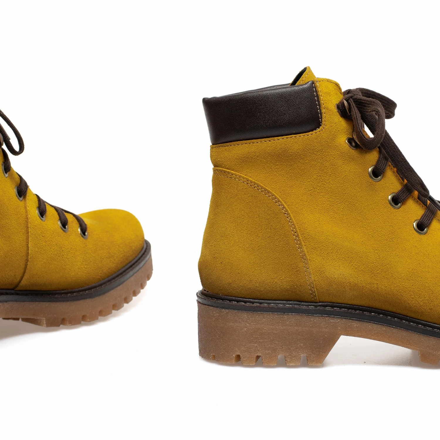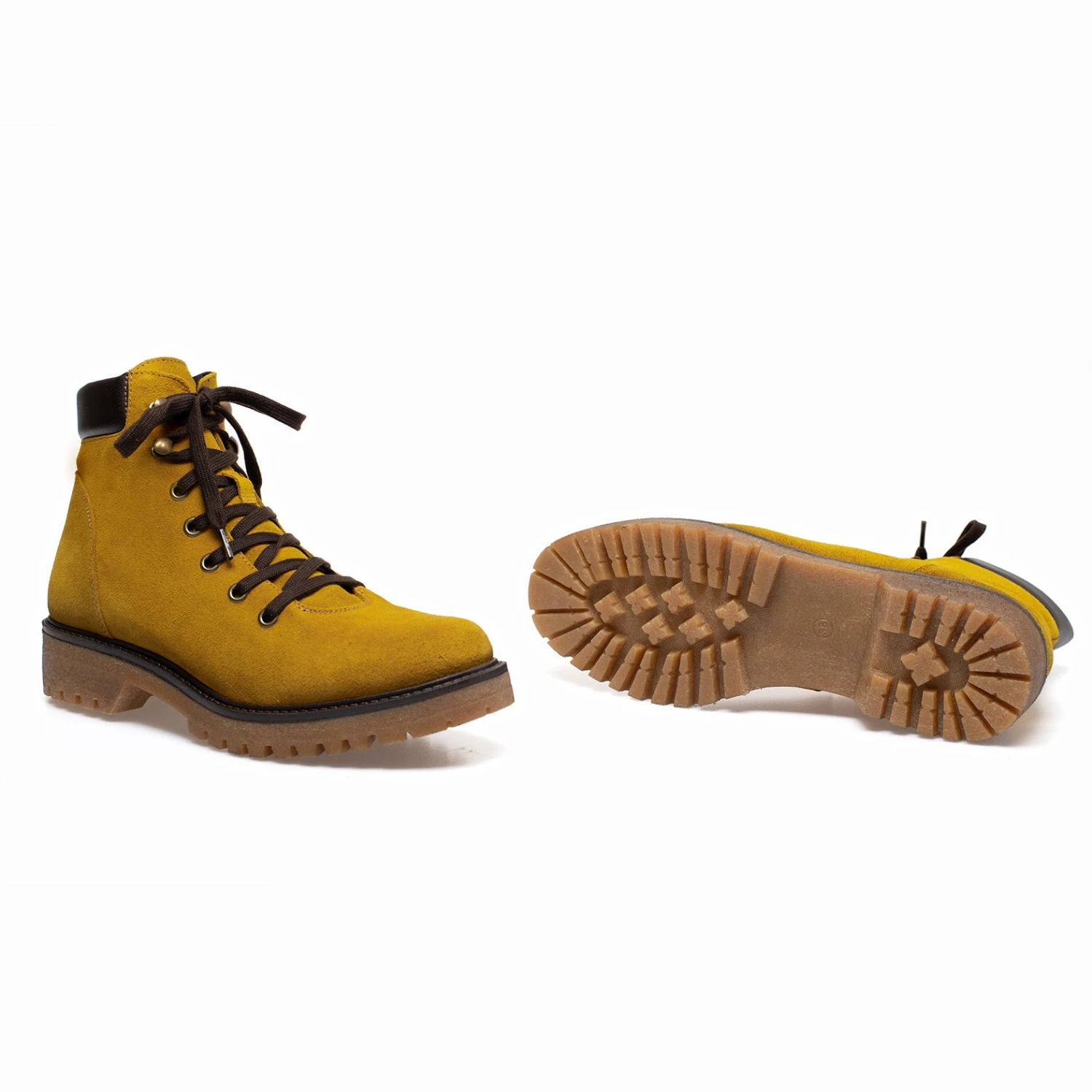Bottine pour femme MOUTARDE type trecking , avec talon plat de 4 cm et plateforme Ă l’avant de 2 cm, semelle extra souple avec encoches pour une meilleure adhĂ©rence et lacets couleur brun.                                                Â
