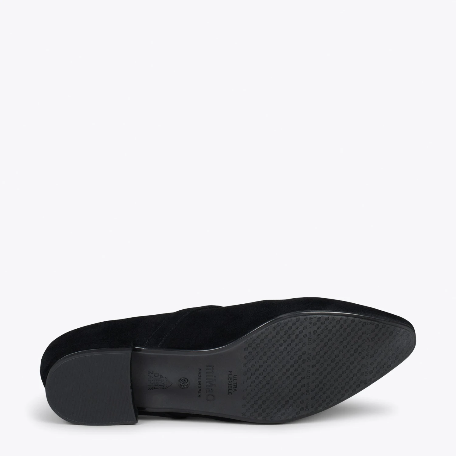 Chaussures plates avec un joli décolleté qui stylise le pied et la jambe sans être à bout pointu. Elles comptent avec un petit bracelet qui permet de les ajuster parfaitement au pied. Semelle extérieure conçue exclusivement par miMaO en caoutchouc synthétique antidérapant.