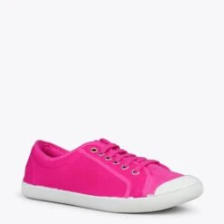 Tennis écologiques fabriqués en coton teinté de manière naturelle de couleur FUCHSIA, parfaits pour associer à vos looks décontractés du Printemps-Été 2023.
