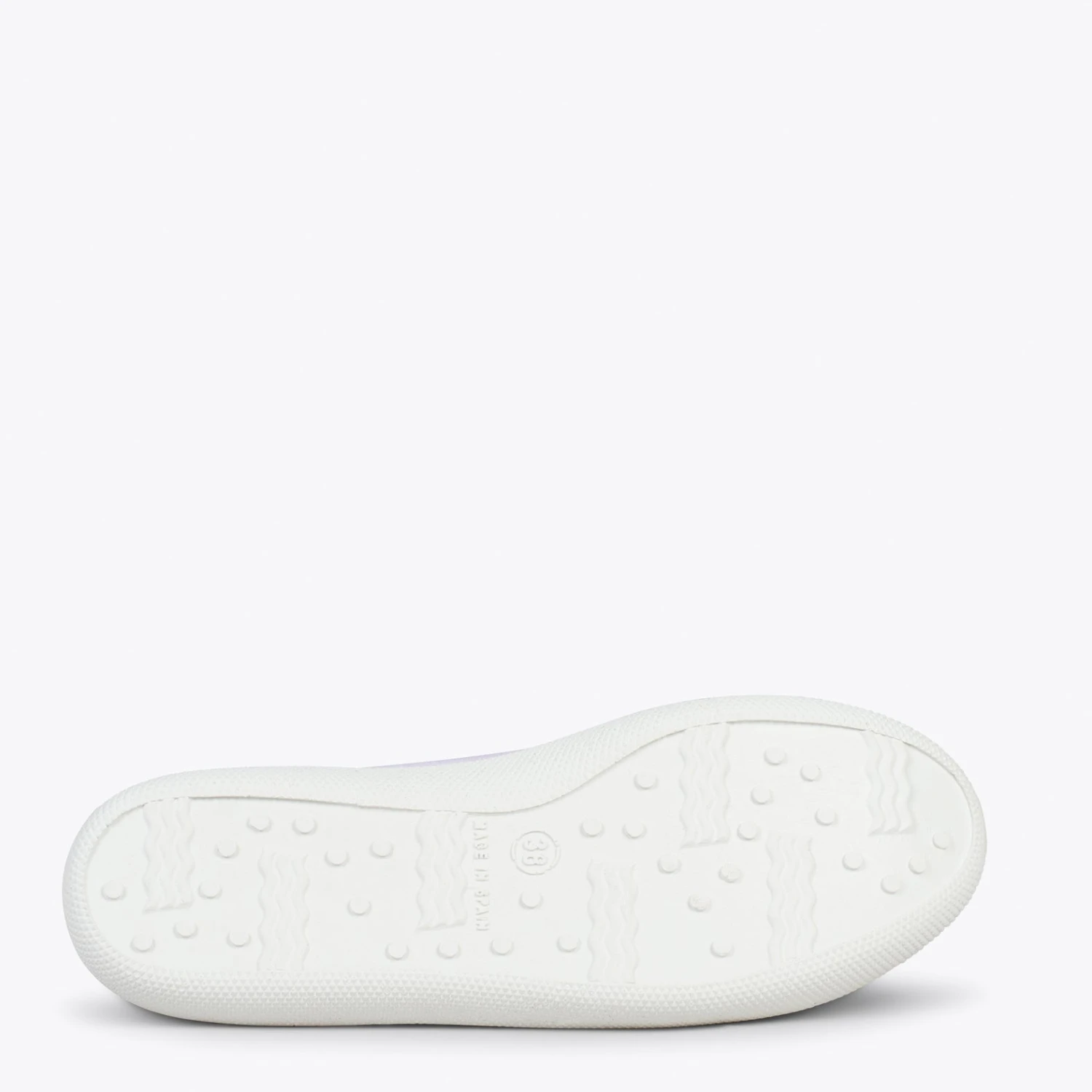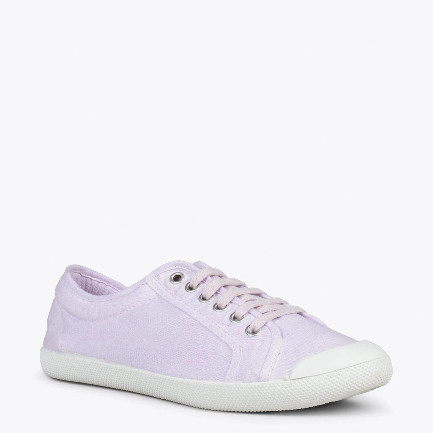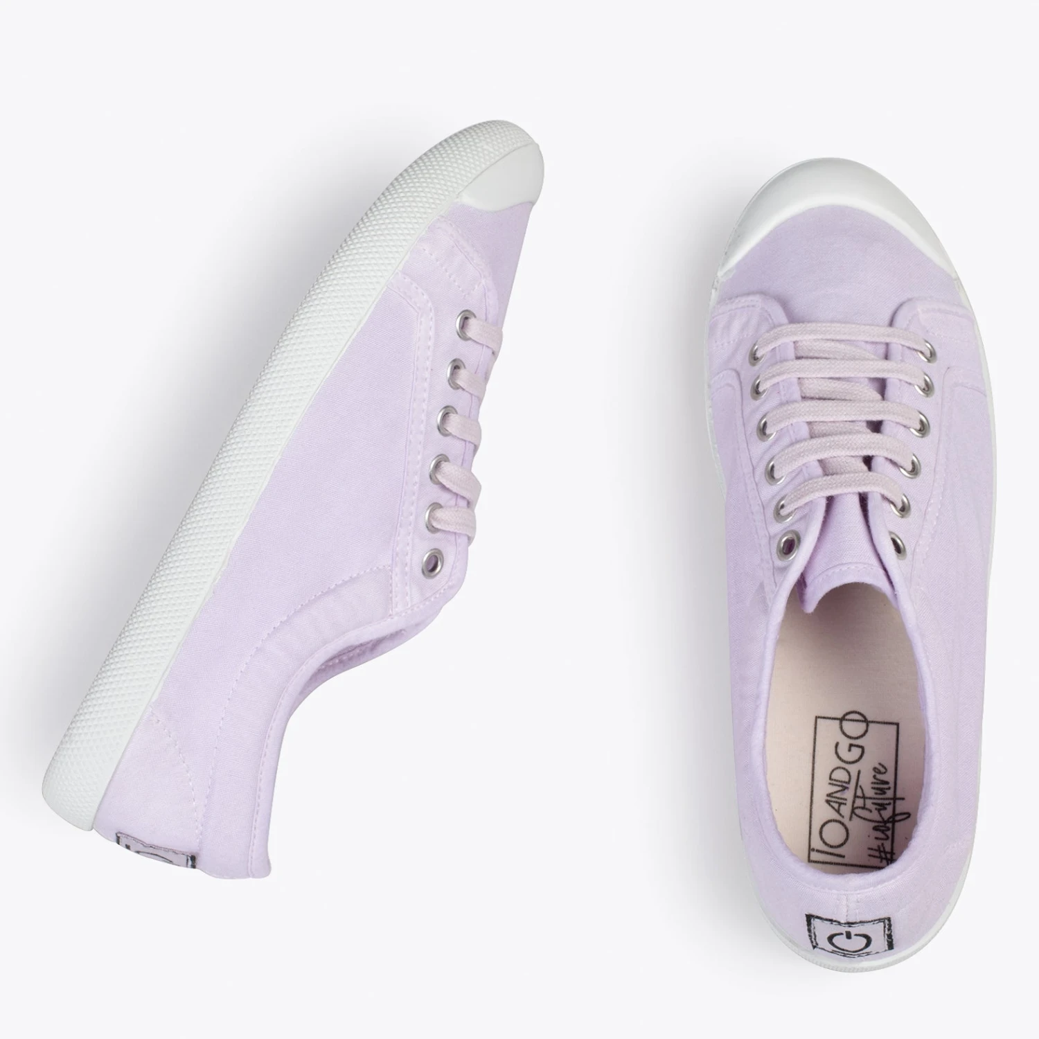 Tennis écologiques fabriqués en coton teinté de manière naturelle de couleur LILA, parfaits pour associer à vos looks décontractés du Printemps-Été 2023.