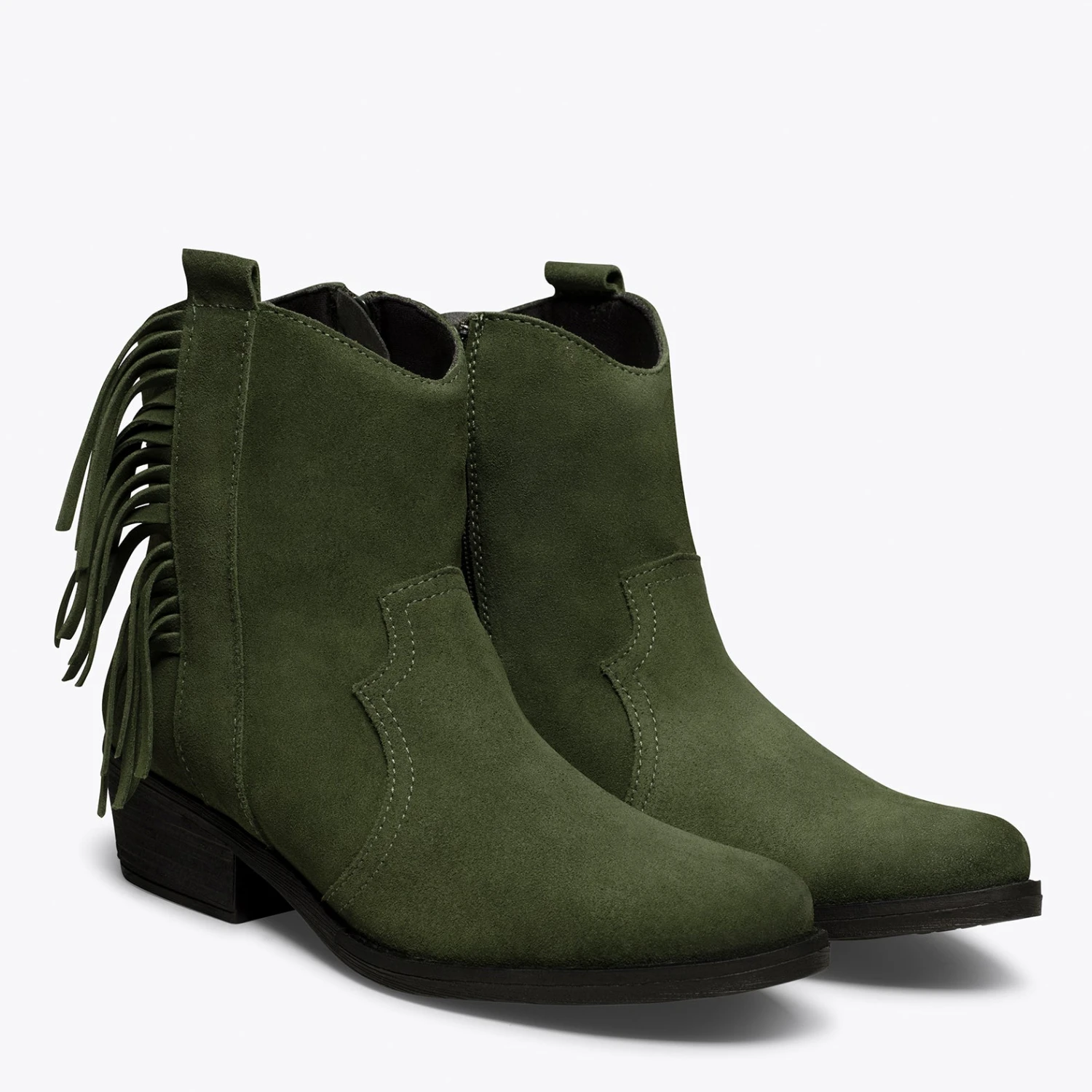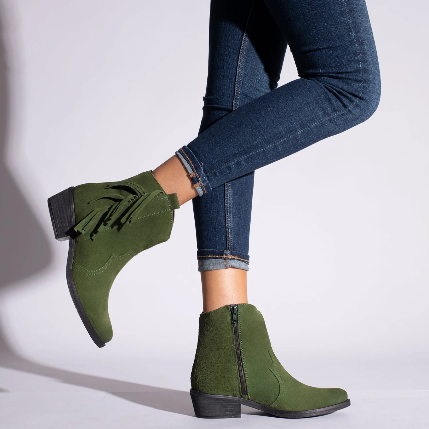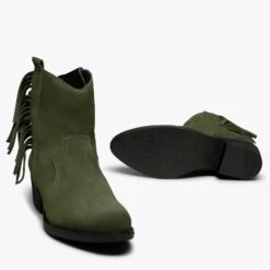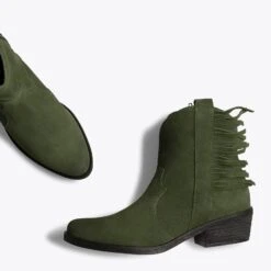 Bottines style cowboy VERT avec franges Ă l’extĂ©rieur. Cette bottine VERT est en cuir Nubuck, matĂ©riau totalement transpirable. Elle intègre Ă©galement une semelle intĂ©rieure Ultra Confort Gel, de sorte que vos pas seront amortis et la santĂ© de vos pieds et de votre dos sera assurĂ©e.