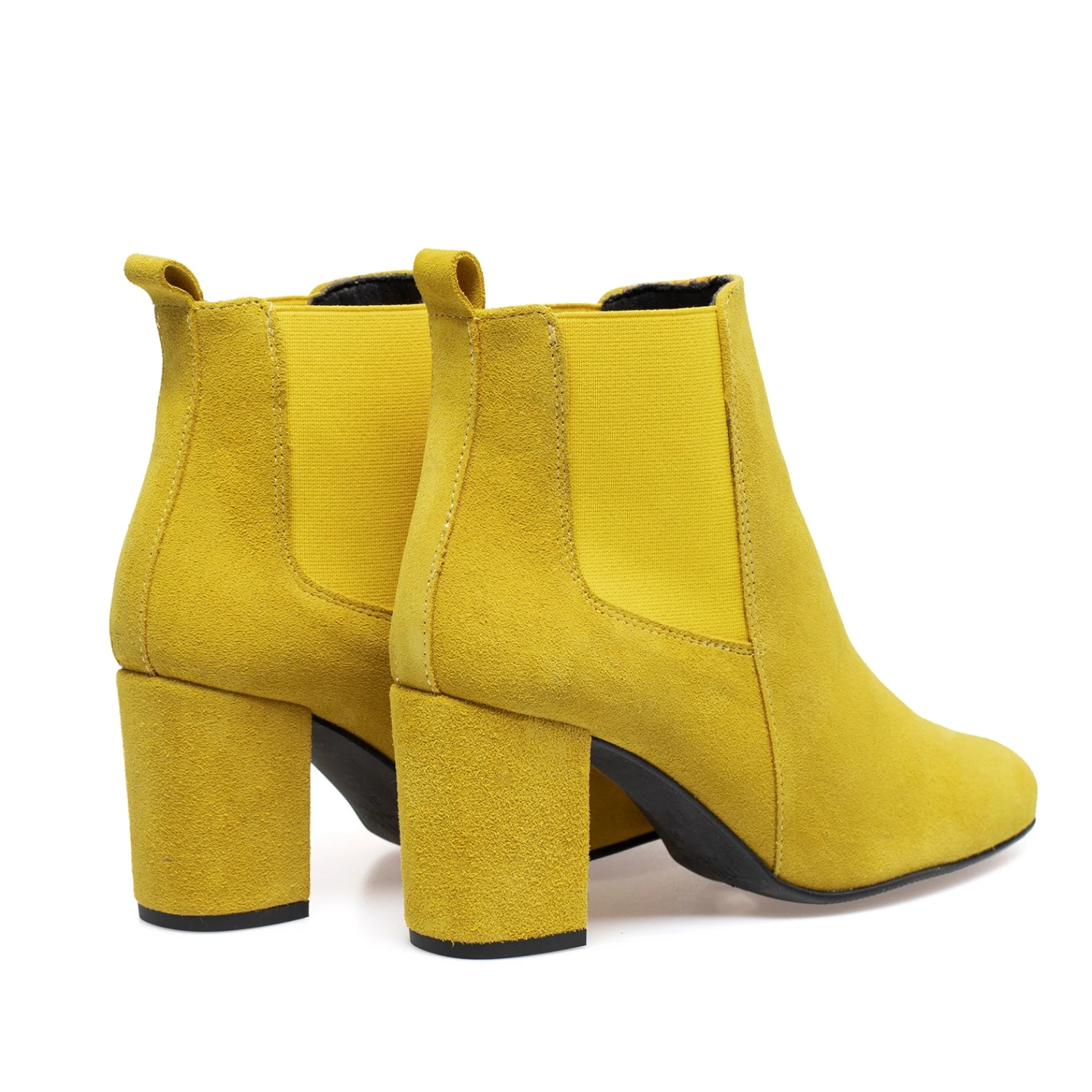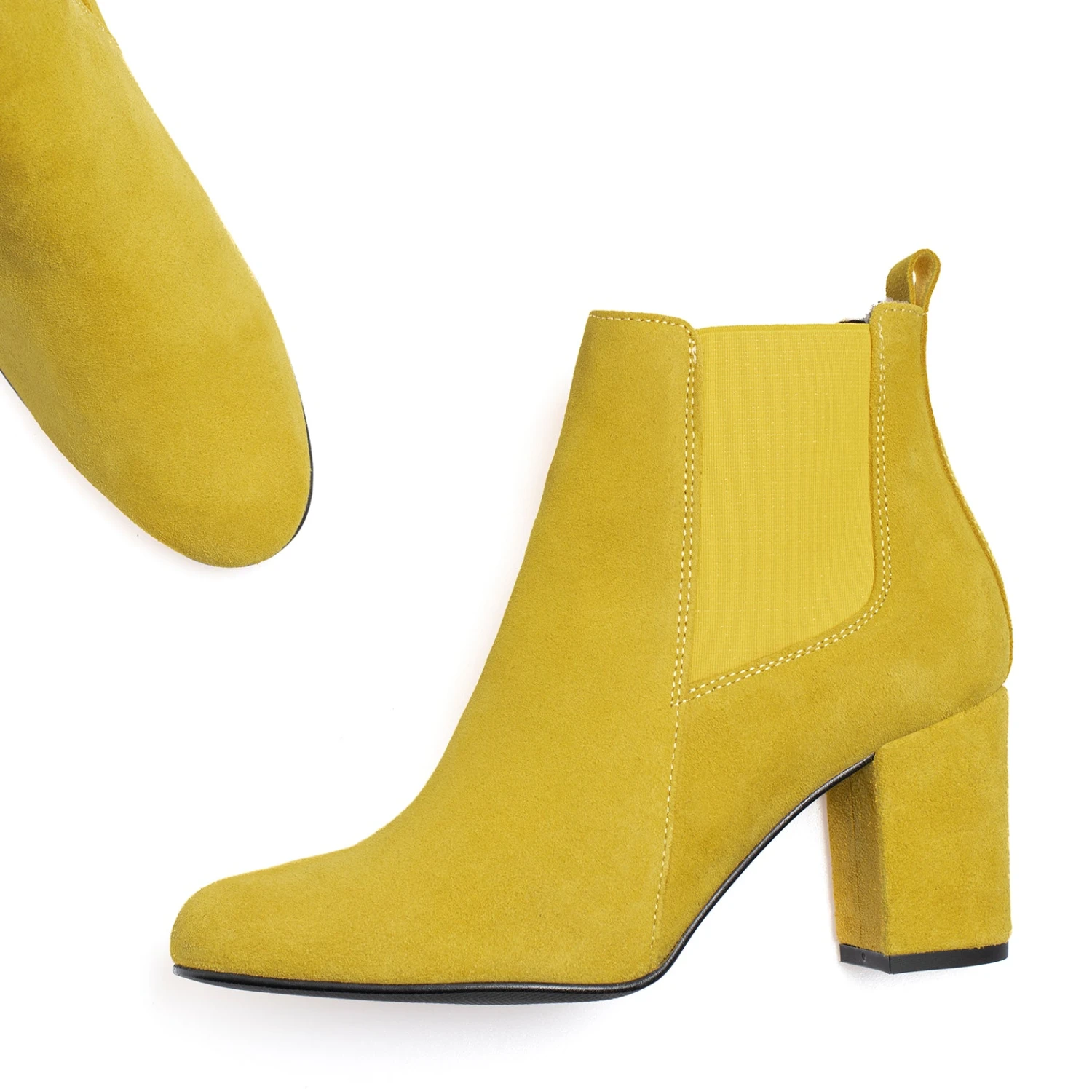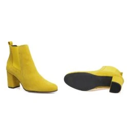 Bottines pour femme Ă talon haut JAUNE en cuir et  fabriquĂ©es en Espagne. Avec une semelle confort gel incorporĂ©e elles seront vos bottines prĂ©fĂ©rĂ©es pour l’automne 2019.Â