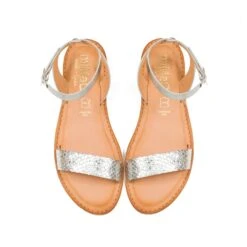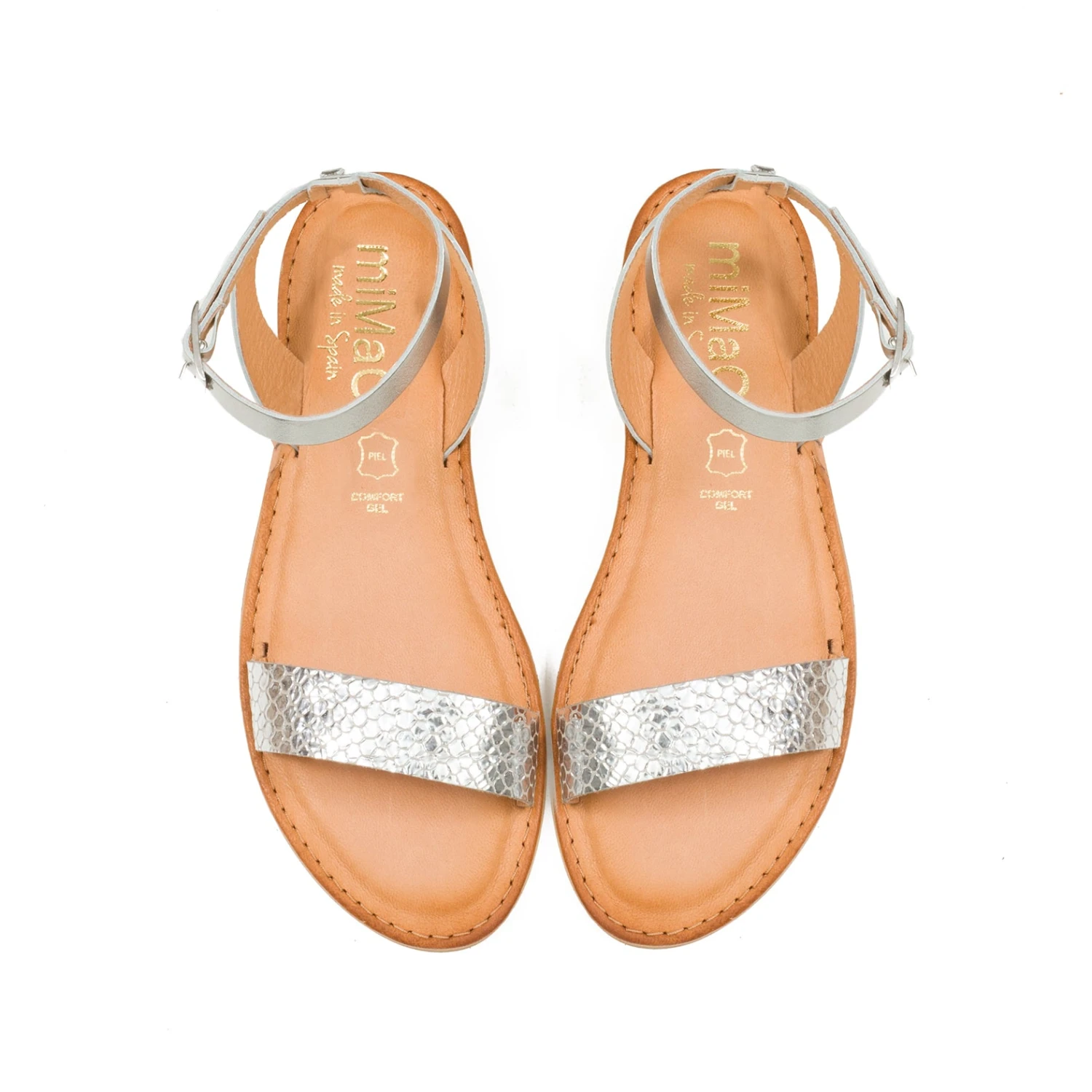 SANDALES PLATES AVEC BRACELET ARGENTĂ POUR FEMME AVEC FERMETURE Ă BOUCLE ET BRIDE Ă Lâ AVANT. SANDALES CONFORTABLES ARGENTĂ EN CUIR AVEC SEMELLE INTĂRIEURE CONFORT GEL. PROFITEZ DE LA QUALITĂ DES CHAUSSURES FABRIQUĂES EN ESPAGNE. COMMANDEZ VOS CHAUSSURES CONFORTABLES EN LIGNE ET RECEVEZ-LES SOUS 2 Ă 4 JOURS OUVRABLES.