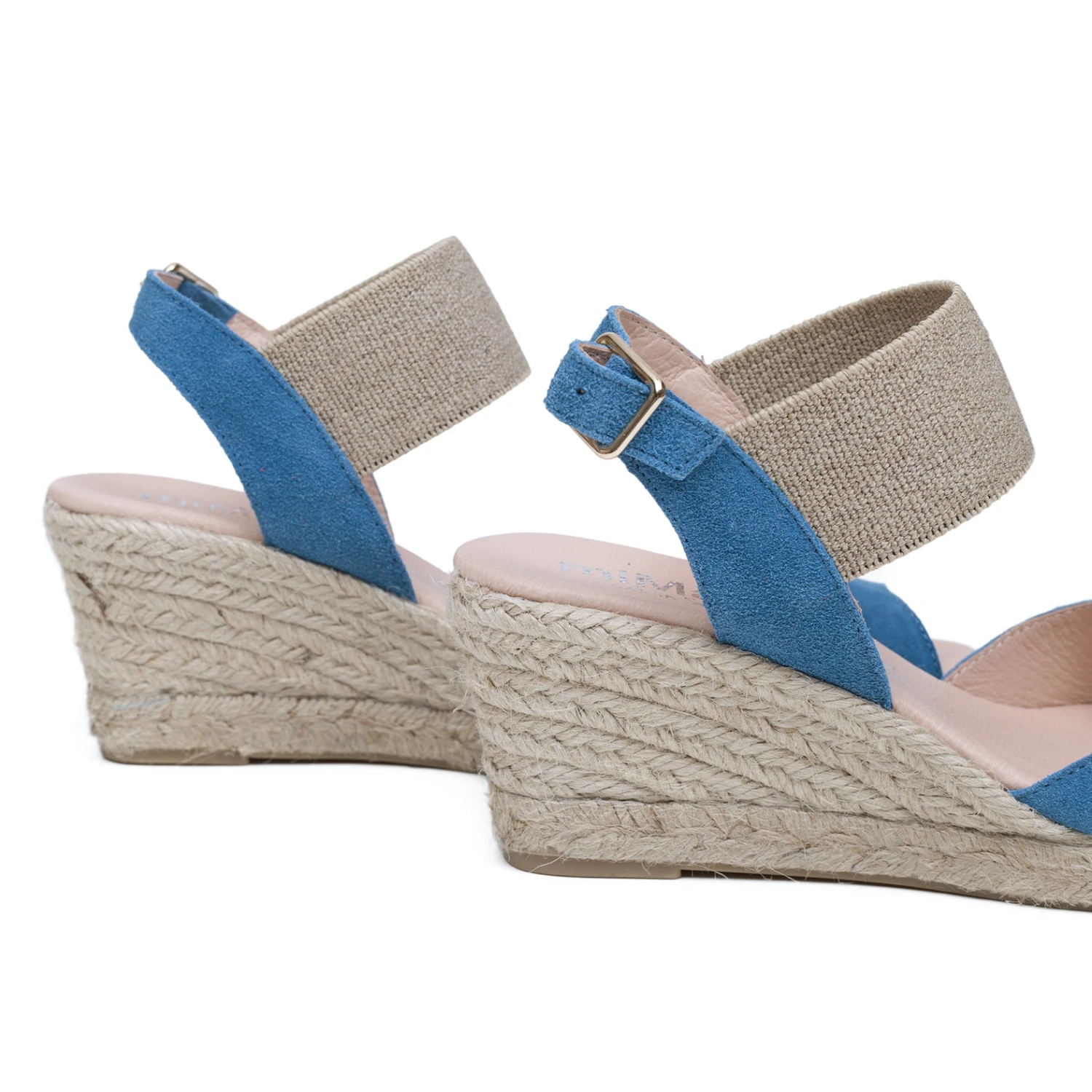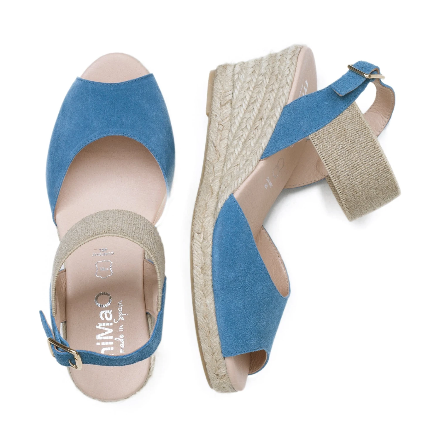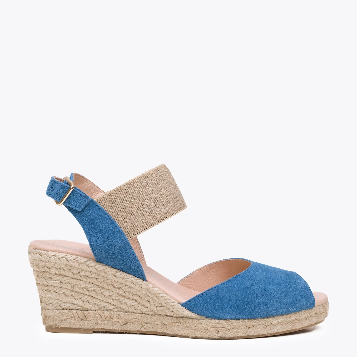 ESPADRILLES COMPENSÉES PEEPTOE BLEU POUR FEMME  TALON DE 7 CM ET PLATEFORME A L’AVANT 1,5 CM, AVEC FERMOIR ÉLASTIQUE ET BOUCLE. BOUT OUVERT. SANDALE A TALON COMPENSÉ CONFORTABLE BLEU EN CUIR NUBUCK  AVEC SEMELLE INTÉRIEURE CONFORT GEL ET SEMELLE EXTÉRIEURE EN CAOUTCHOUC ANTIDÉRAPANTE. DÉCOUVREZ LA QUALITÉ DES CHAUSSURES FABRIQUÉES EN ESPAGNE. COMMANDEZ VOS CHAUSSURES CONFORTABLES ONLINE ET COMBINEZ MODE ET CONFORT POUR VOS PIEDS.