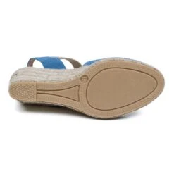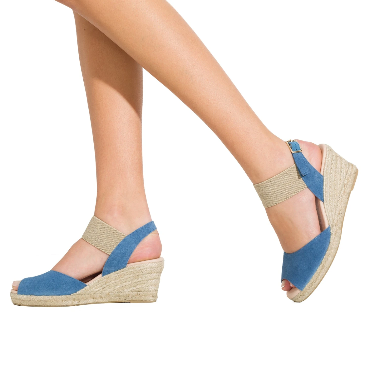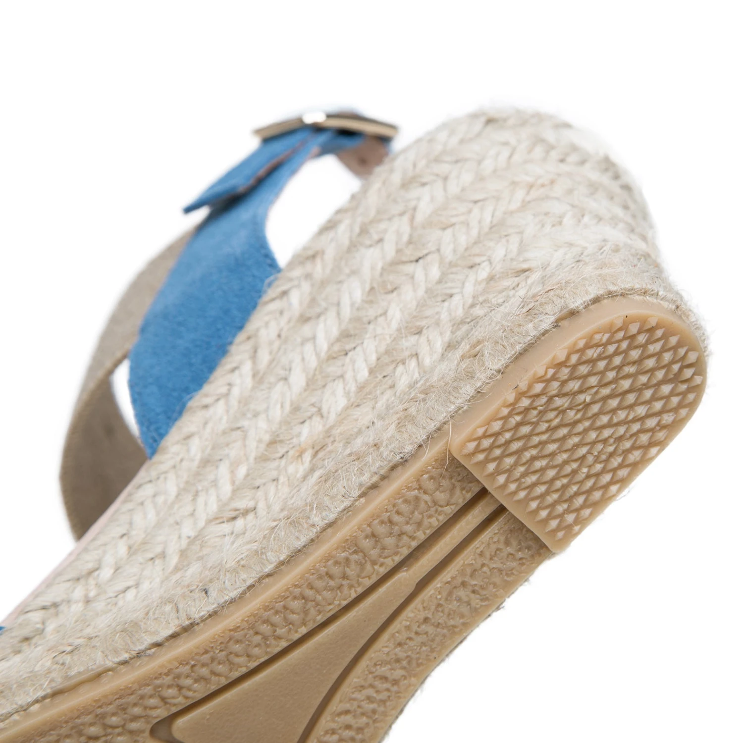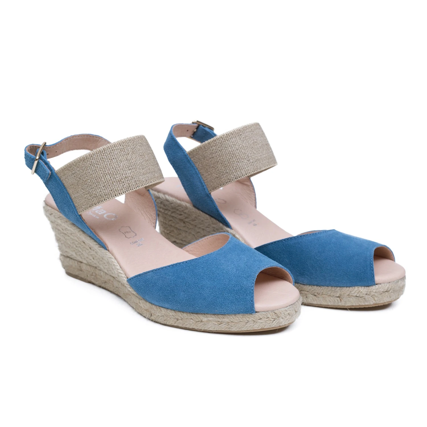 ESPADRILLES COMPENSÉES PEEPTOE BLEU POUR FEMME  TALON DE 7 CM ET PLATEFORME A L’AVANT 1,5 CM, AVEC FERMOIR ÉLASTIQUE ET BOUCLE. BOUT OUVERT. SANDALE A TALON COMPENSÉ CONFORTABLE BLEU EN CUIR NUBUCK  AVEC SEMELLE INTÉRIEURE CONFORT GEL ET SEMELLE EXTÉRIEURE EN CAOUTCHOUC ANTIDÉRAPANTE. DÉCOUVREZ LA QUALITÉ DES CHAUSSURES FABRIQUÉES EN ESPAGNE. COMMANDEZ VOS CHAUSSURES CONFORTABLES ONLINE ET COMBINEZ MODE ET CONFORT POUR VOS PIEDS.