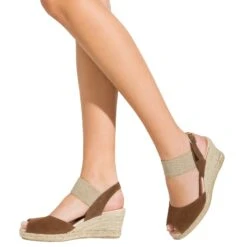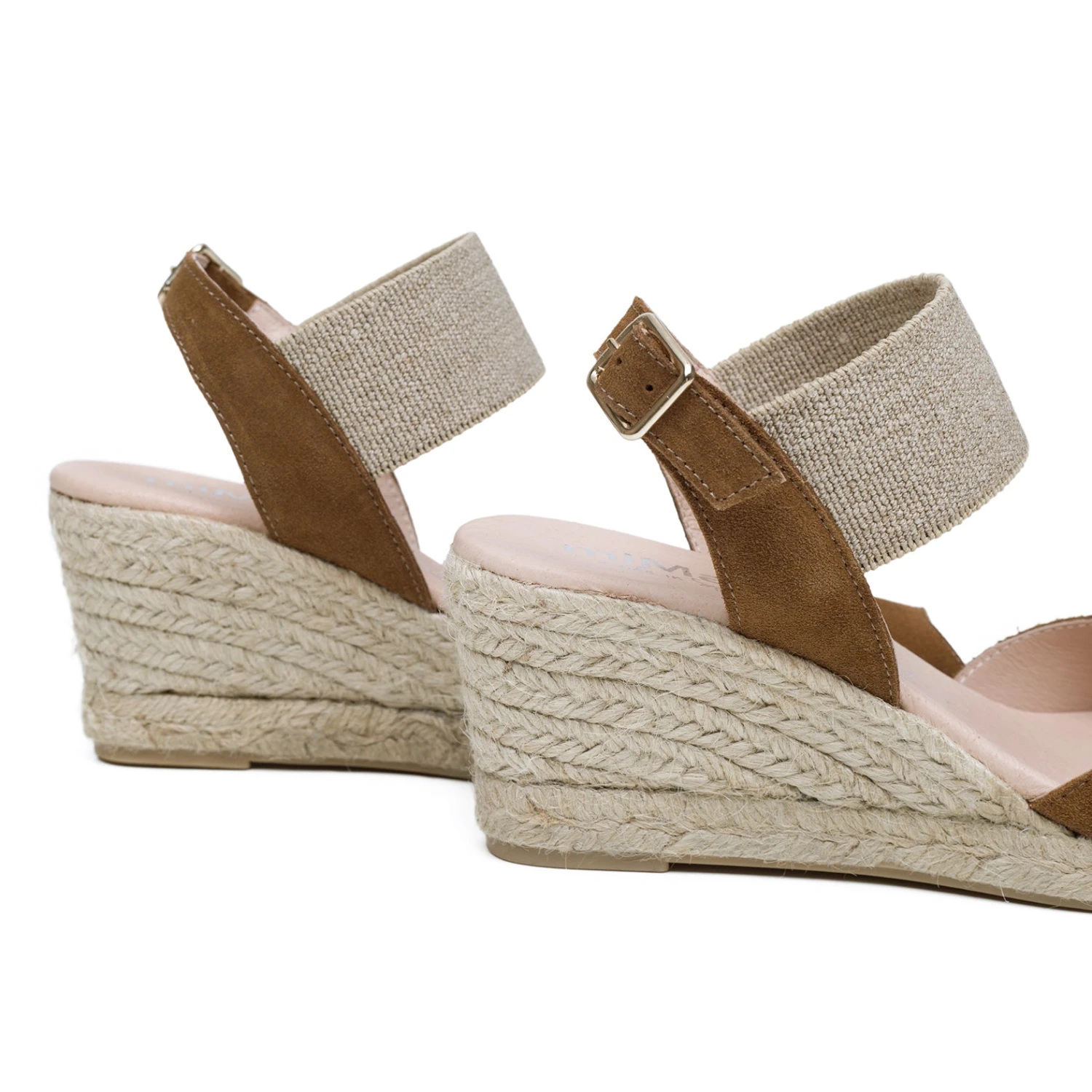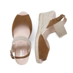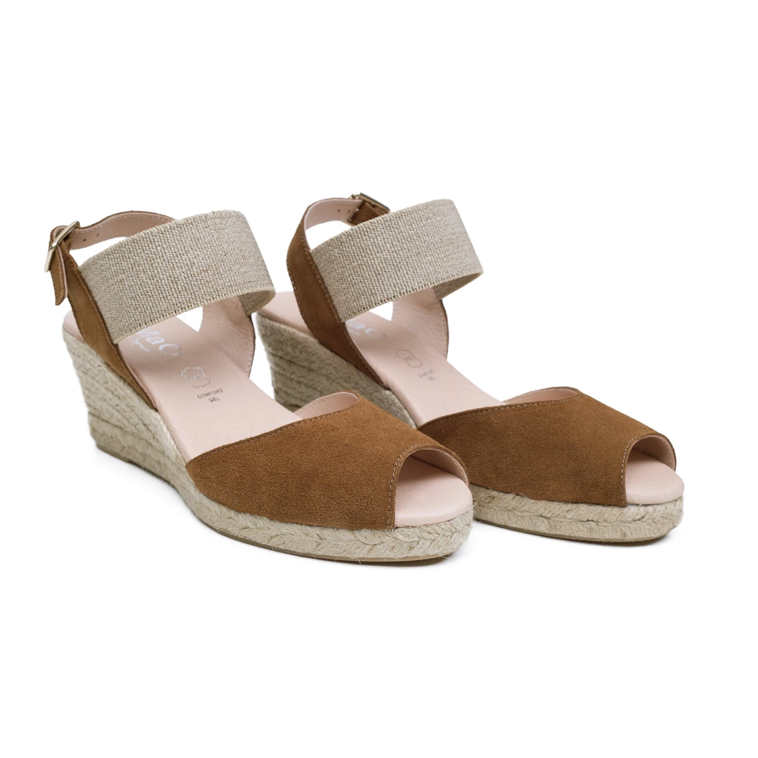 ESPADRILLES COMPENSÉES PEEPTOE CAMEL POUR FEMME  TALON DE 7 CM ET PLATEFORME A L’AVANT 1,5 CM, AVEC FERMOIR ÉLASTIQUE ET BOUCLE. BOUT OUVERT. SANDALE A TALON COMPENSÉ CONFORTABLE CAMEL EN CUIR NUBUCK  AVEC SEMELLE INTÉRIEURE CONFORT GEL ET SEMELLE EXTÉRIEURE EN CAOUTCHOUC ANTIDÉRAPANTE. DÉCOUVREZ LA QUALITÉ DES CHAUSSURES FABRIQUÉES EN ESPAGNE. COMMANDEZ VOS CHAUSSURES CONFORTABLES ONLINE ET COMBINEZ MODE ET CONFORT POUR VOS PIEDS.