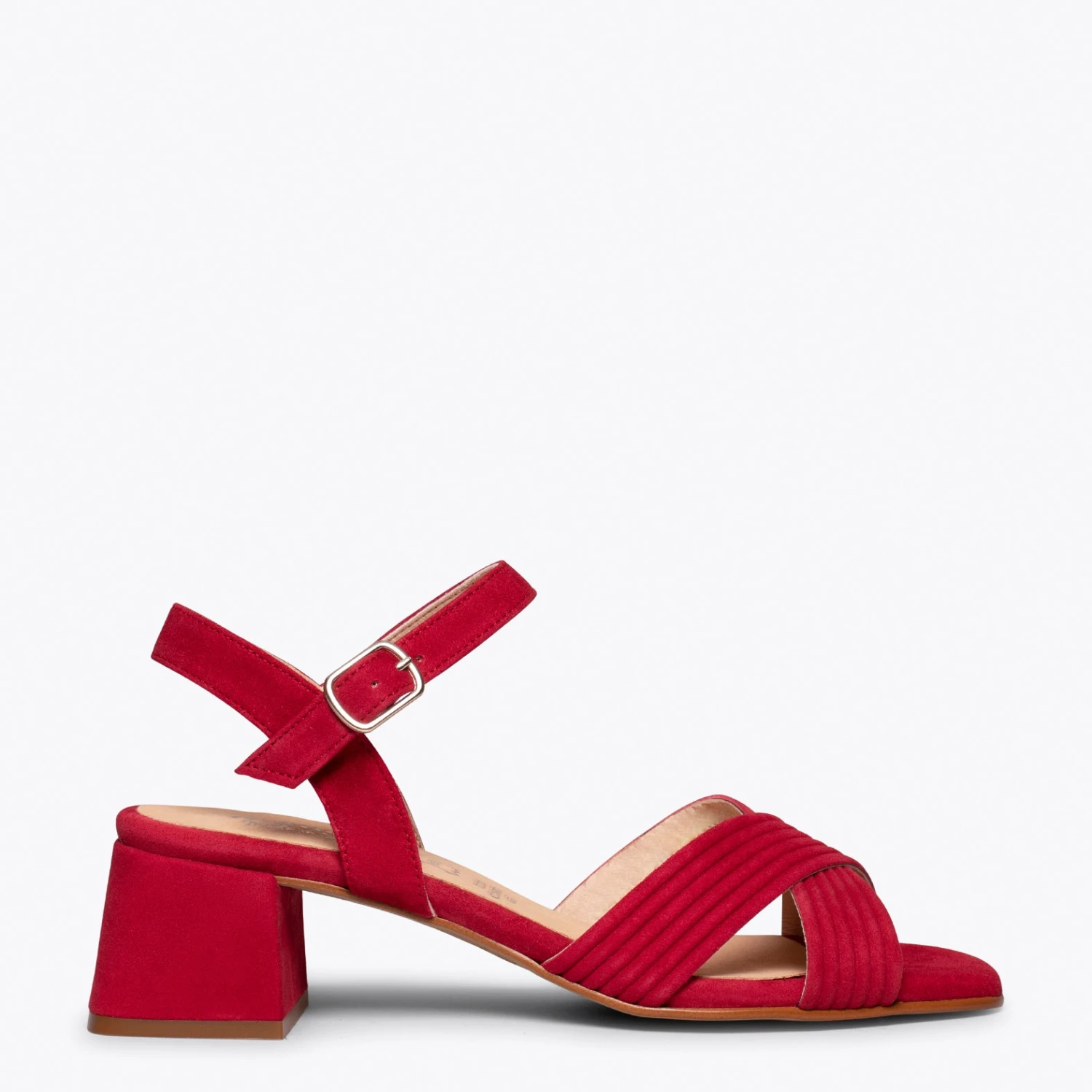 Sandales ROUGE élégantes en cuir daim, avec brides croisées et bout carré. Ce sont des sandales avec un talon moyen épais de 5 cm, une hauteur très abordable pour marcher pendant des heures. De plus, elle intègre la semelle intérieure en cuir Goutte Ultra Confort Gel, ce qui rend les talons confortables. Ces sandales pour femme sont fabriquées en Espagne. Choisissez la qualité d’une chaussure espagnole que vous pouvez acheter en ligne dans notre magasin de chaussures miMaO.