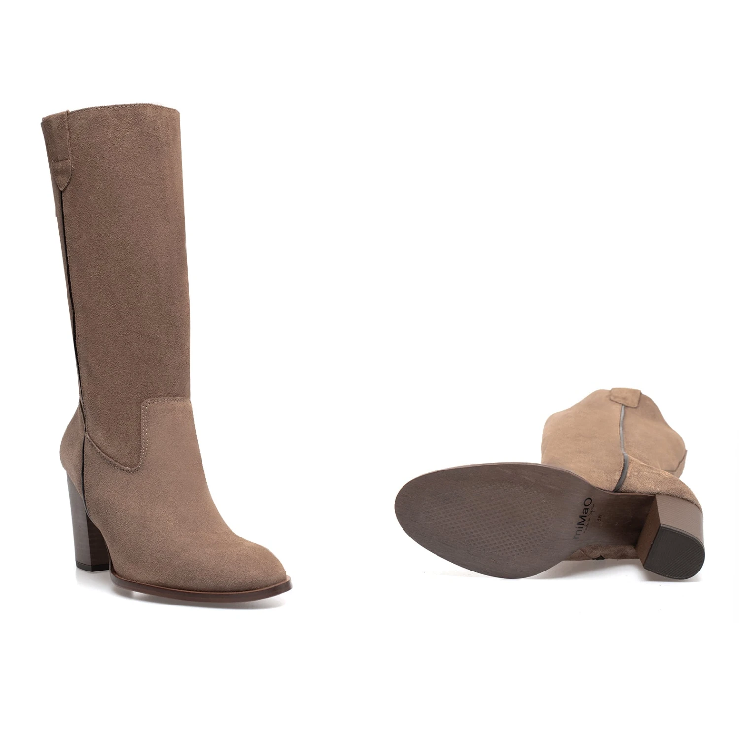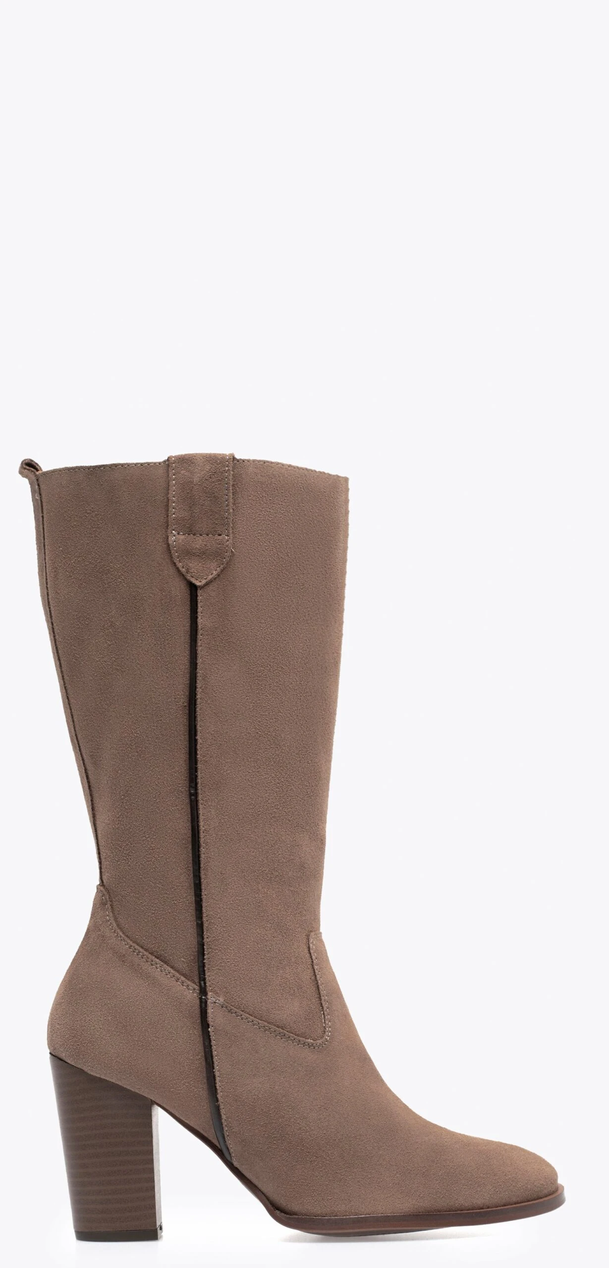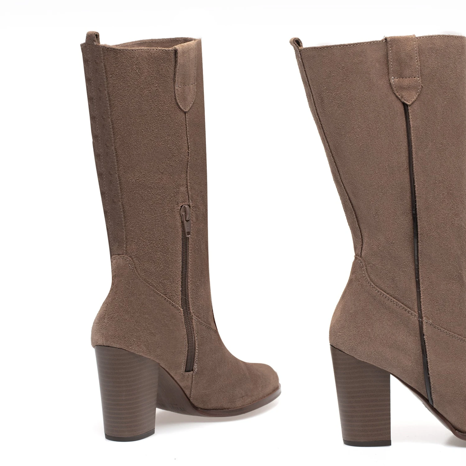 Botte haute TAUPE pour femme avec talonlarge en bois de 8,5 cm et fermeture à glissière intérieure. La tige de cette botte confortable TAUPE vous ira comme un gant. La botte est en cuir nubuck et intègre une semelle intérieure confort gel en cuir. Promenez-vous avec élégance et confort dans vos coins préférés avec cette chaussure en cuir fabriquée en Espagne.