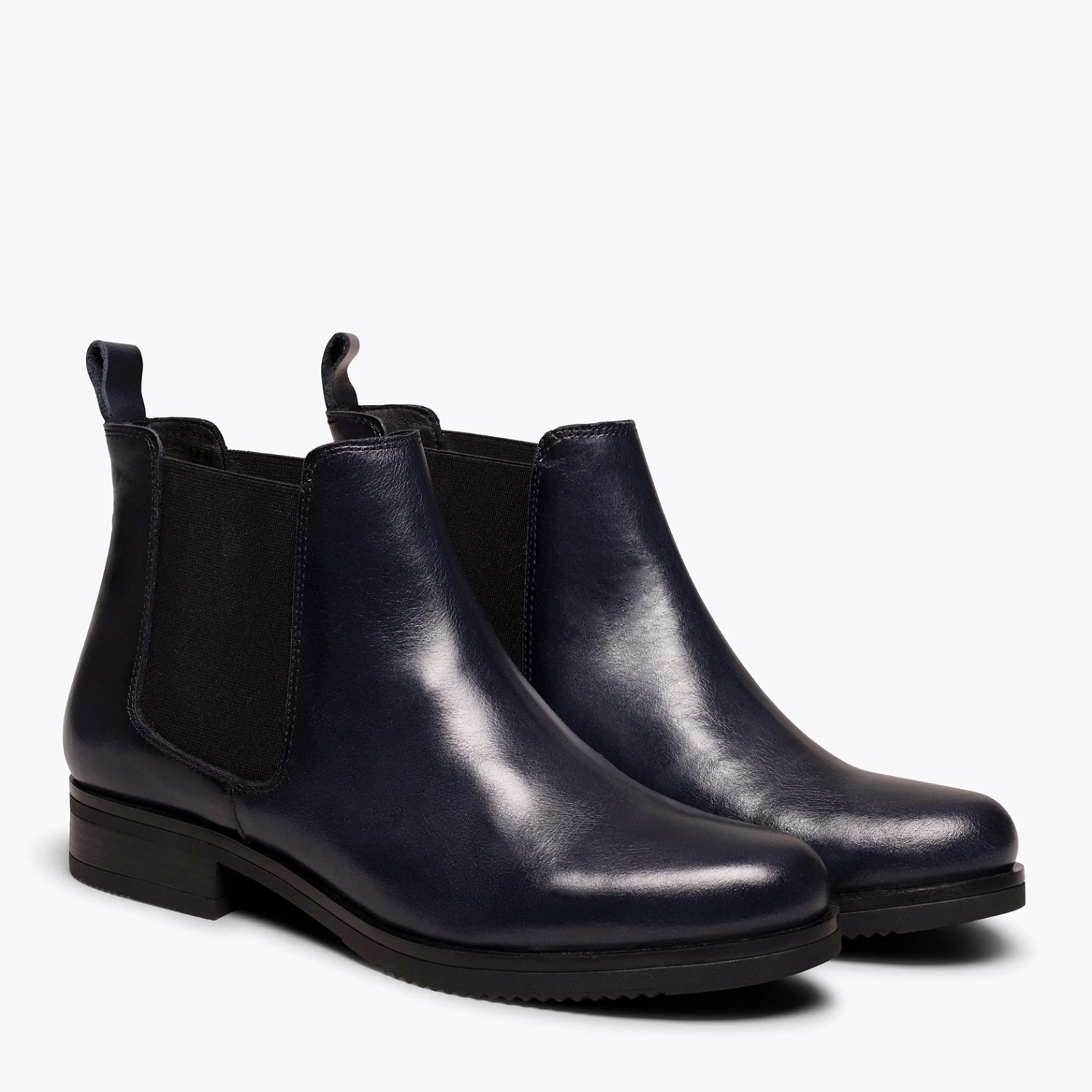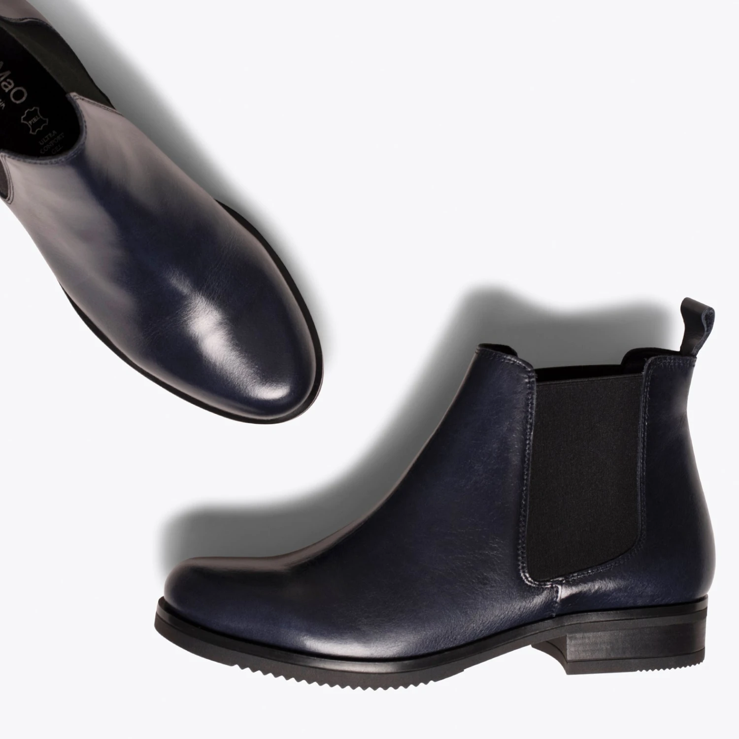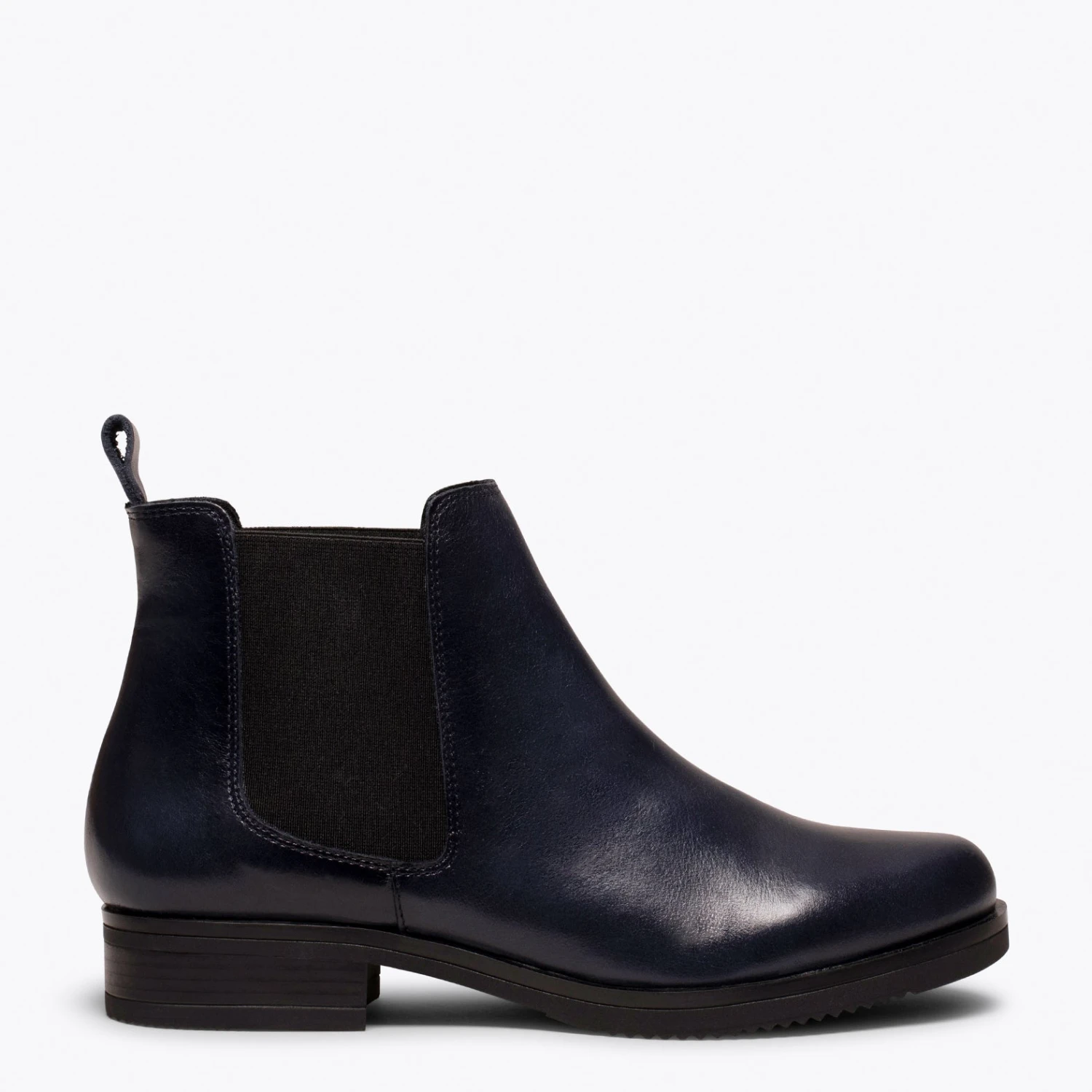 Bottine Chelsea BLEU MARINE en cuir pour femme avec un talon bas de 3 cm et des Ă©lastiques sur les cĂ´tĂ©s. Nous fabriquons des bottines confortables, car elles intègrent des semelles intĂ©rieures en cuir Ultra Confort Gel, garantissant le soin de vos pieds. Marchez pendant des heures en apprĂ©ciant la qualitĂ© d’un produit fabriquĂ© en Espagne. IdĂ©ale pour aller travailler confortablement au quotidien cette saison automne hiver 2020-21.