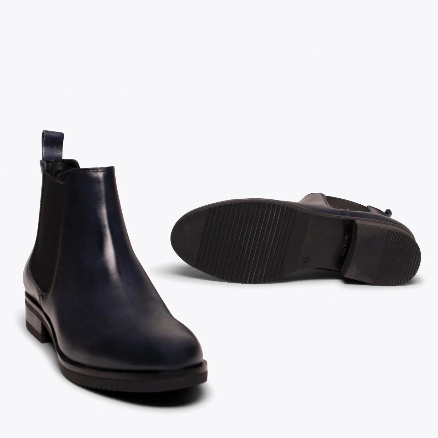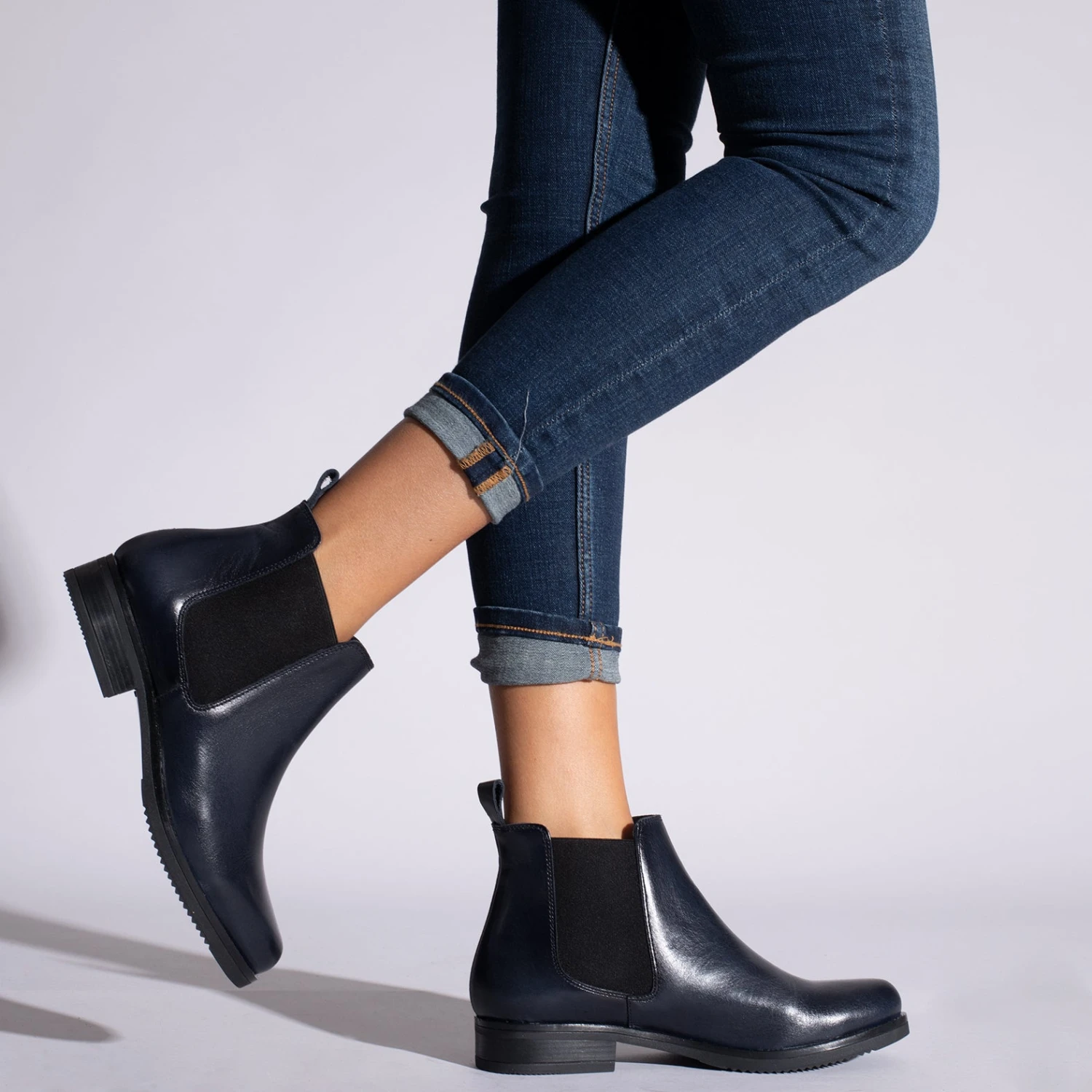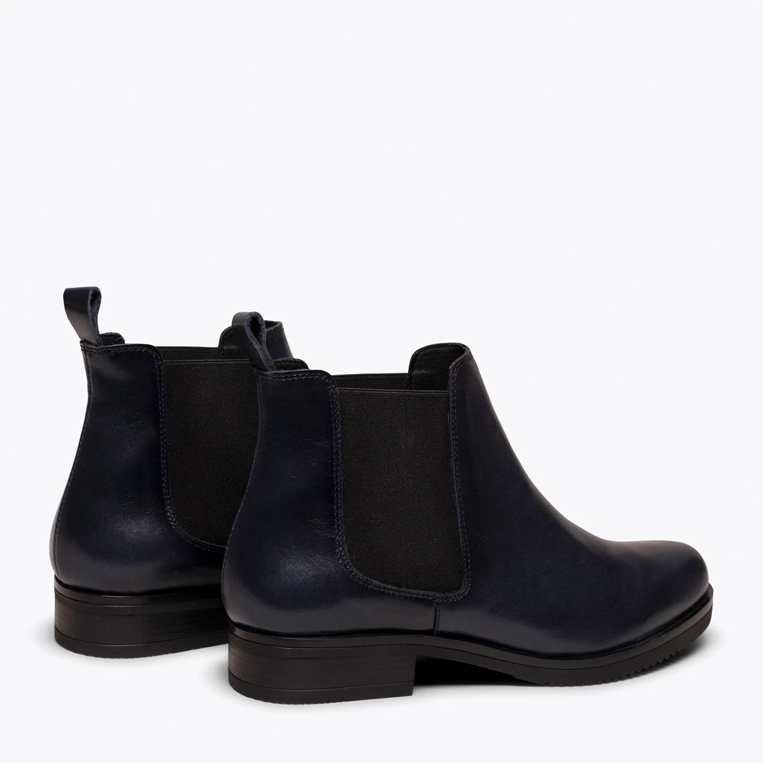 Bottine Chelsea BLEU MARINE en cuir pour femme avec un talon bas de 3 cm et des Ă©lastiques sur les cĂ´tĂ©s. Nous fabriquons des bottines confortables, car elles intègrent des semelles intĂ©rieures en cuir Ultra Confort Gel, garantissant le soin de vos pieds. Marchez pendant des heures en apprĂ©ciant la qualitĂ© d’un produit fabriquĂ© en Espagne. IdĂ©ale pour aller travailler confortablement au quotidien cette saison automne hiver 2020-21.