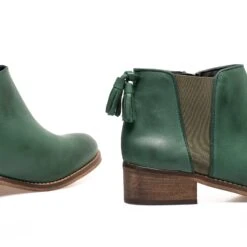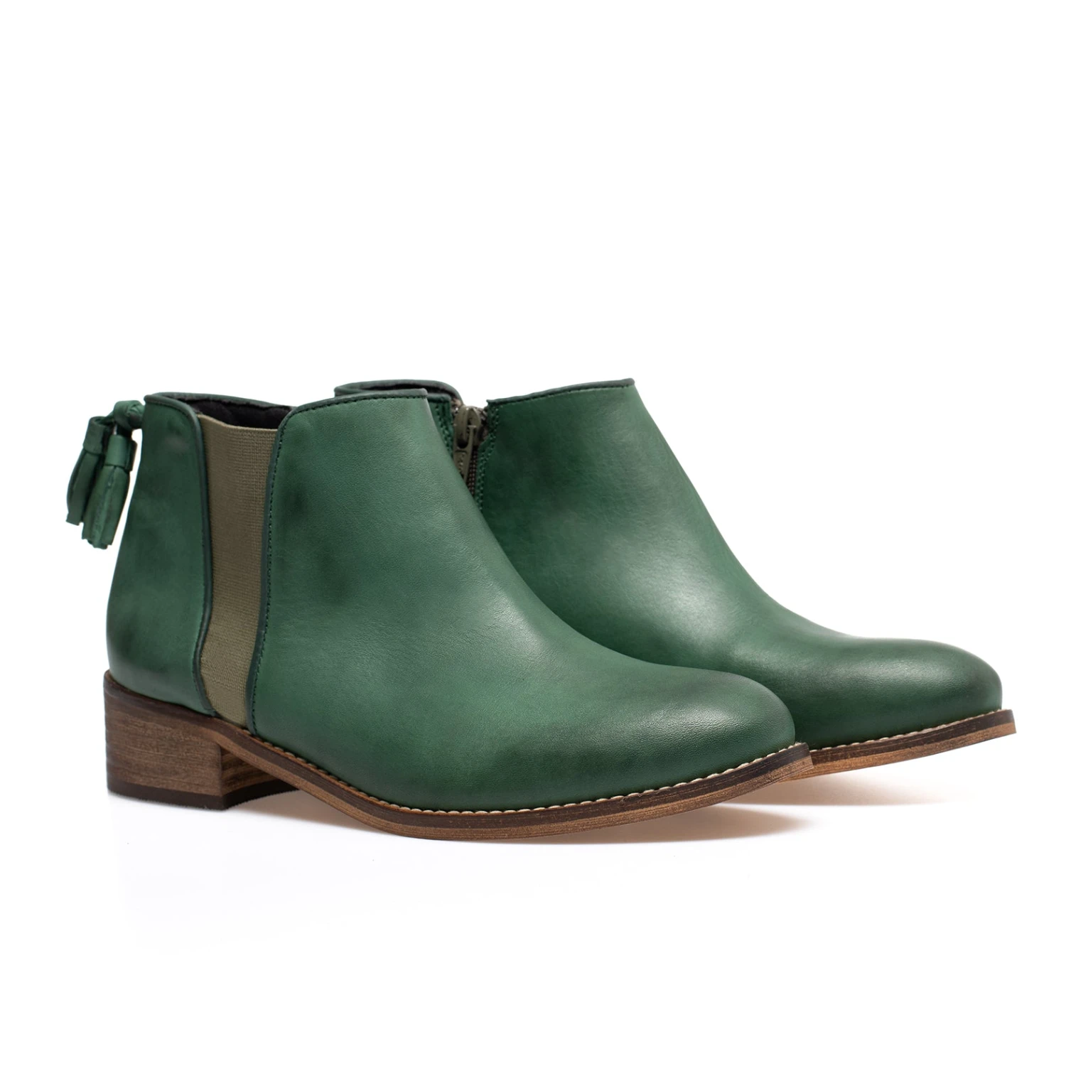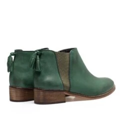 Bottines à talons bas pour femme 100% cuir VERT et fabriquées en Espagne. Avec la semelle intérieure confort gel incorporée elle deviendra votre chaussure préférée cet automne 2019 et le prochain hiver 2020. Bottines VERT avec pompons derrière.