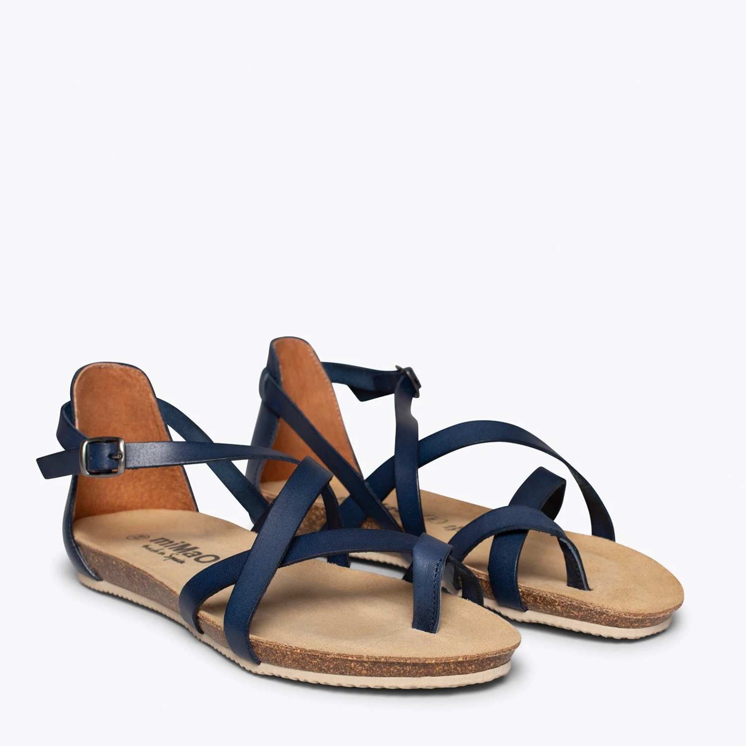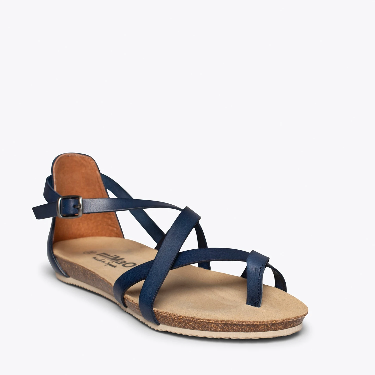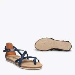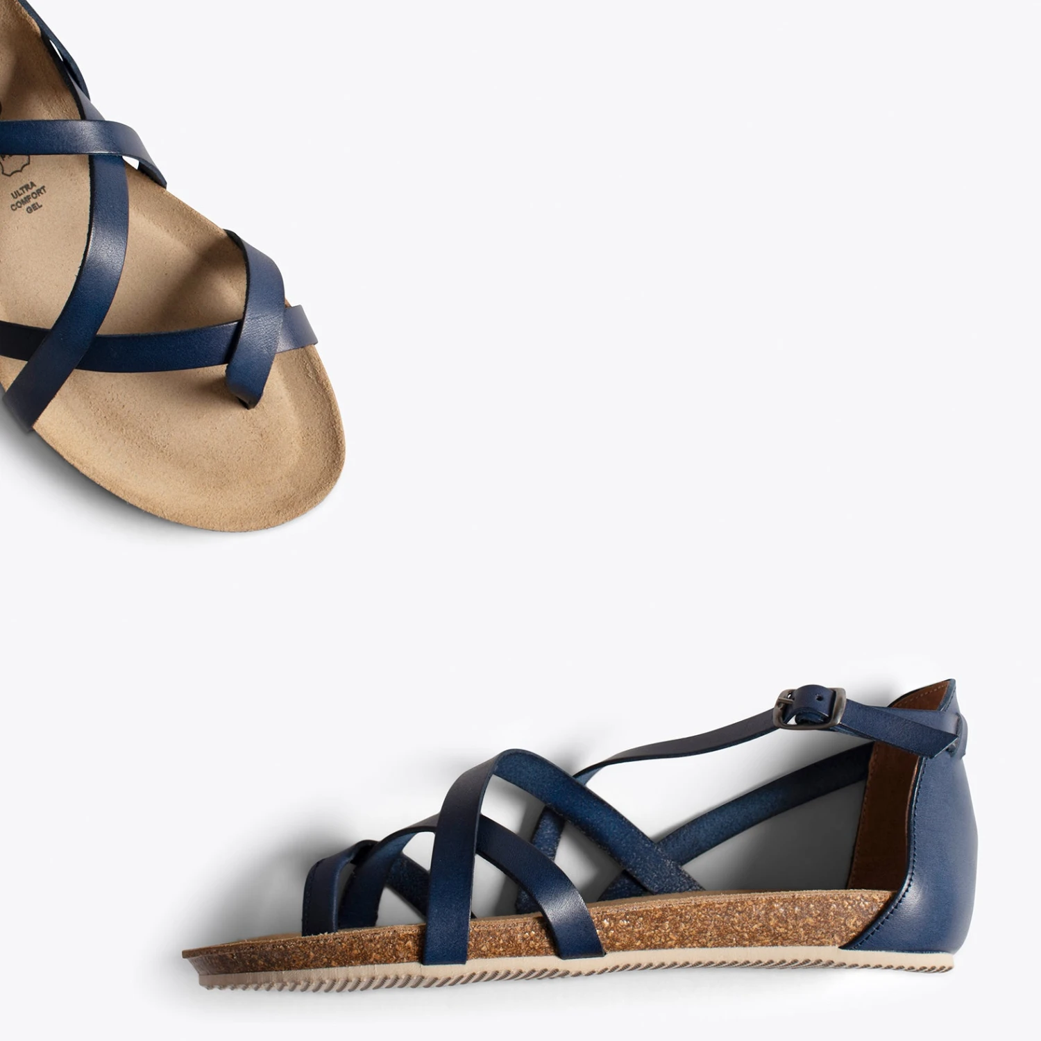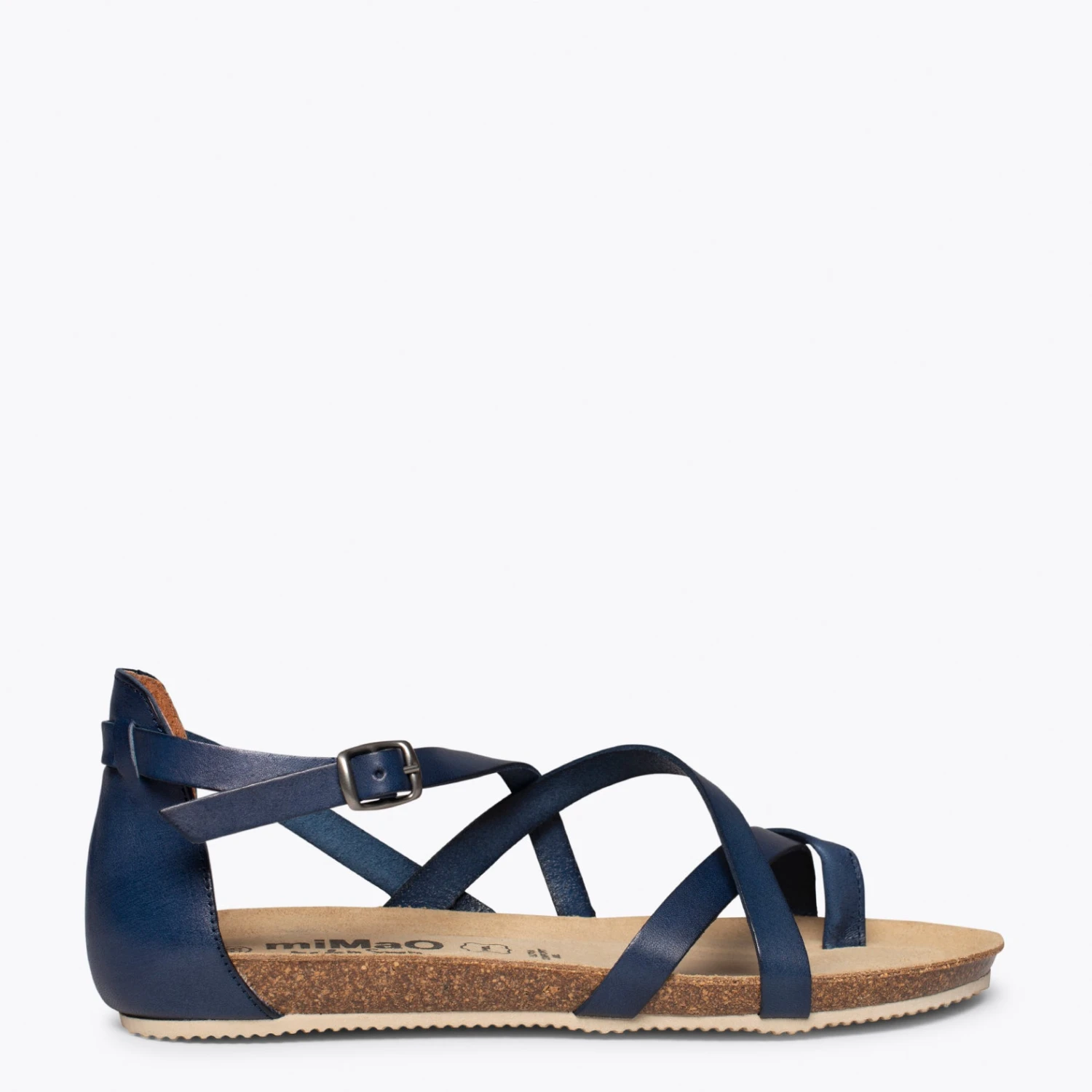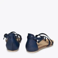 Sandales plates BLEU MARINE pour femme avec semelle extĂ©rieure en liège. Le modèle Chemin est une sandale en cuir vachette avec des brides croisĂ©es façon sandale romaine. La forme des brides offrira tout le soutien dont votre pied a besoin avec en plus le talon et la boucle qui l’accompagne. De plus, ces sandales BIO pour femme ont la semelle intĂ©rieure en cuir Ultra Confort Gel incorporĂ©e, elles deviendront les sandales plates confortables idĂ©ales pour vos looks quotidiens.