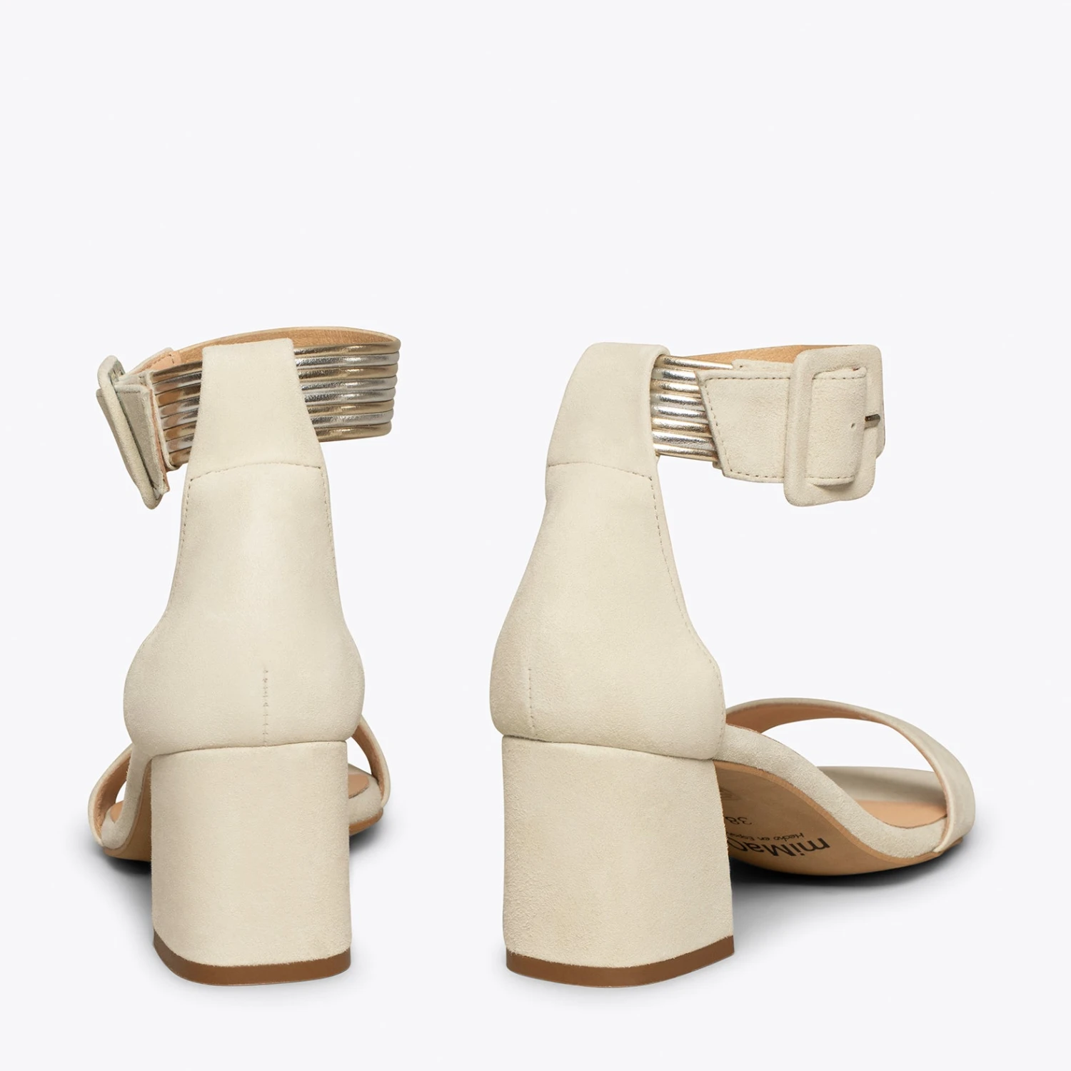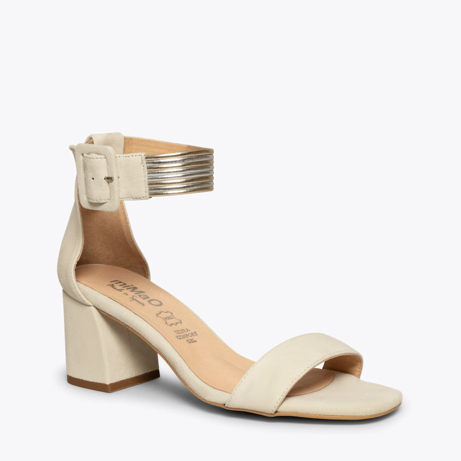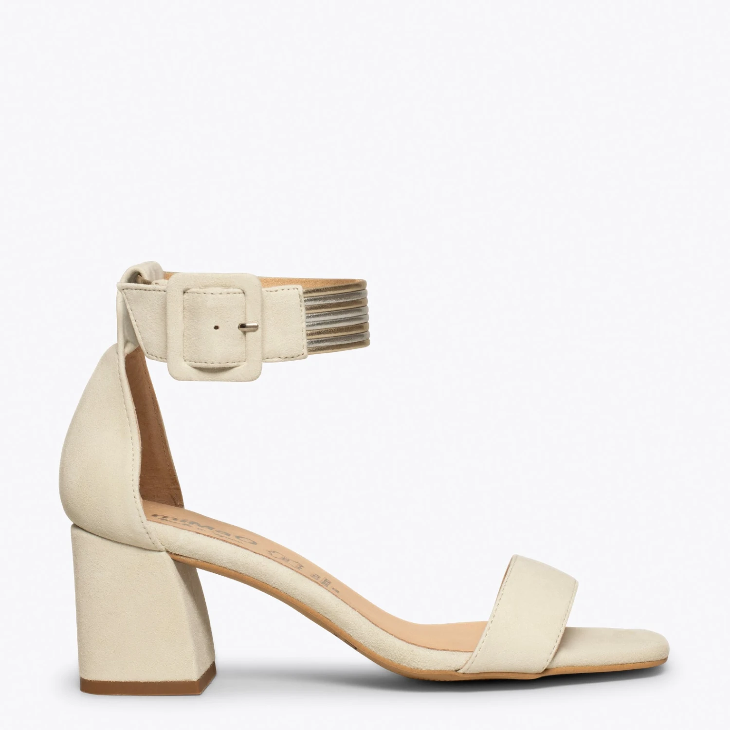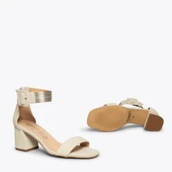 Vous cherchez des sandales élégantes? Nous vous proposons les nouvelles sandales en cuir BEIGE. C’est une sandale BEIGE en daim avec un bracelet de cheville métallique de la même couleur. De plus, ces sandales ont un talon épais de 6,5 cm, ce qui est tendance cette nouvelle saison printemps-été 2021.