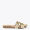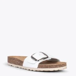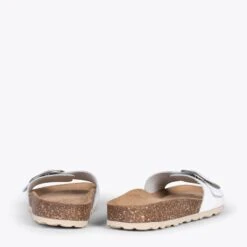 Leur boucle dorĂ©e offre un grand contraste avec la couleur BLANC de la tige. La semelle en EVA, d’une hauteur de 2,5 cm, est un atout supplĂ©mentaire. DĂ©couvrez le confort Ă vos pieds cet Ă©tĂ© 2023!