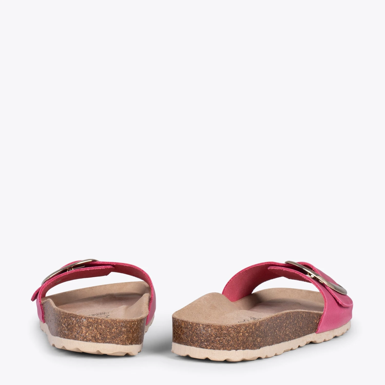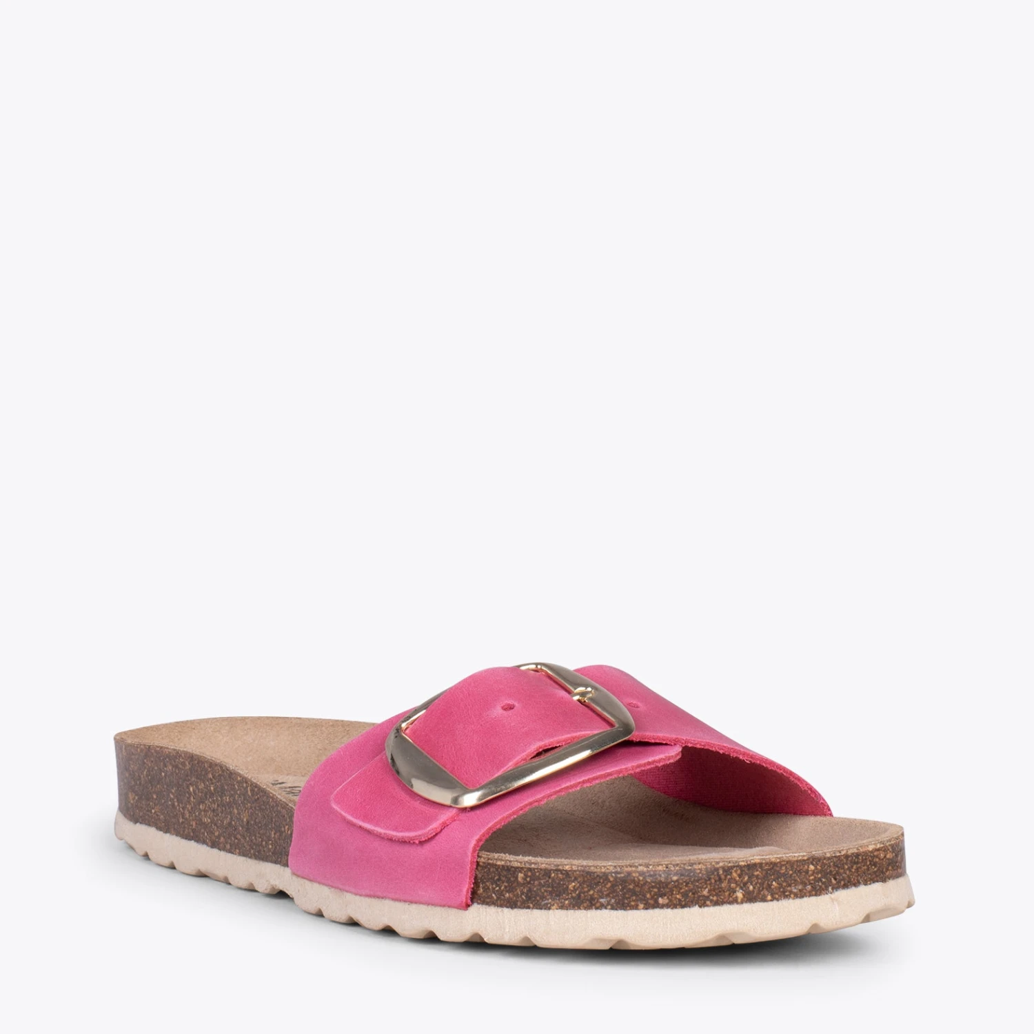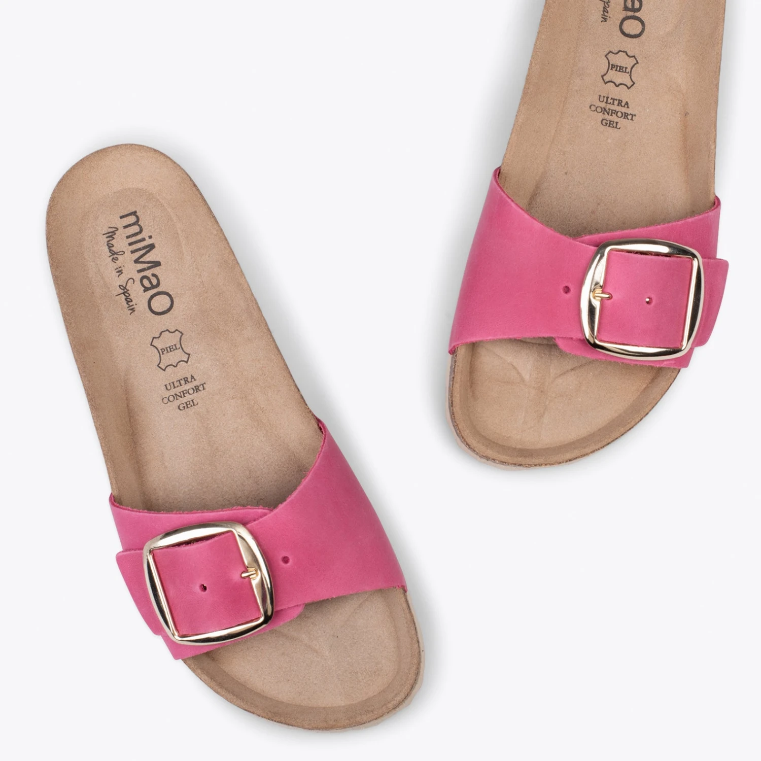 Leur boucle dorĂ©e offre un grand contraste avec la couleur FUCHSIA de la tige. La semelle en EVA, d’une hauteur de 2,5 cm, est un atout supplĂ©mentaire. DĂ©couvrez le confort Ă vos pieds cet Ă©tĂ© 2023!