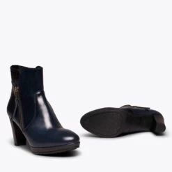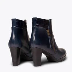 Profitez de tous vos pas avec cette bottine à talon BLEU MARINE. Ce modèle est plein d’ornements: une fermeture à glissière extérieure décorative, un talon haut avec un imprimé bois et une partie imprimé crocodile sur le dessus de la tige. Et si son design ne vous a pas encore fait craquer, son confort le fera. Vous serez le centre de tous les regards et vous marcherez avec élégance et confort pendant des heures.