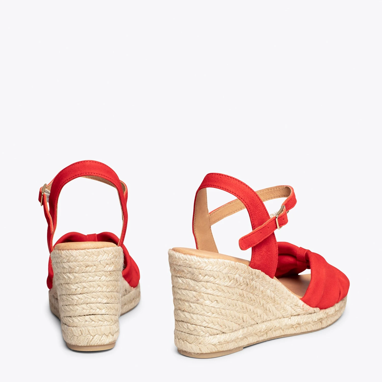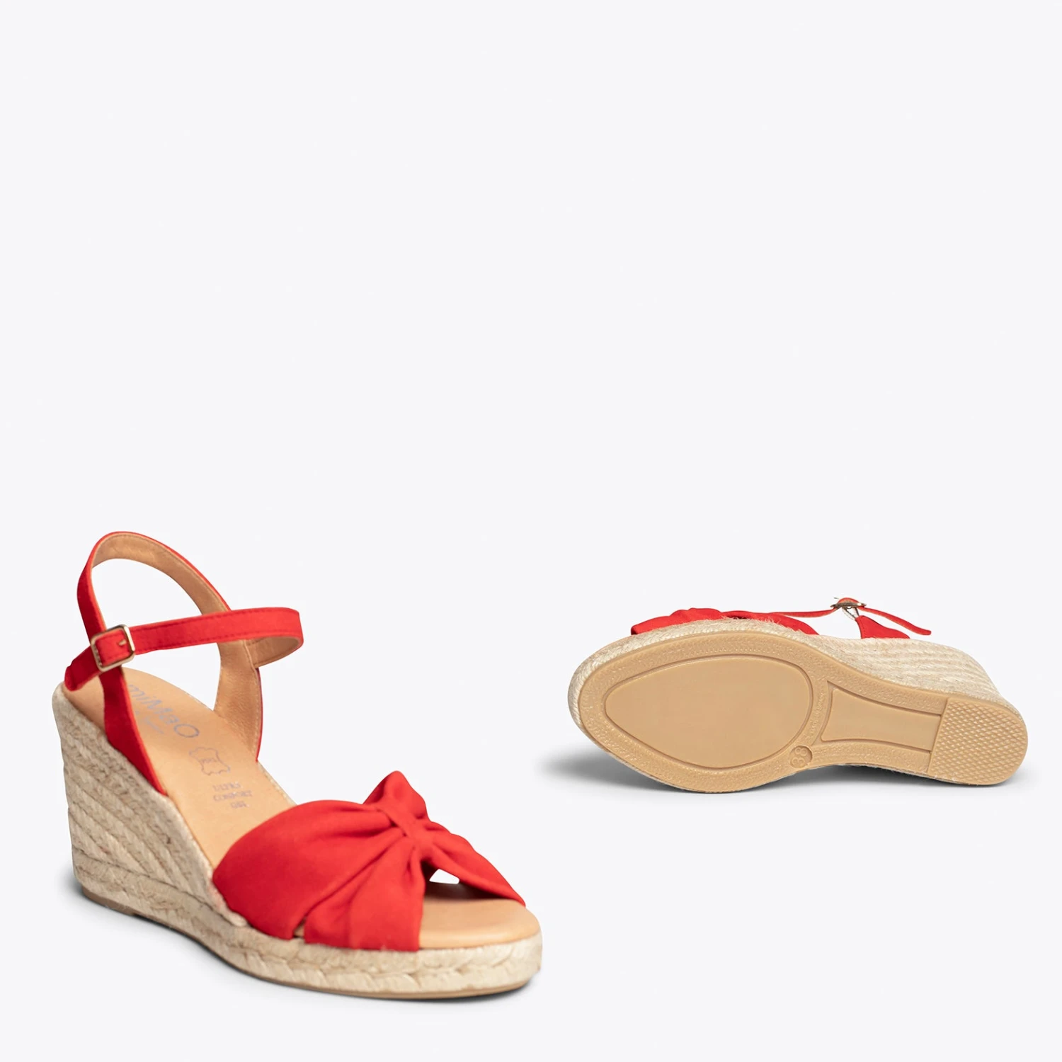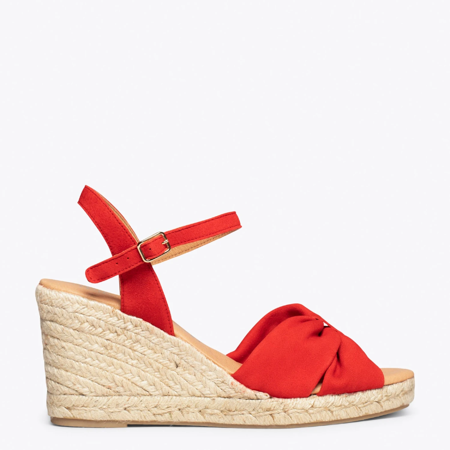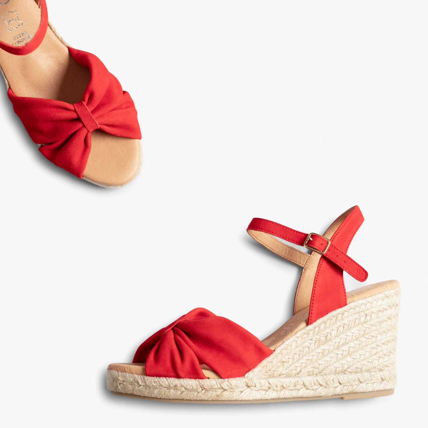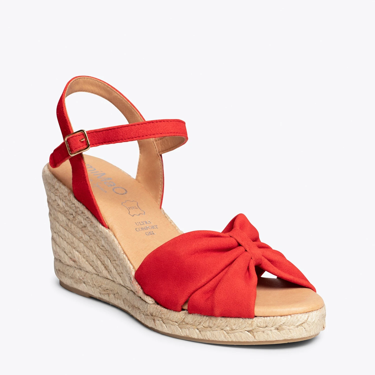 Sandales espadrilles pour femme à talon compensé. Sandales ROUGE en cuir daim, en forme de nœud à l’avant, et le talon compensé a une hauteur de 8,5. De plus, grâce à la plateforme avant de 2 cm et à la semelle intérieure en cuir Goutte Ultra Confort Gel, elles seront vos sandales d’été les plus confortables. Ces sandales à plateforme ROUGE se marieront à merveille avec vos tenues printemps-été 2021.