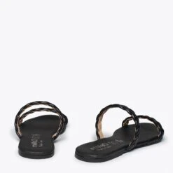Sandales plates NOIR idéales pour combiner avec tous vos looks du quotidien. Sandales plates en cuir nappa avec deux brides tressées qui vous donneront tout le soutien dont vous avez besoin pour marcher. N’ayez pas peur de porter des sandales talon ouvert, car avec notre semelle intérieure en cuir ultra-confort gel, elles deviendront des sandales plates confortables pour marcher sans remarquer que vous les portez.