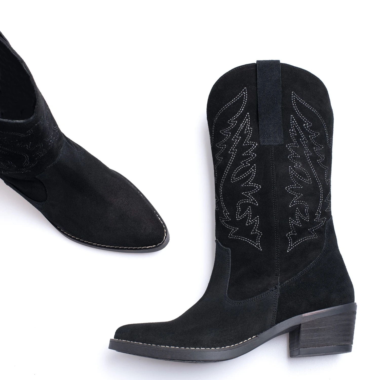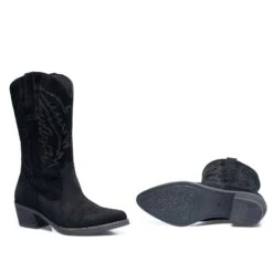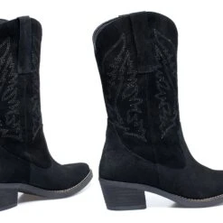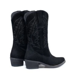 Botte de cow-boy pour femme Ă talon large de 5 cm, bout pointu et tige de 27,5 cm de hauteur avec ornments cousus. Bottes confortables NOIR 100% cuir avec semelle intĂ©rieure confort gel en cuir. Devenez un « shĂ©rif » avec ces bottes fabriquĂ©es en Espagne et complĂštement artisanales.                       Â
