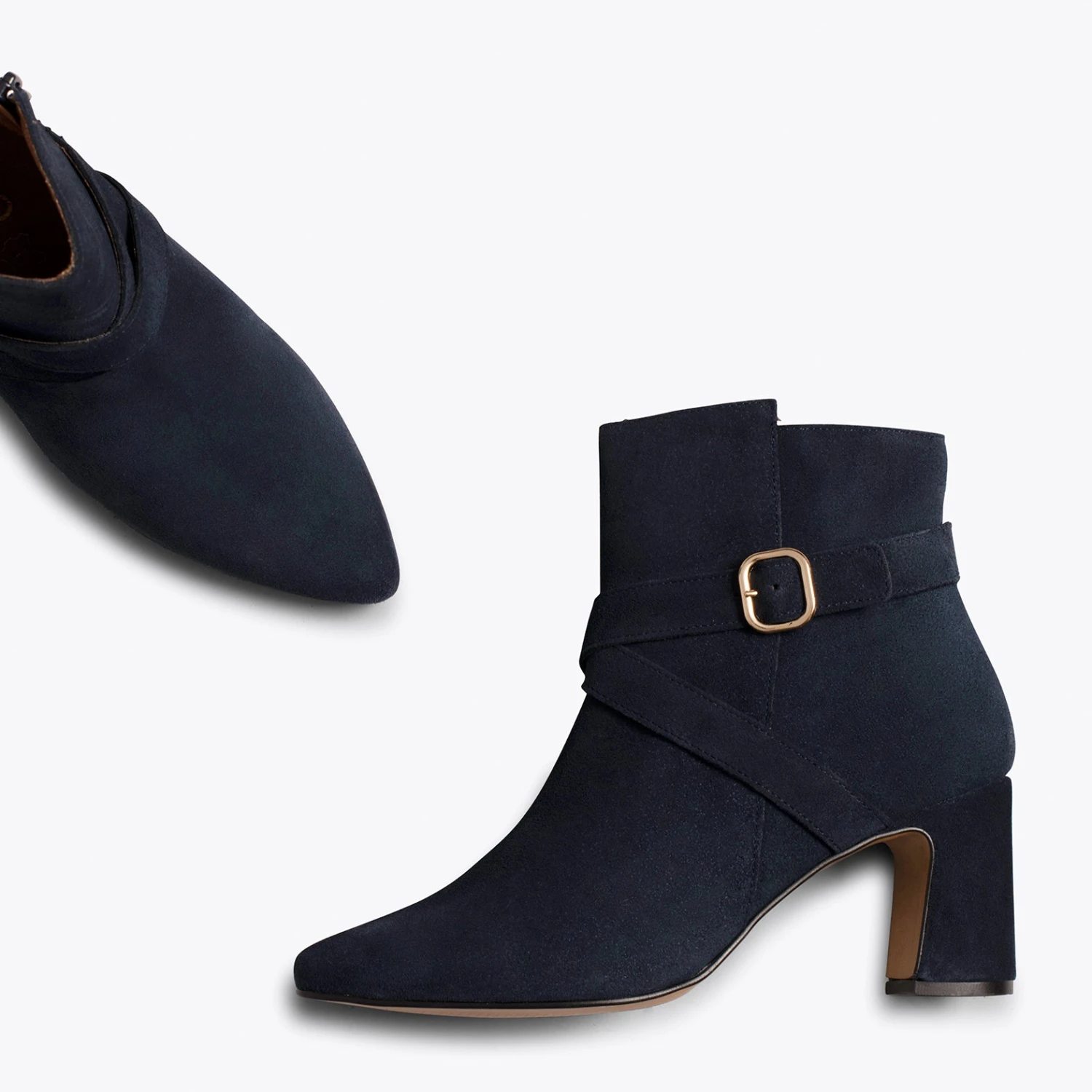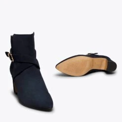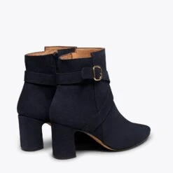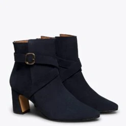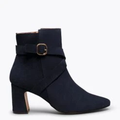 Craquez pour la subtilité de cette bottine en cuir BLEU MARINE. La boucle dorée lui donnera une touche élégante qui transformera une simple bottine en une chaussure parfaite pour vos looks plus habillés. De plus, le talon « patte d’éléphant » est non seulement original, et sera différent de tout le reste des chaussures de votre armoire à chaussures. Il est irrésistible, n’est-ce-pas ?