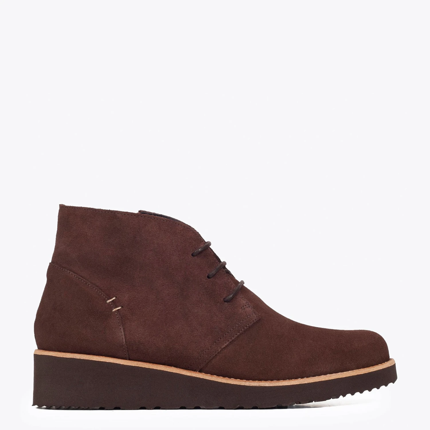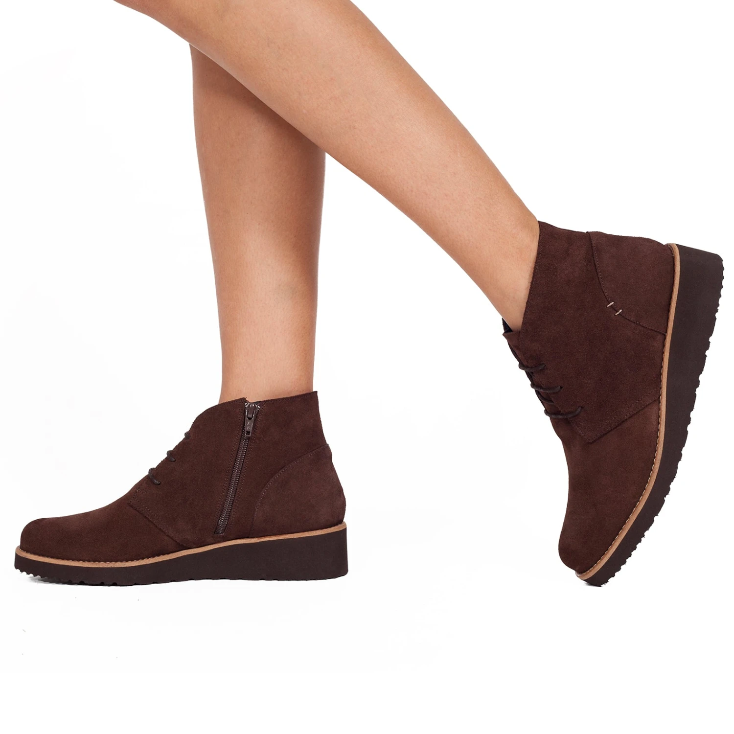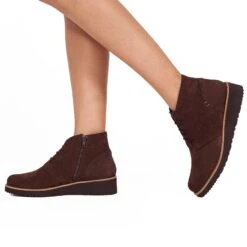 La semelle compensĂ©e de ces boots pour femmes en marron a une hauteur de 4 cm et une plateforme Ă l’avant de 1.5 cm. L’extĂ©rieur est en cuir et la doublure est en tissu. De plus, il a une semelle intĂ©rieure memory foam intĂ©grĂ©e. La couleur de ces boots est marron, marron foncĂ©, marron chocolat.
