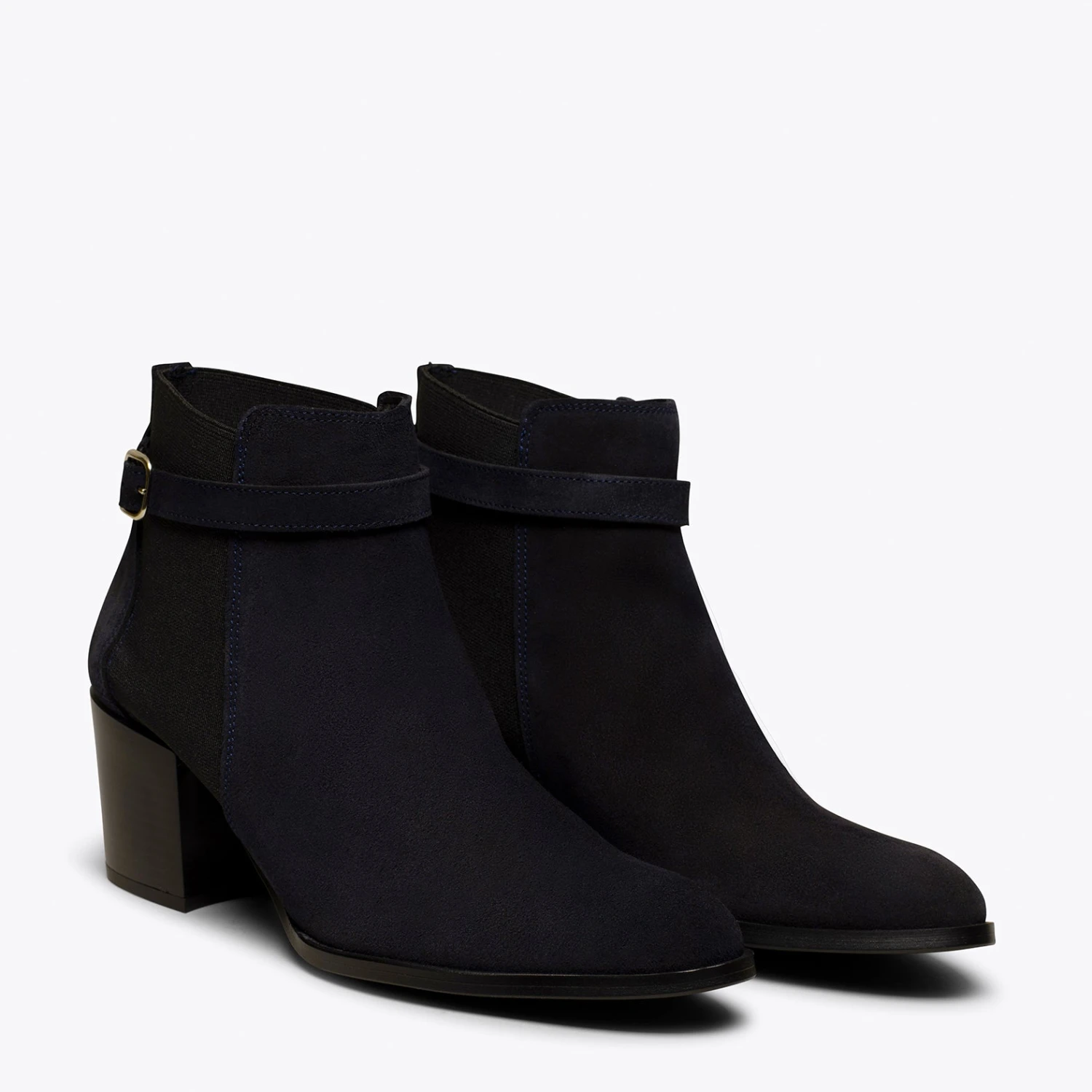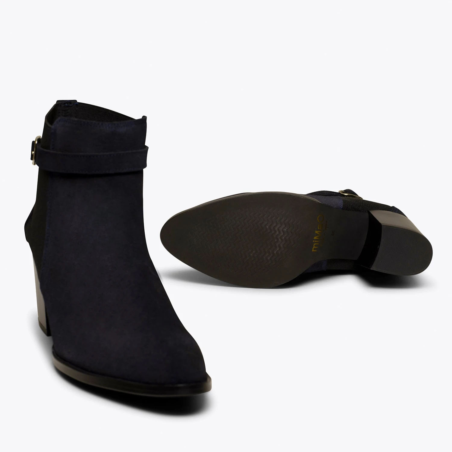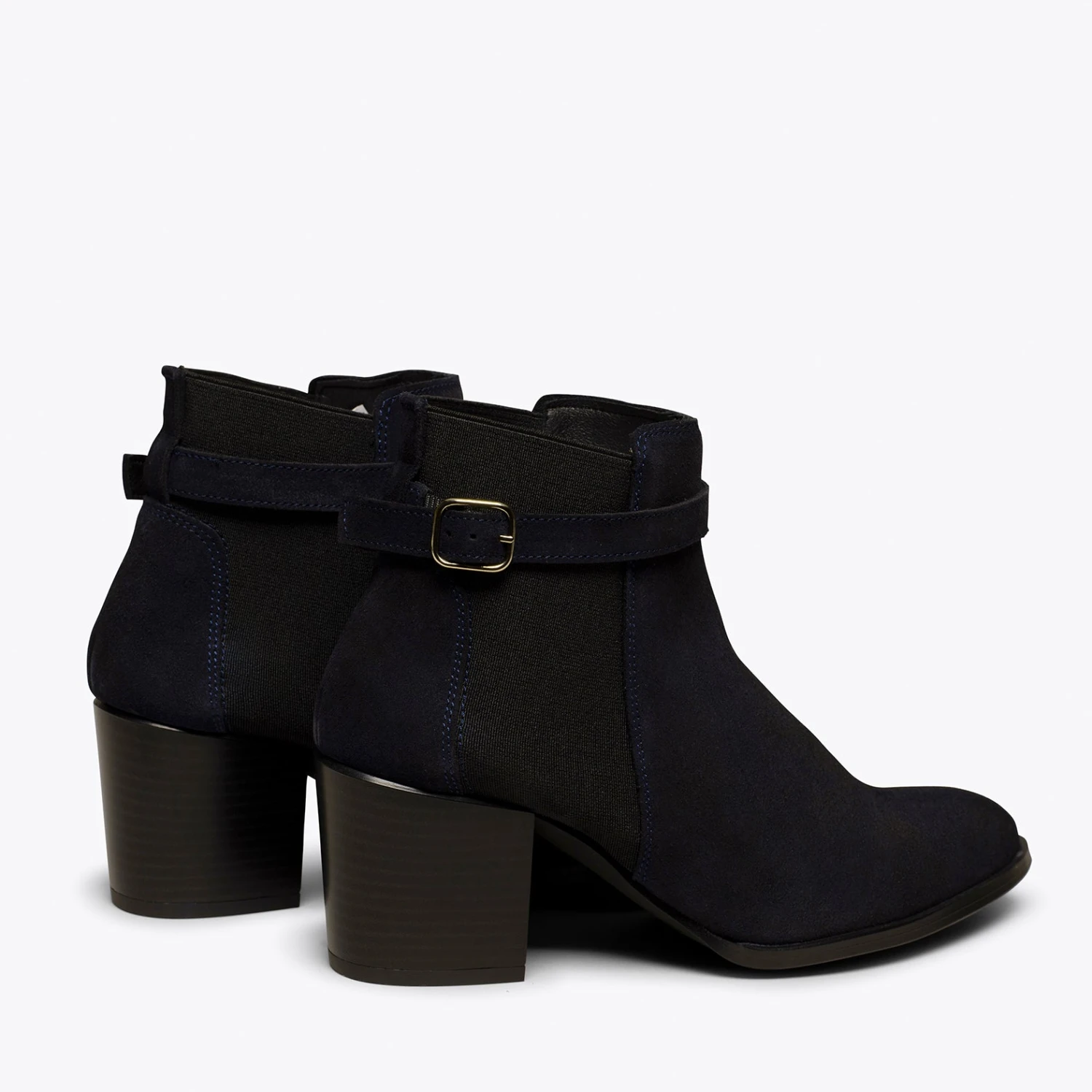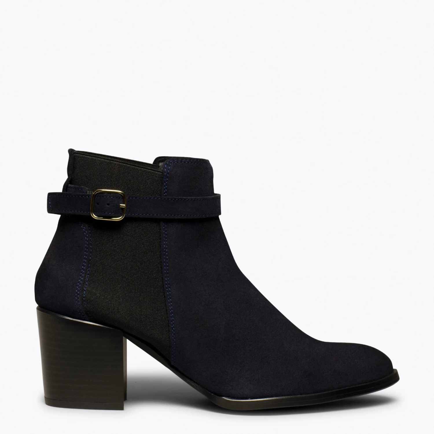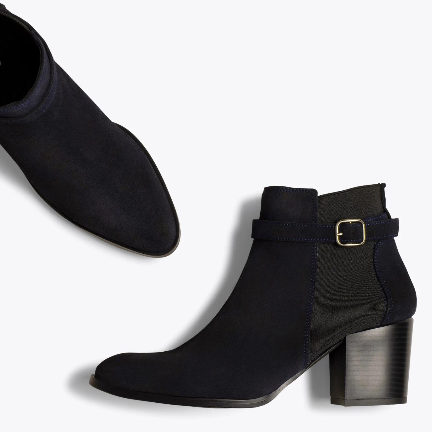 Que recherchez-vous d’abord dans une chaussure? Qu’elle soit confortable? Qu’elle soit coloré? Qu’elle soit à la mode? Eh bien, ne cherchez plus, car cette bottine en cuir BLEU MARINE vous offrira toutes ces qualités. Vous marcherez très confortablement grâce à son talon de 6,5 cm de large, ses élastiques qui le rendront parfaitement adaptable et gràce à sa semelle intérieure en gel ultra-confort. Vous pouvez choisir entre six couleurs différentes qui se marieront parfaitement avec vos looks d’automne et, bien sûr, vous ferez des envieuses.