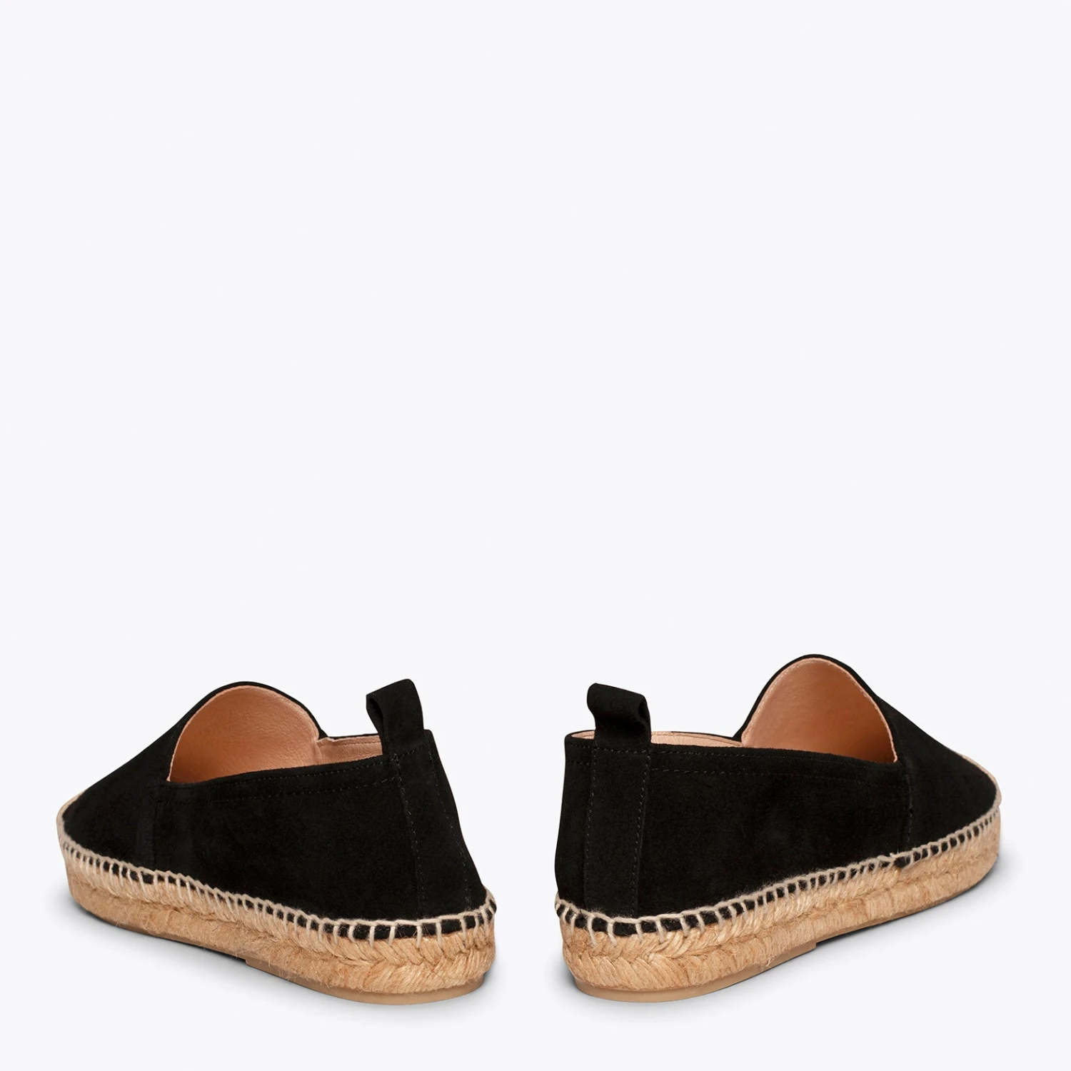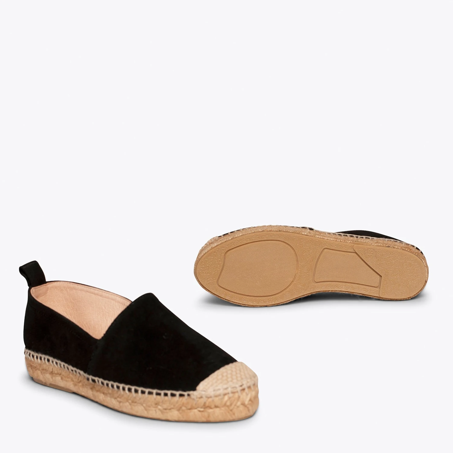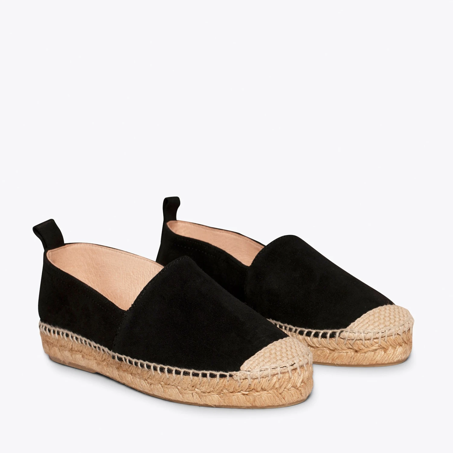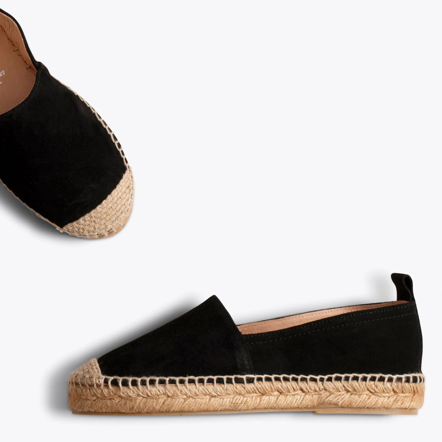 La chaussure espadrille NOIR que vous devez toujours avoir dans votre armoire Ă chaussures. C’est une chaussure intemporelle. Nos espadrilles sont en cuir nubuck et intègrent la semelle intĂ©rieure en cuir Ultra Confort Gel, ce qui en fait des chaussures plates confortables. Portez-la comme une chaussure espadrille ou pliez la partie arrière du talon pour porter votre espadrille comme une sandale talon ouvert.
