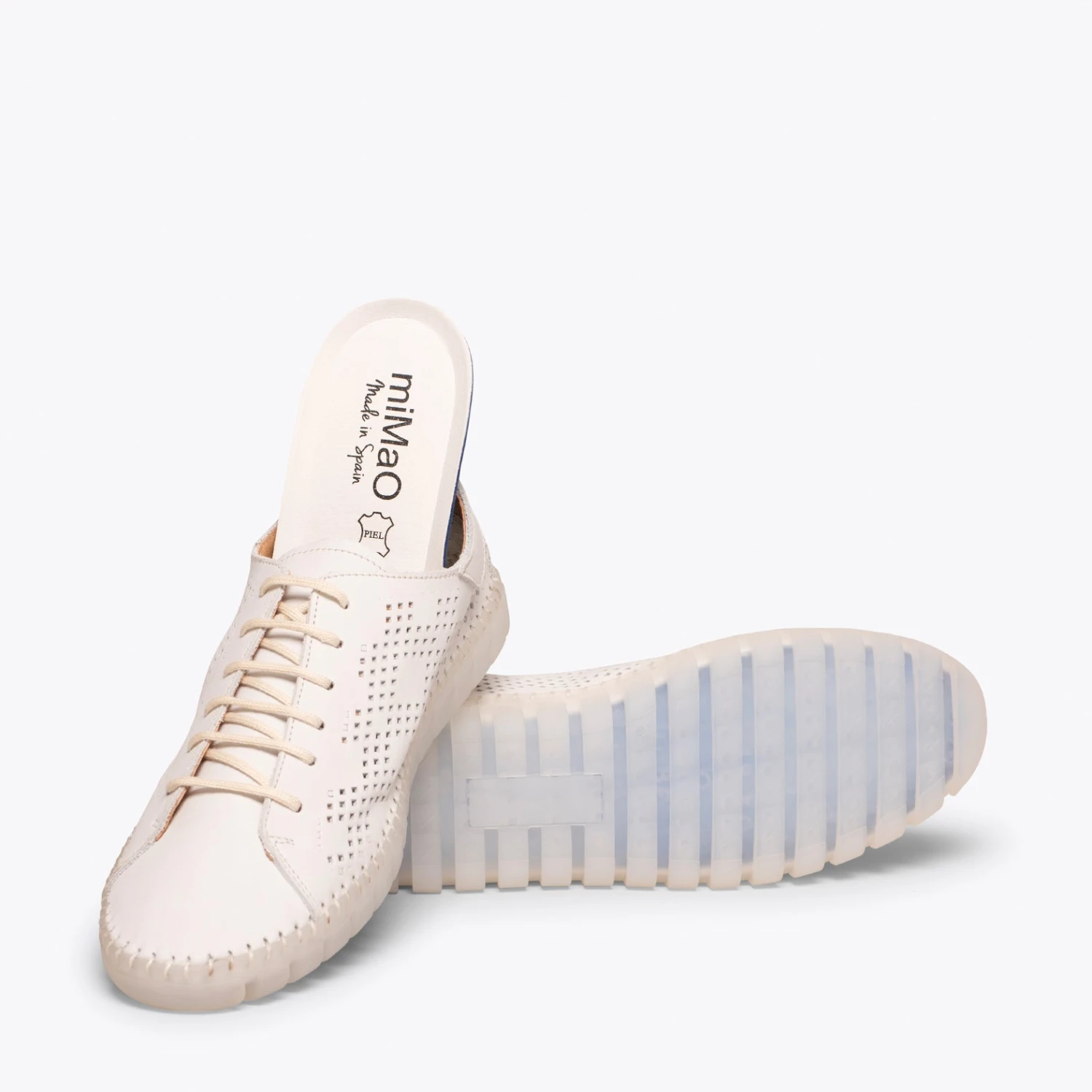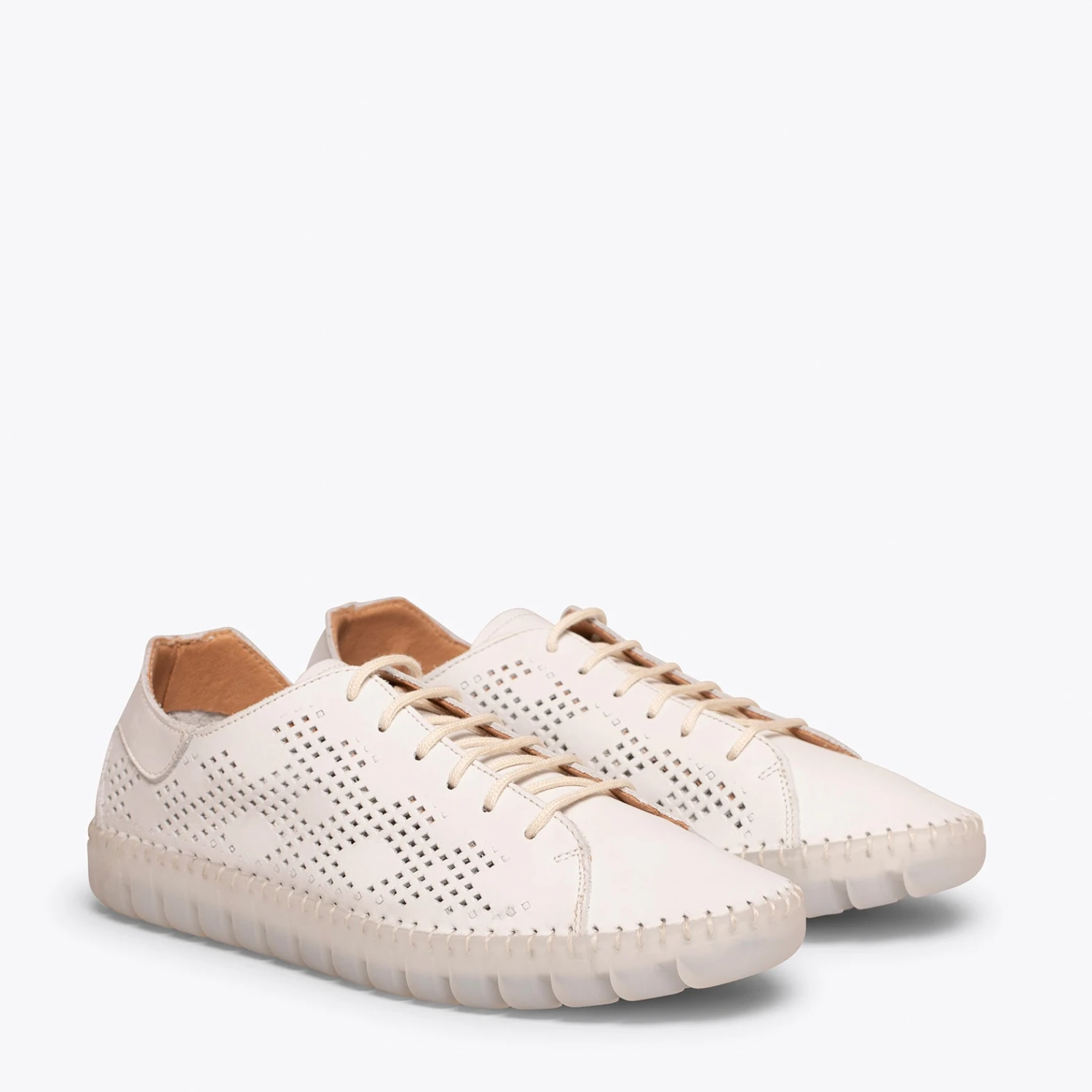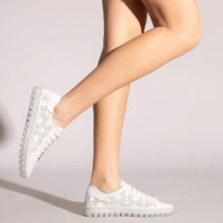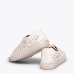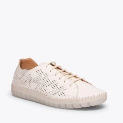 Sneaker confortable printemps – Ă©tĂ© pour femme. C’est une chaussure ultra flexible grâce Ă la semelle extĂ©rieure en caoutchouc transparent. Confort 100% garanti. Sneaker Ă lacets pour femme, en cuir, avec ornement trouĂ© gĂ©omĂ©trique sur les cĂ´tĂ©s. Elle intègre une semelle intĂ©rieure amovible ultra-confort gel. Que demander de plus Ă cette chaussure pour femme?