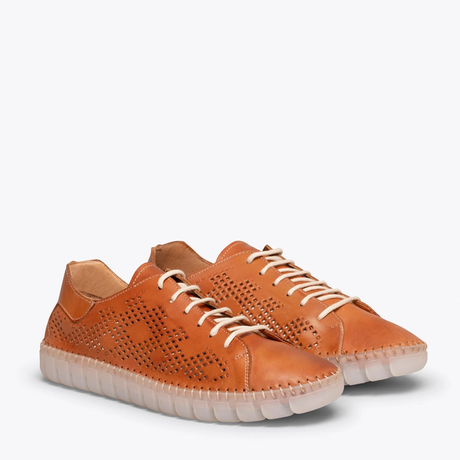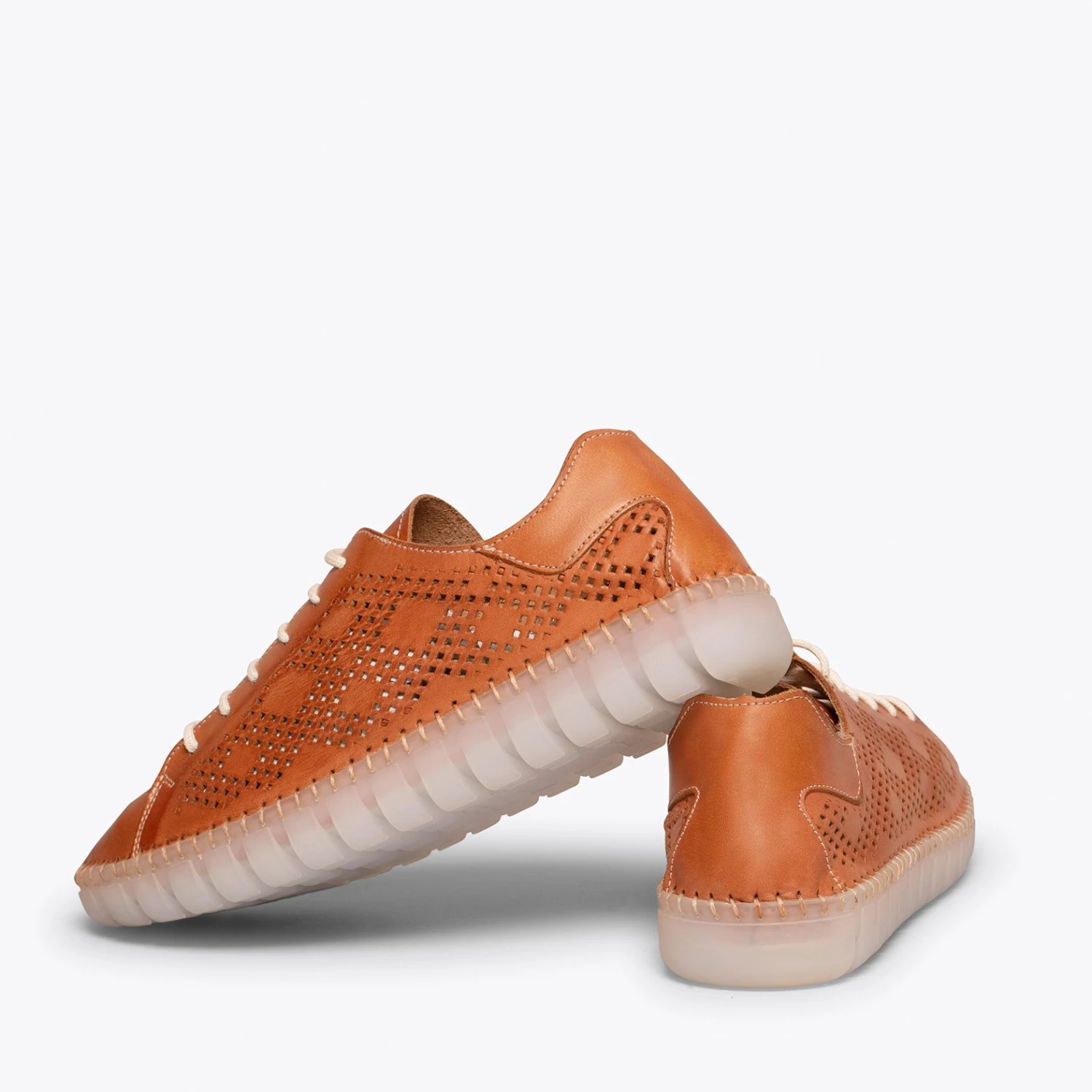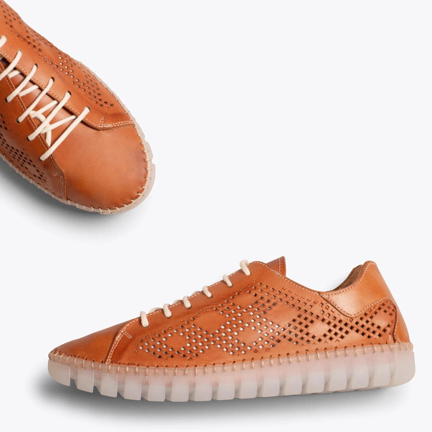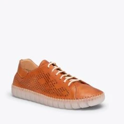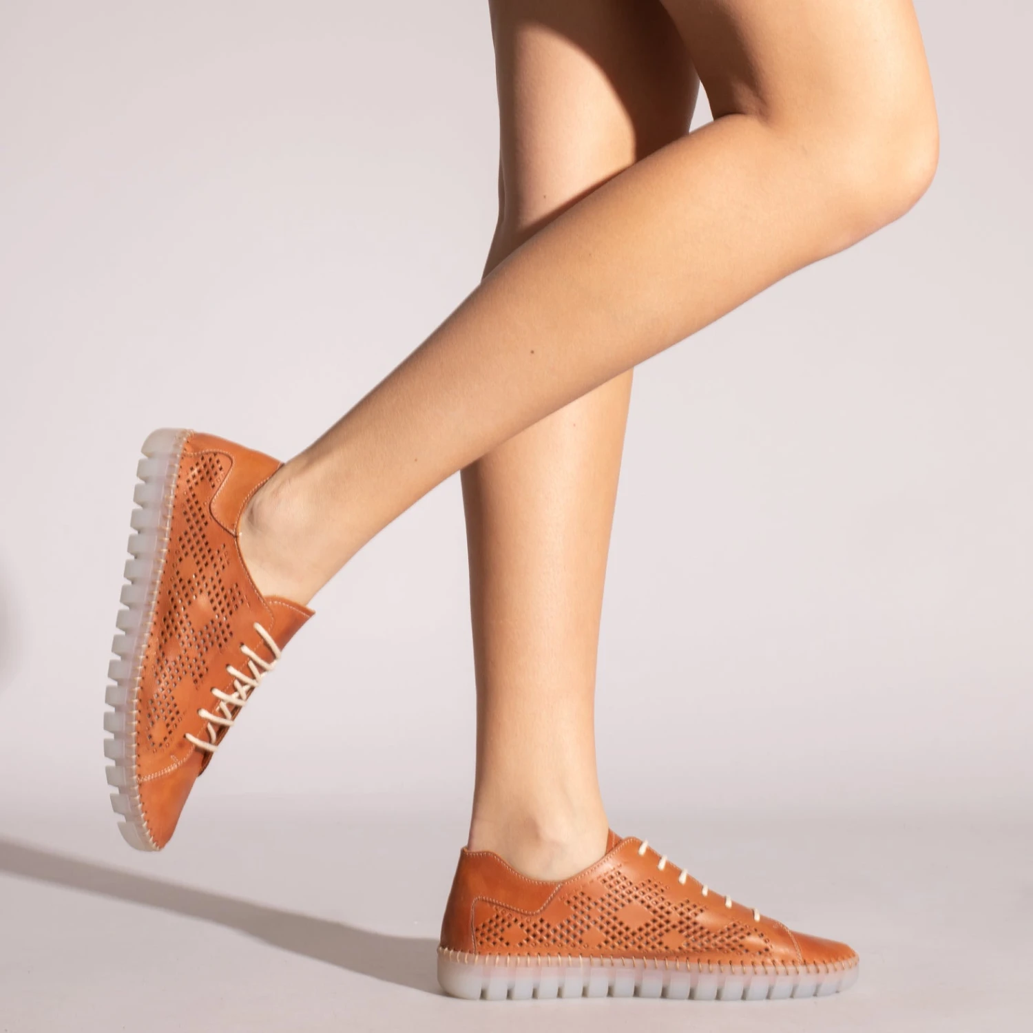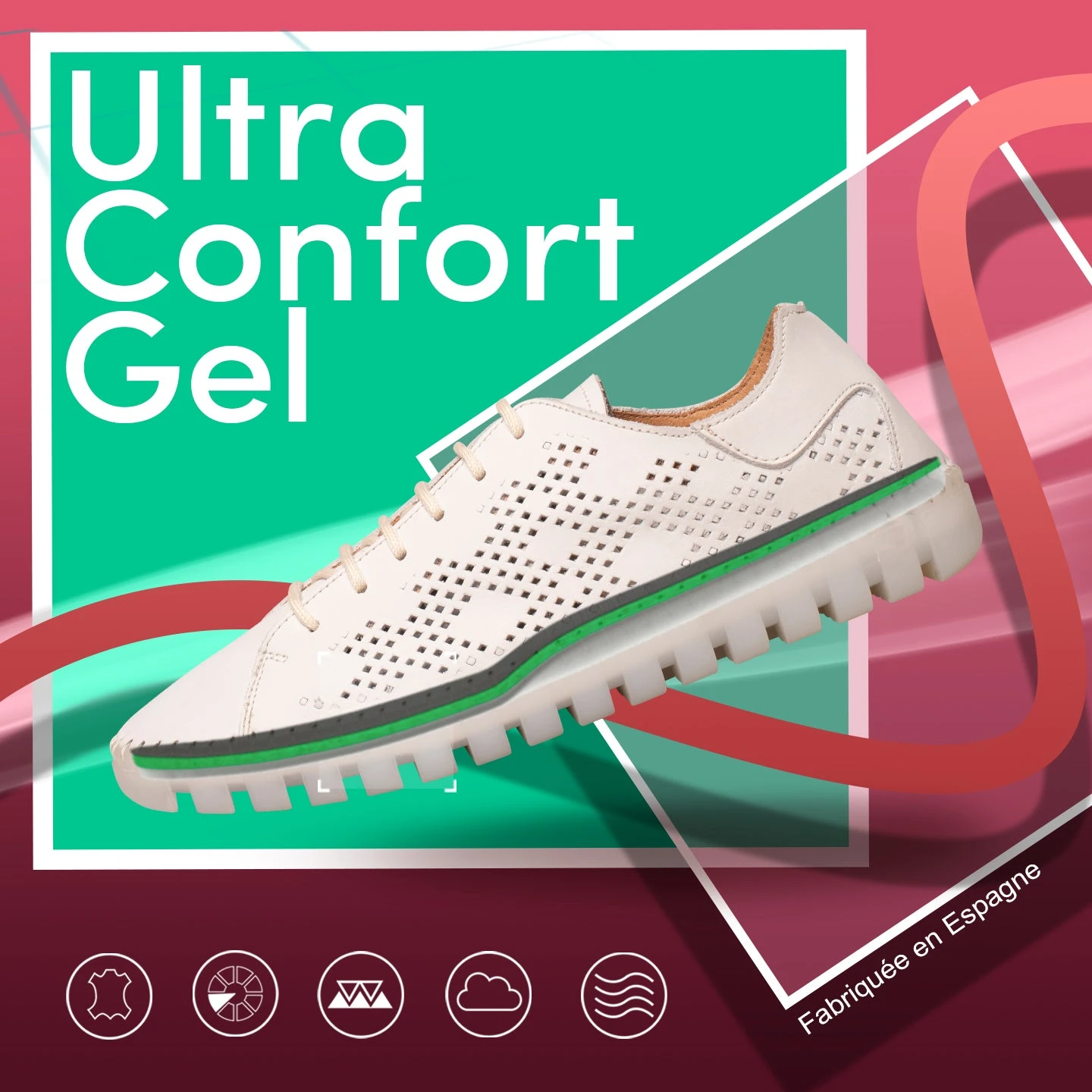 Sneaker confortable printemps – Ă©tĂ© pour femme. C’est une chaussure ultra flexible grâce Ă la semelle extĂ©rieure en caoutchouc transparent. Confort 100% garanti. Sneaker Ă lacets pour femme, en cuir, avec ornement trouĂ© gĂ©omĂ©trique sur les cĂ´tĂ©s. Elle intègre une semelle intĂ©rieure amovible ultra-confort gel. Que demander de plus Ă cette chaussure pour femme?