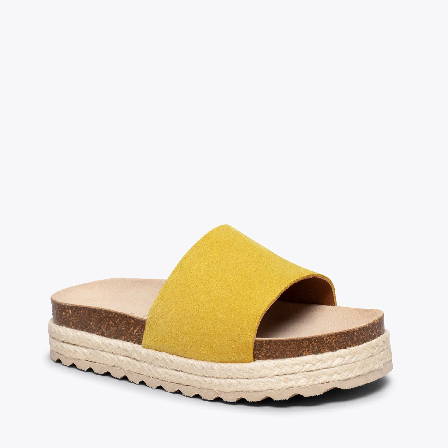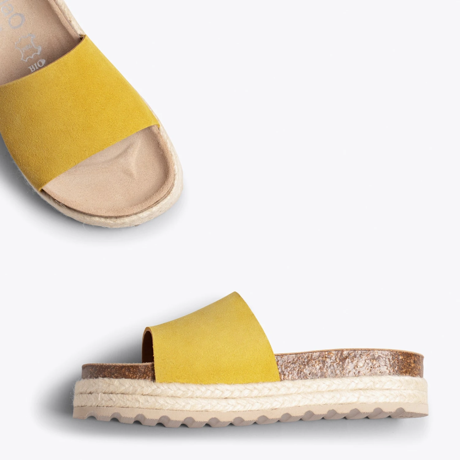 Sandales espadrille pour fille et semelle extĂ©rieure bio. Des sandales JAUNE type sabot qui seront super confortables pour jouer cet Ă©tĂ©. Sandales pour enfant en cuir nubuck qui intègrent la semelle intĂ©rieure en cuir Bio Ultra Confort Gel. Elles ne remarqueront pas qu’elles la portent! Sandales espadrille confortables pour fille en avec semelle extĂ©rieure Bio. Choisissez la qualitĂ© des chaussures pour enfants Made in Spain. Nouvelle collection enfant printemps-Ă©tĂ© 2021. Achetez en ligne des chaussures pour enfants chez miMaO. Sandales fille en nubuck JAUNE Sandales espadrille pour fille avec plateforme de 3 cm Technologie du confort: semelle intĂ©rieure en cuir Bio Ultra Confort Gel Semelle extĂ©rieure BIO Sandales en cuir pour enfants fabriquĂ©es en Espagne