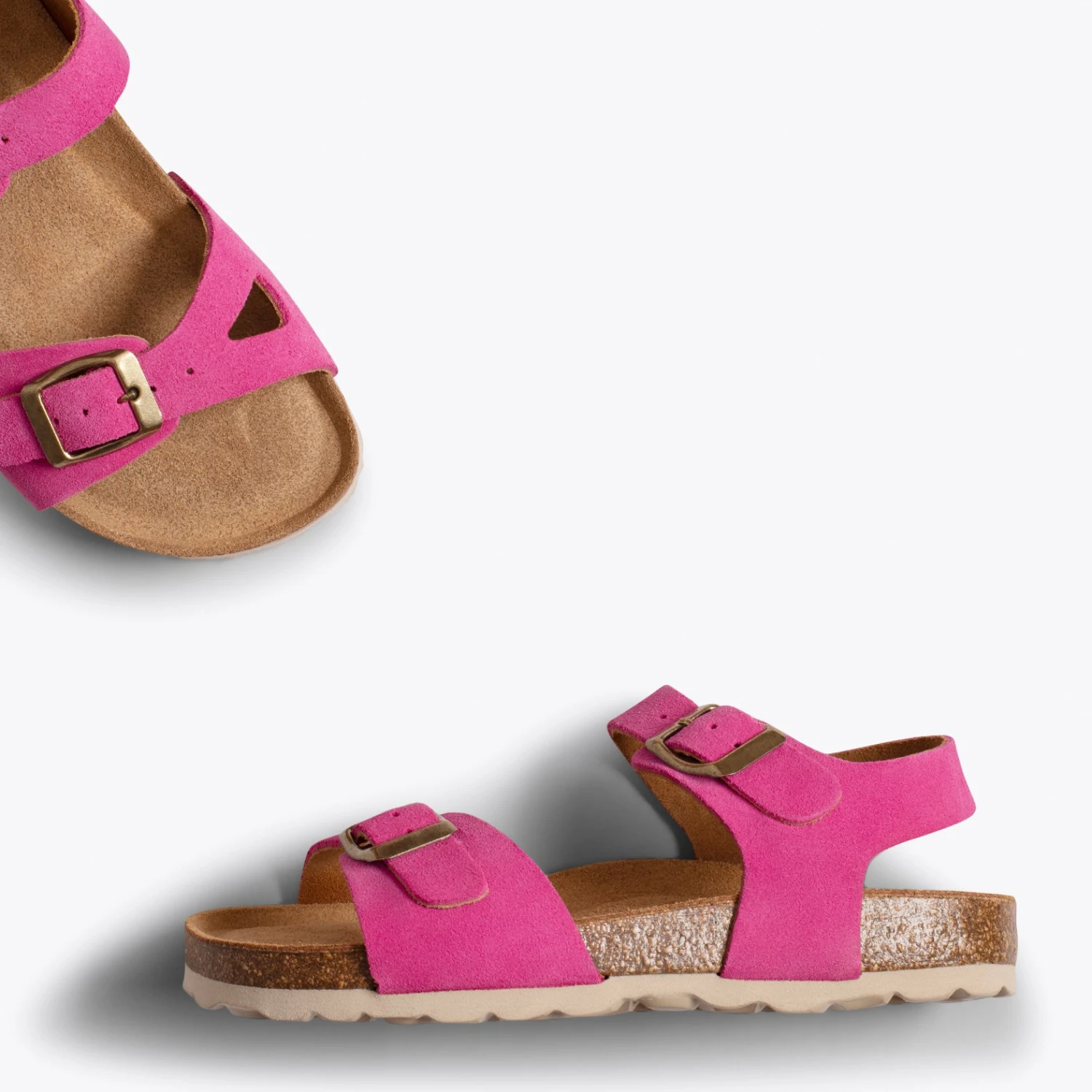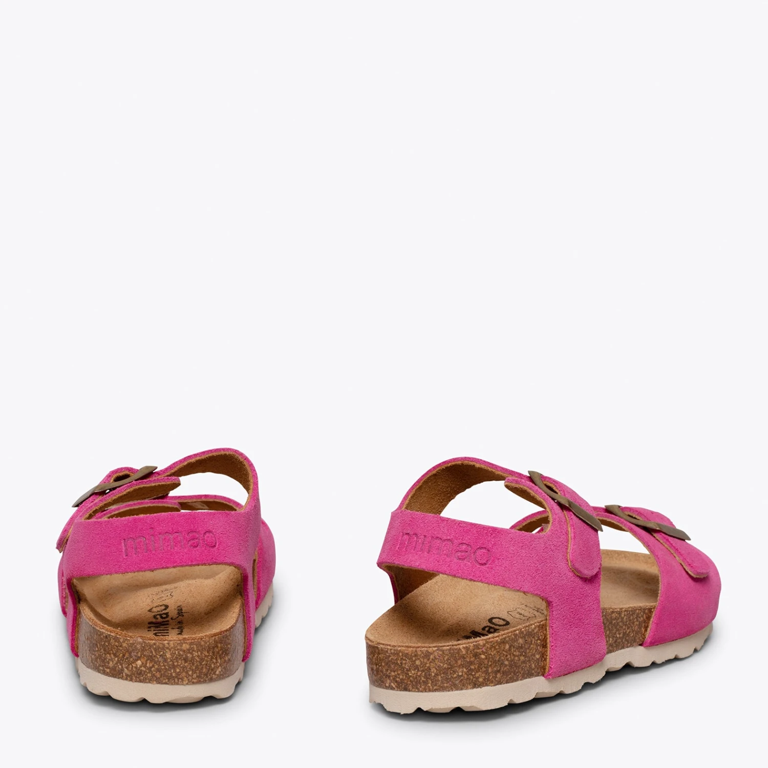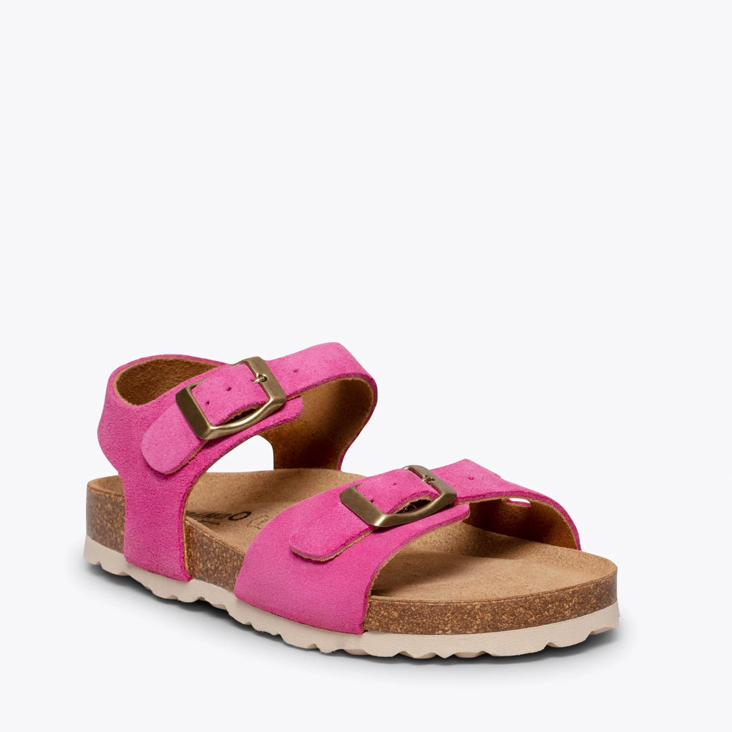 Sandales fille FUCHSIA Bio en cuir nubuck. Ces sandales pour enfant sont fermĂ©es par deux boucles dorĂ©es qui garantissent un maintien parfait du pied. De plus, cette sandale pour fille possède une semelle intĂ©rieure en cuir Ultra Confort Gel qui s’adaptera parfaitement Ă votre pied. Sandales pour enfant FUCHSIA avec semelle en caoutchouc antidĂ©rapante pour protĂ©ger chacun des pas de vos enfants. Achetez en ligne des chaussures pour enfant Printemps EtĂ© 2021. Disponible dans vos couleurs prĂ©fĂ©rĂ©es. Sandales BIO pour fille en cuir nubuck Sandales FUCHSIA fille Sandales pour enfant avec fermeture Ă boucle Technologie du confort: semelle intĂ©rieure en cuir Ultra Confort Gel Semelle en caoutchouc antidĂ©rapante Chaussures pour enfant fabriquĂ©es en Espagne