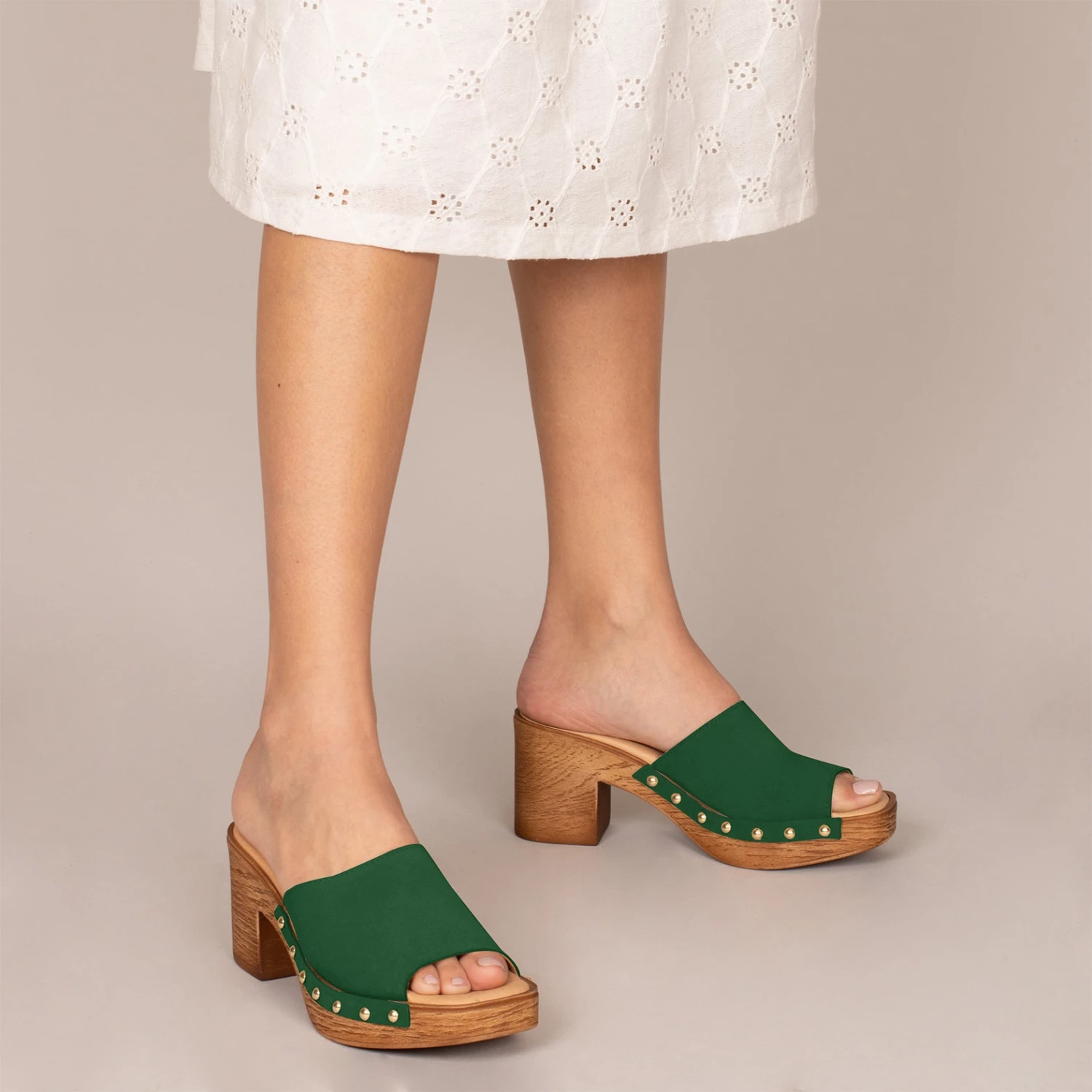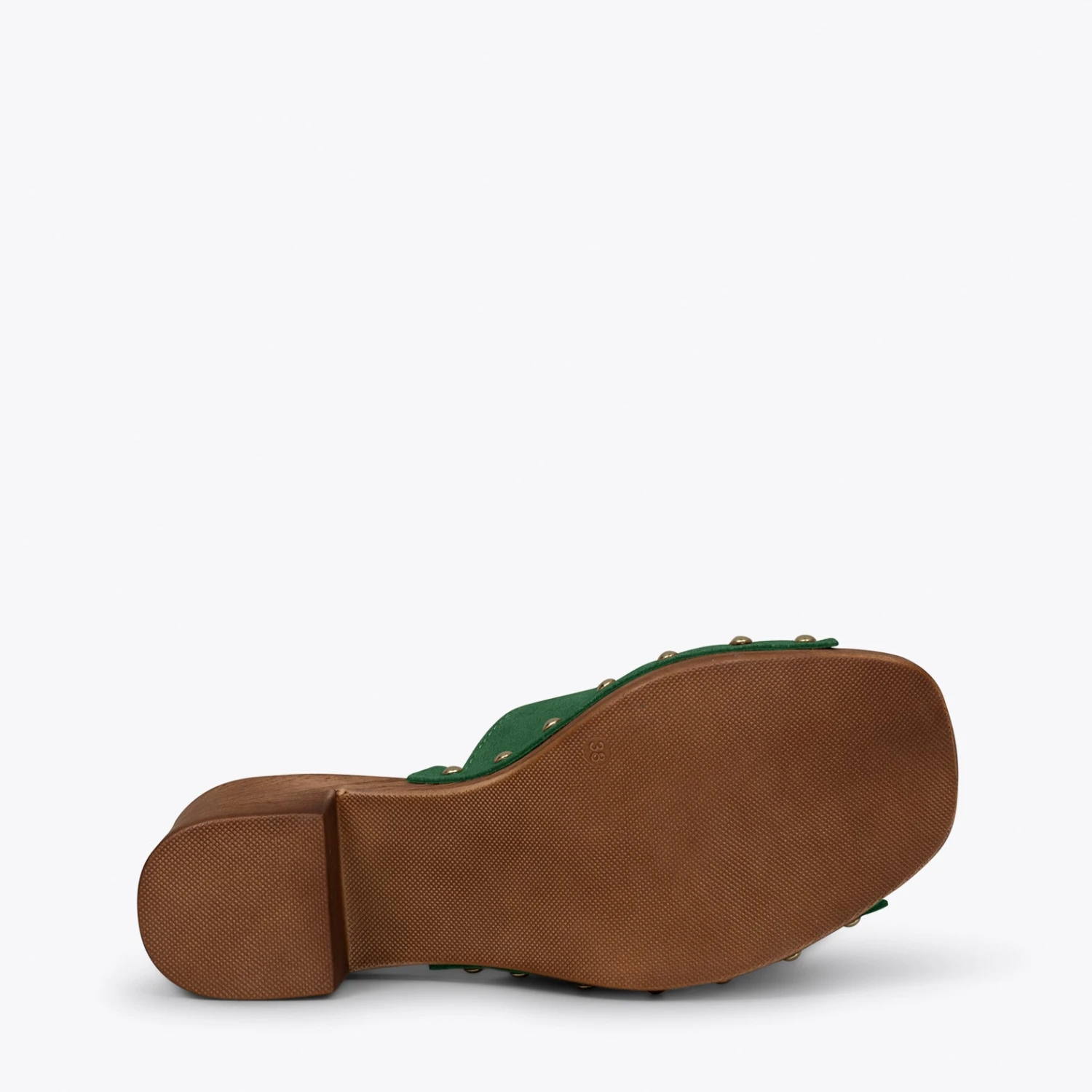Détails du sabot: clous ou rivets dorés sur nubuck au ton
