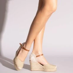 Sandales espadrille BEIGE type Valenciennes. Espadrilles compensĂ©es BEIGE en toile avec un dĂ©colletĂ© en V qui styliseront votre pied. Des chaussures espadrilles qui se marieront avec vos tenues prĂ©fĂ©rĂ©es printemps Ă©tĂ© 2021. Ces sandales espadrilles compensĂ©es seront très confortables, puisqu’elles ont la semelle intĂ©rieure en cuir Goutte Ultra Confort Gel, marchez pendant des heures et votre pied sera toujours reposĂ©.