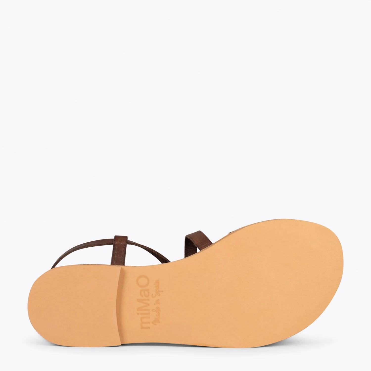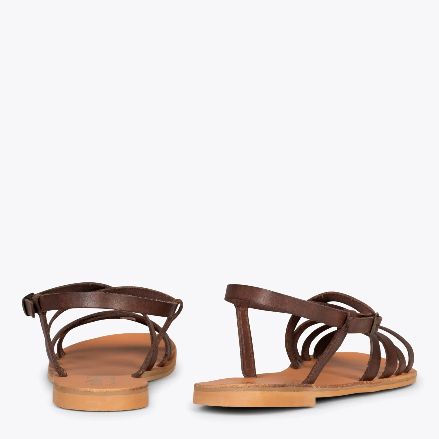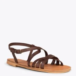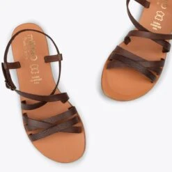 La tige est formĂ©e par trois lanières en cuir qui s’entrelacent, offrant un très joli motif. Les lanières arrière sont munies d’une boucle rĂ©glable Ă trois trous.