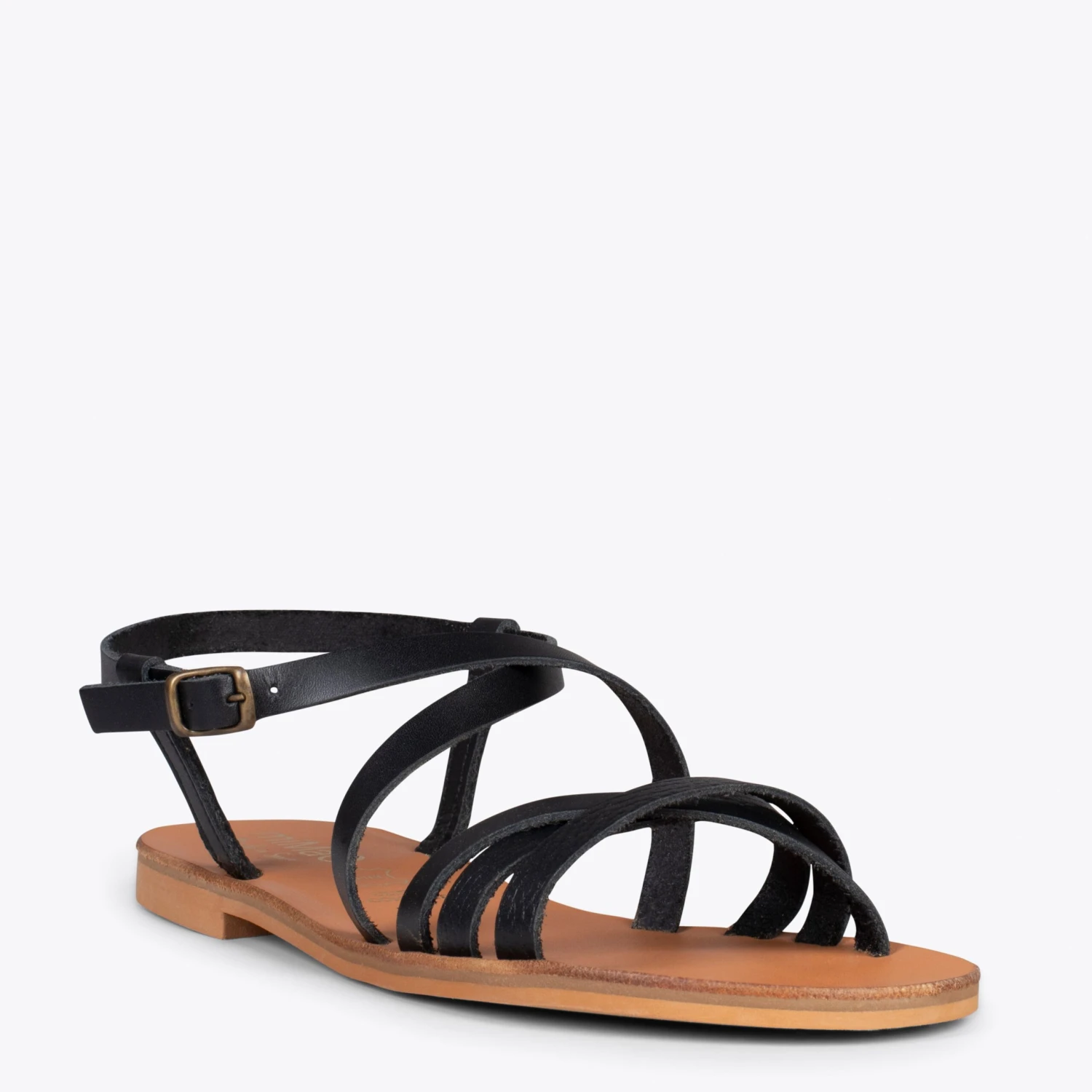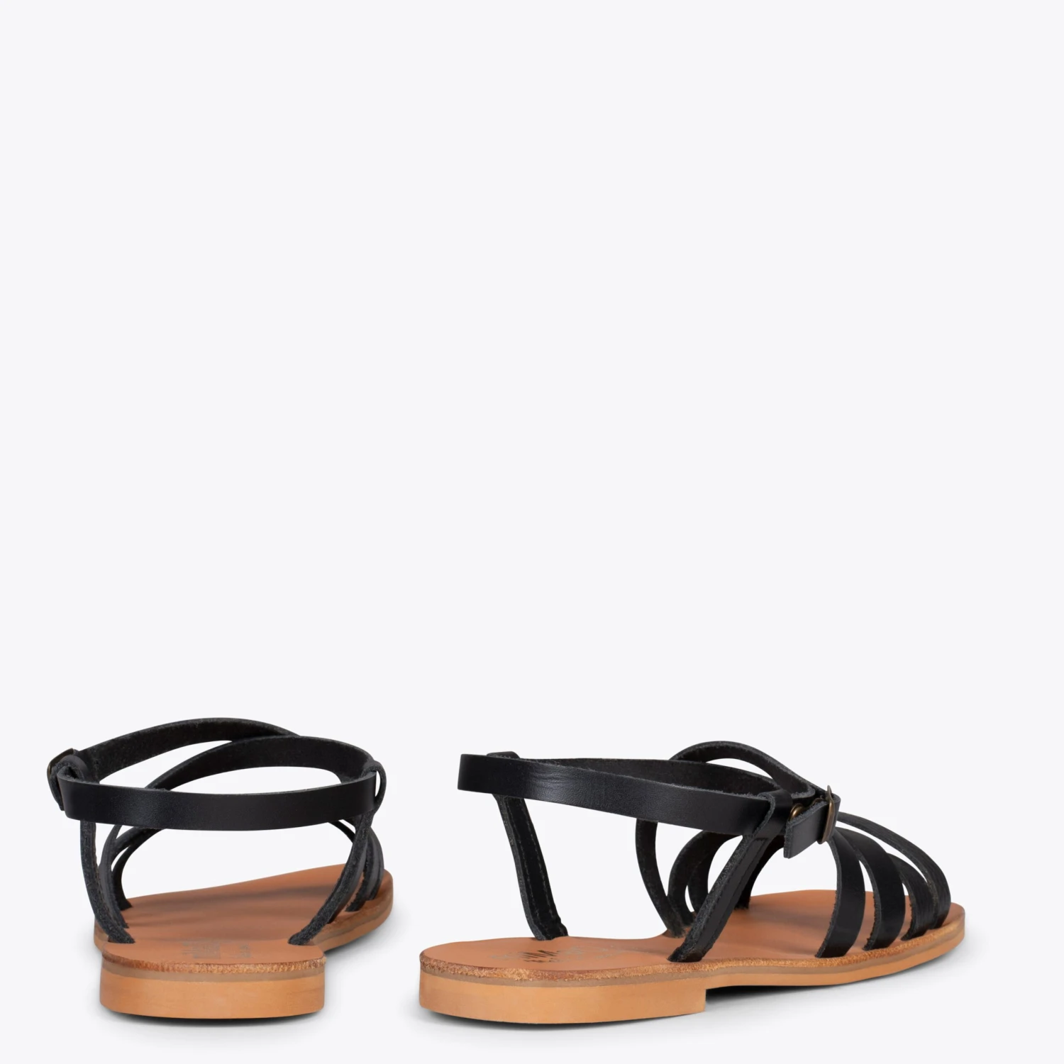 La tige est formĂ©e par trois lanières en cuir qui s’entrelacent, offrant un très joli motif. Les lanières arrière sont munies d’une boucle rĂ©glable Ă trois trous.
