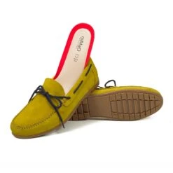 MOCASSIN POUR HOMME COULEUR JAUNE AVEC LACETS BLEU MARINE ET DÉCORATION. CHAUSSURES EN CUIR NUBUCK GRIS CONFORTABLES POUR HOMME AVEC SEMELLE INTÉRIEURE EN CUIR MEMORY ABSORBER FOAM ET SEMELLE EXTÉRIEURE EN CAOUTCHOUC MARRON. ESSAYEZ LA QUALITÉ DE CETTE CHAUSSURE EN CUIR FABRIQUÉE EN ESPAGNE. ACHETEZ VOS CHAUSSURES EN LIGNE CONFORTABLES ET COMBINEZ MODE ET CONFORT.