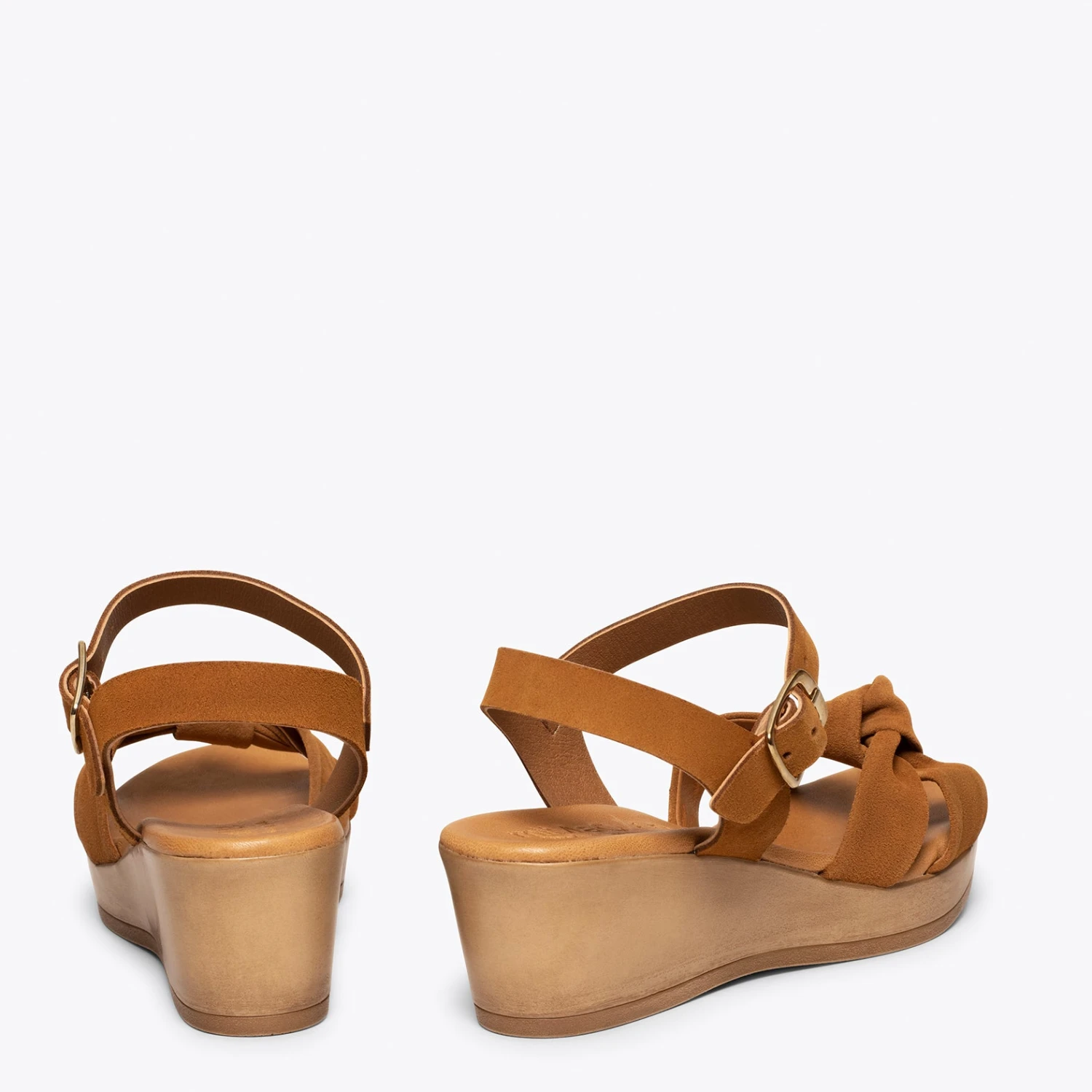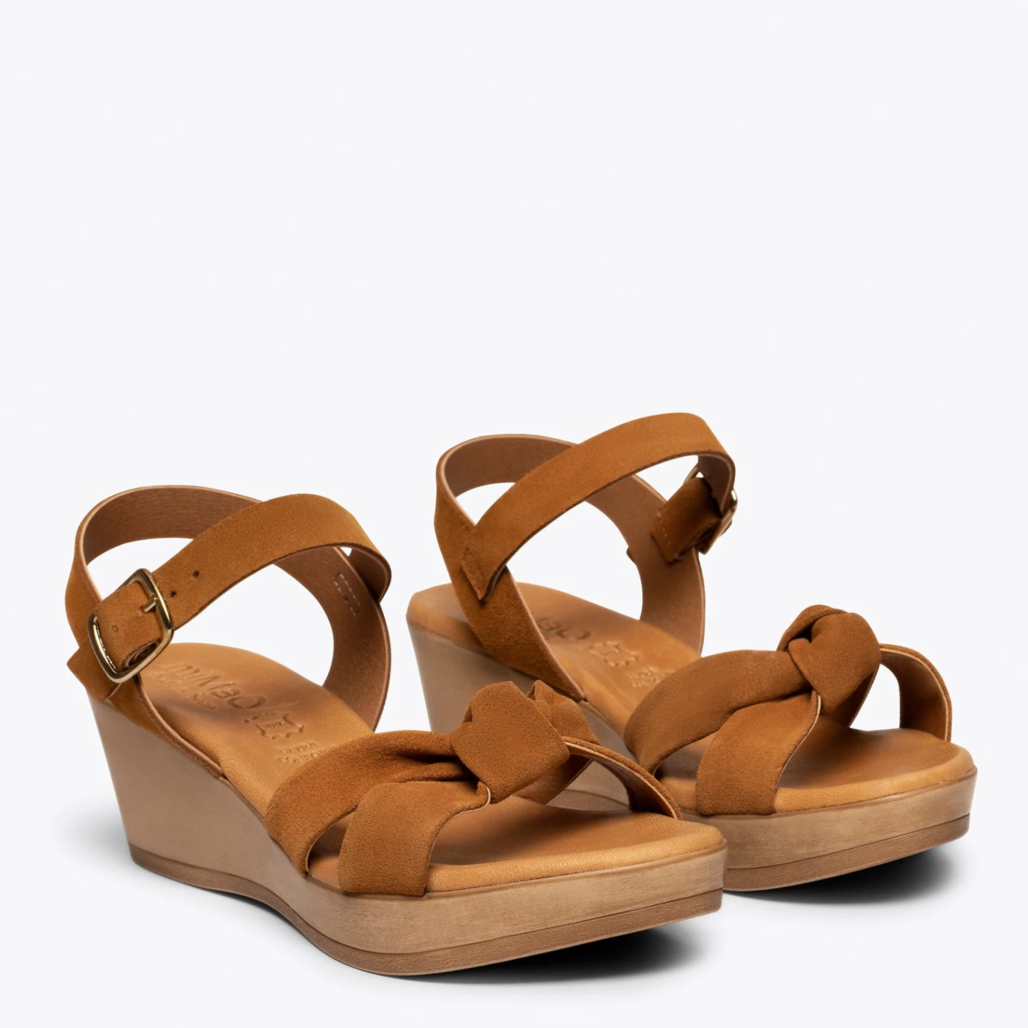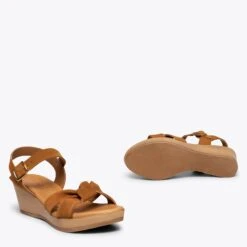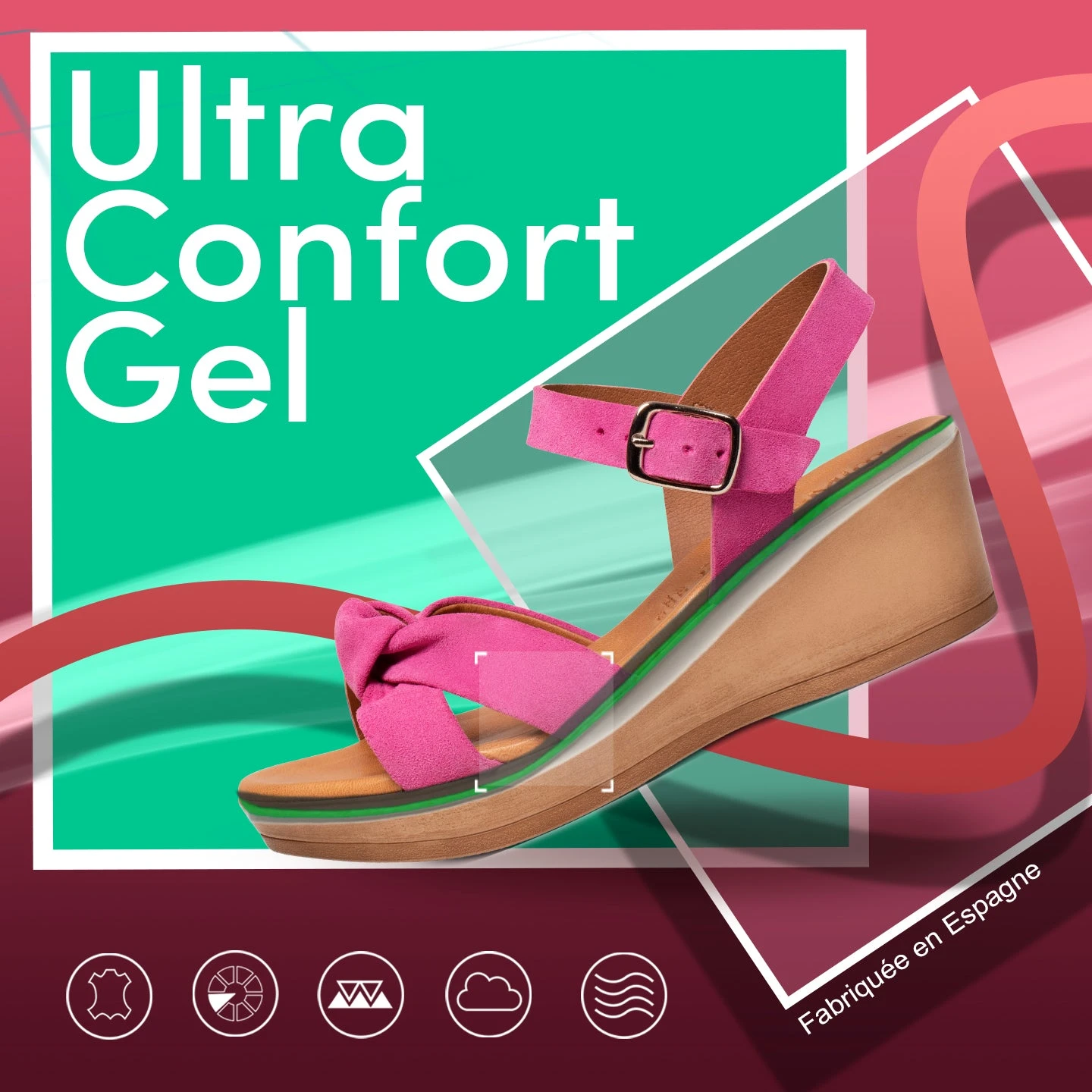 CompensĂ©es MARRON avec plateforme de hauteur moyenne idĂ©ales pour votre quotidien. Avec ses brides Ă l’avant en forme de nĹ“ud, elle donnera une touche diffĂ©rente Ă vos sandales compensĂ©es, dont la hauteur est de 5,5 cm. Sandales pour femme en cuir nubuck, qui intègrent Ă©galement la semelle intĂ©rieure en cuir rembourrĂ© Ultra Confort Gel. Vous ne remarquerez pas que vous les portez!