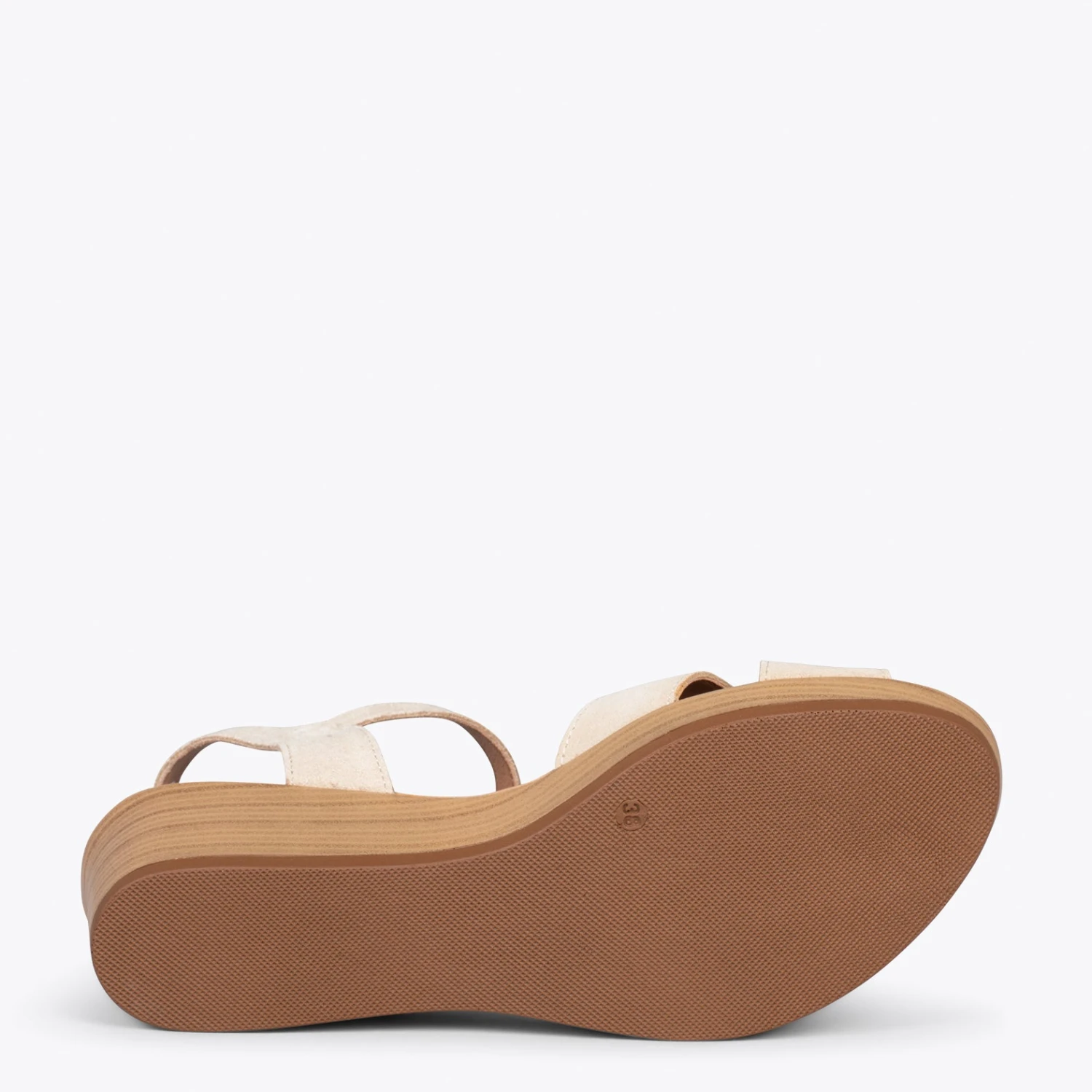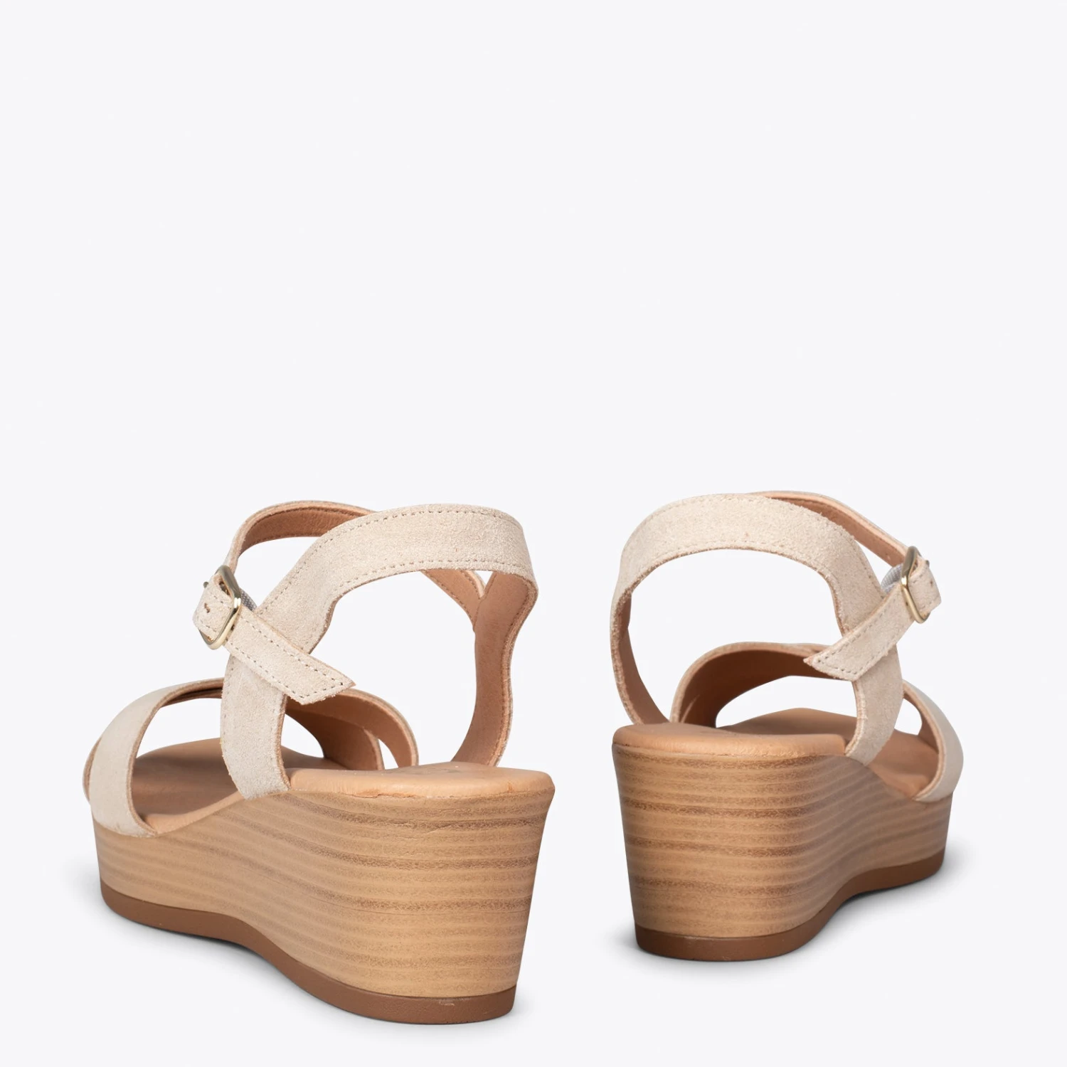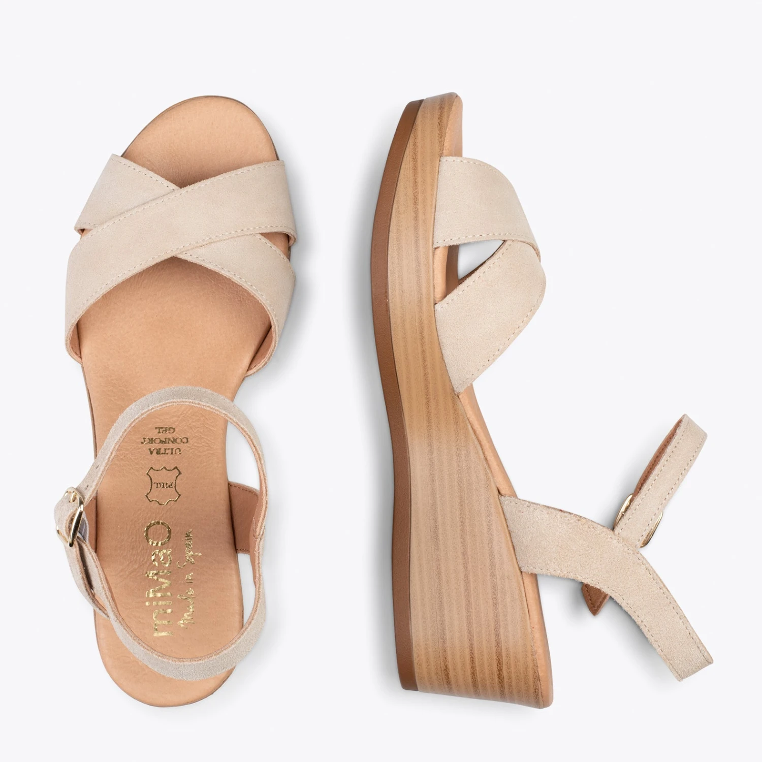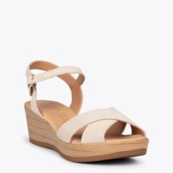 Le compensé est très léger, avec un design en imitation bois, pour nous permettre de gagner des cm sans souffrir la hauteur d’un talon élevé.