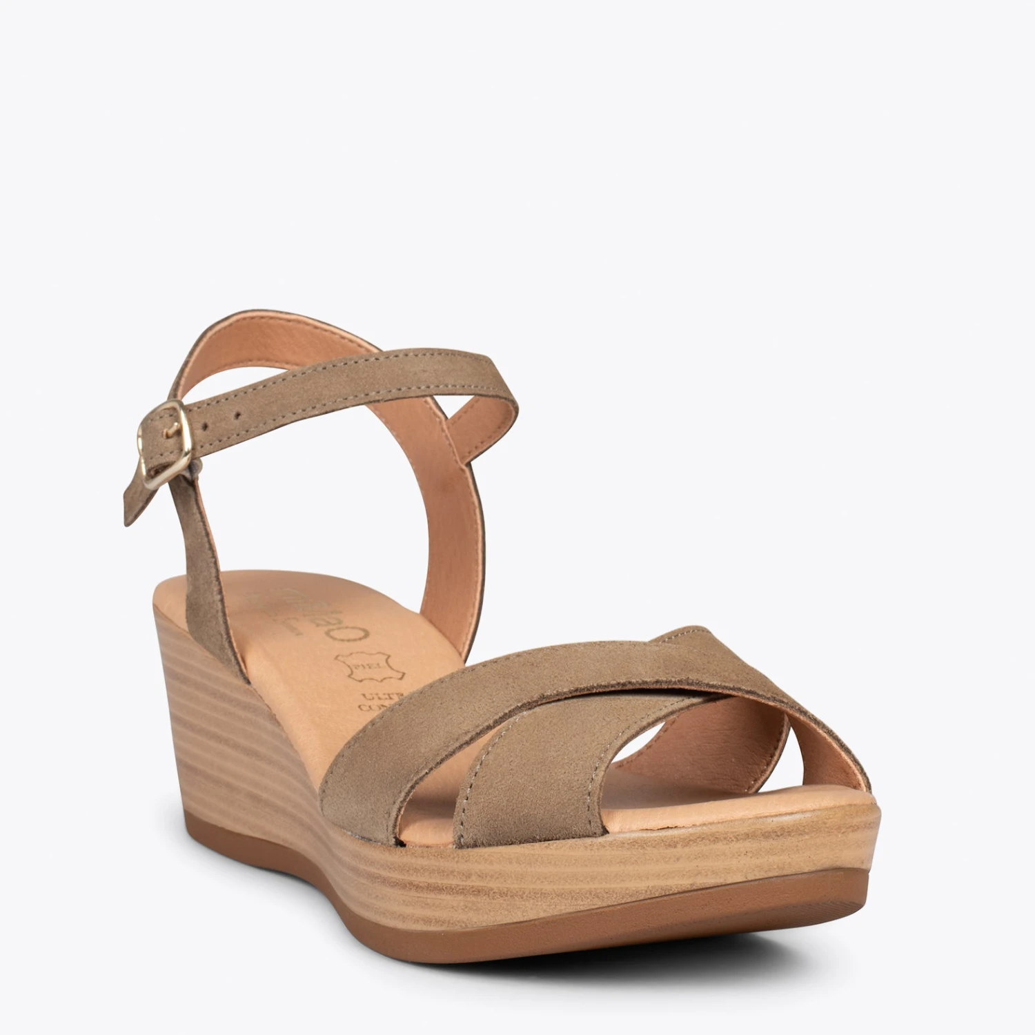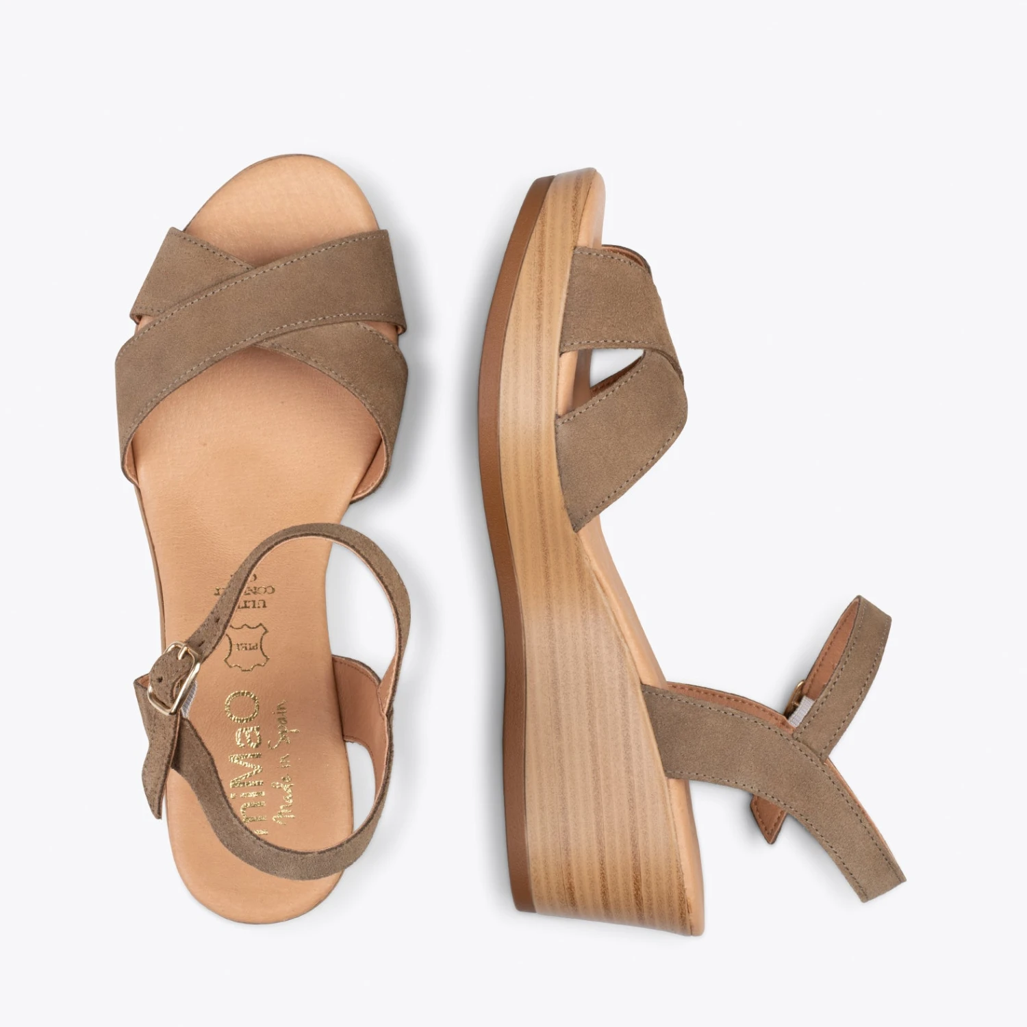 Le compensé est très léger, avec un design en imitation bois, pour nous permettre de gagner des cm sans souffrir la hauteur d’un talon élevé.