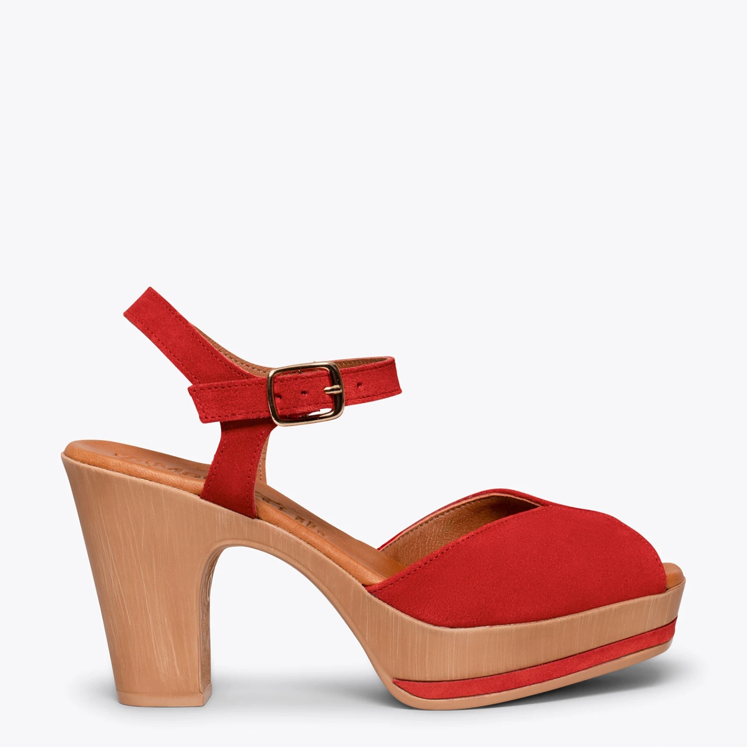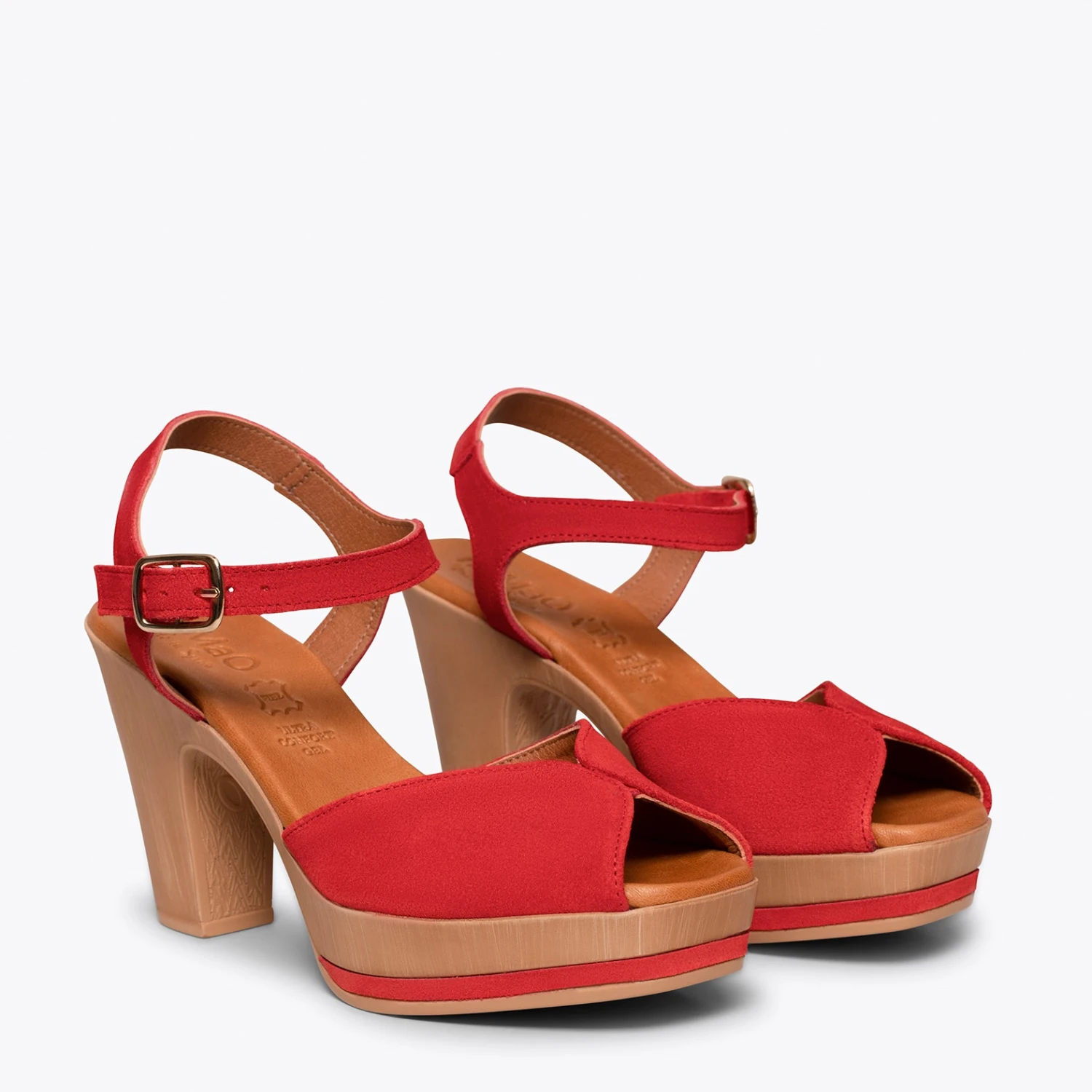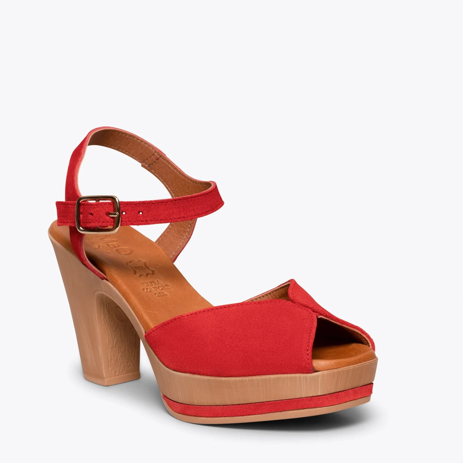 Sandales à plateforme ROUGE et talon haut. Si vous recherchez des talons hauts confortables, cette sandale est idéale. Sandales compensées en cuir nubuck ROUGE avec un bracelet à la cheville de la même couleur. Avec la semelle intérieure en cuir Ultra Confort Gel, vous ne sentirez pas le talon haut de cette sandale. Votre pied sera au repos tout le temps.