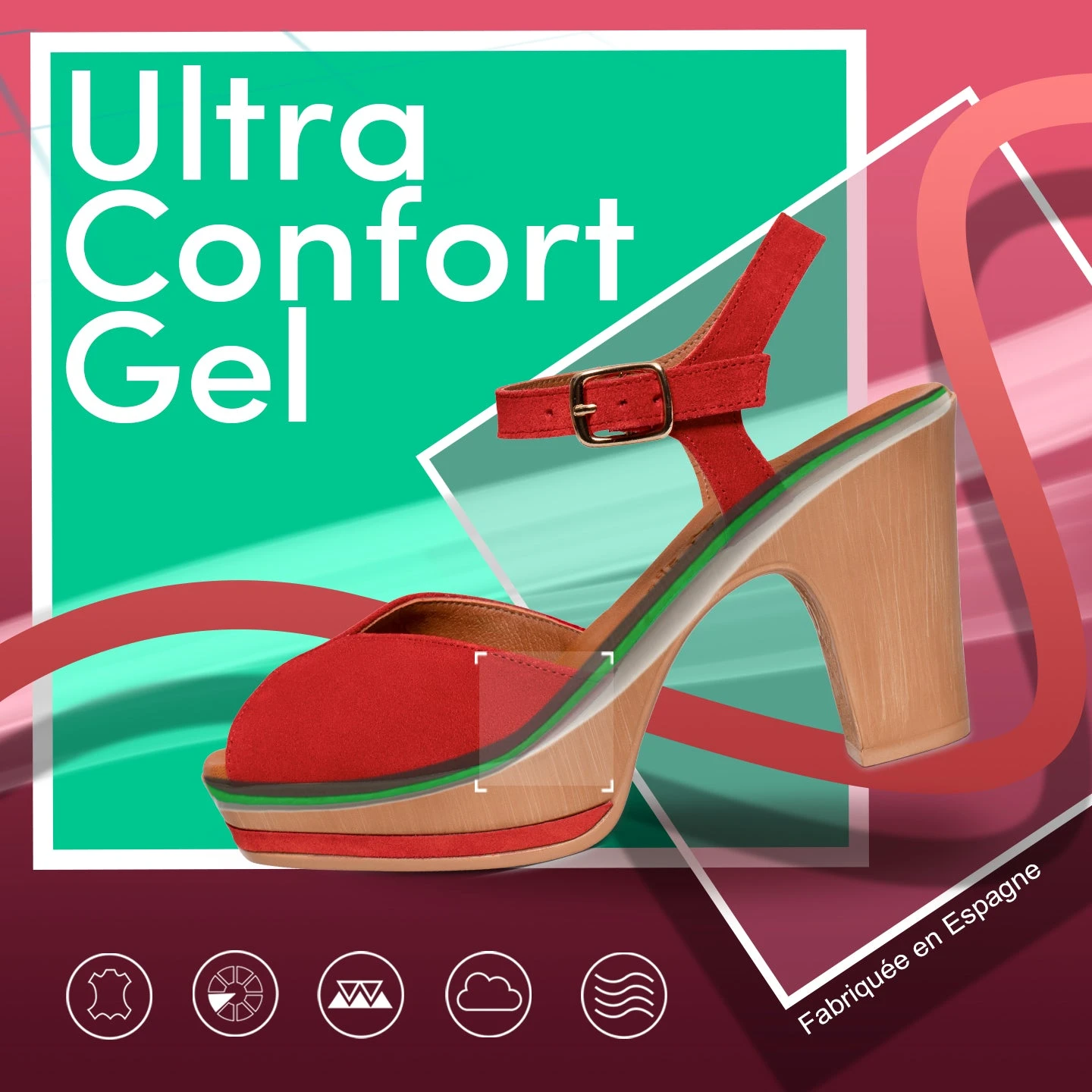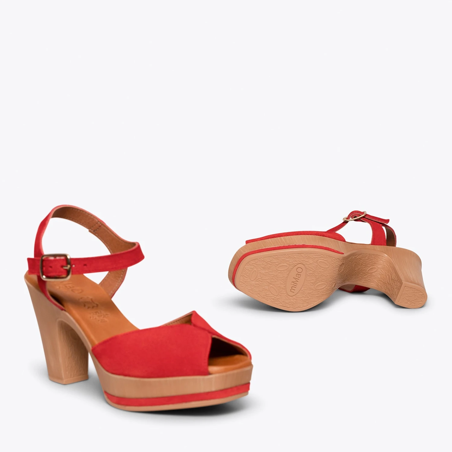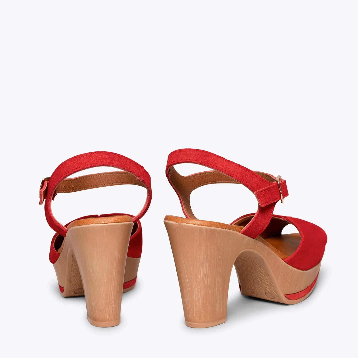 Sandales à plateforme ROUGE et talon haut. Si vous recherchez des talons hauts confortables, cette sandale est idéale. Sandales compensées en cuir nubuck ROUGE avec un bracelet à la cheville de la même couleur. Avec la semelle intérieure en cuir Ultra Confort Gel, vous ne sentirez pas le talon haut de cette sandale. Votre pied sera au repos tout le temps.