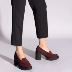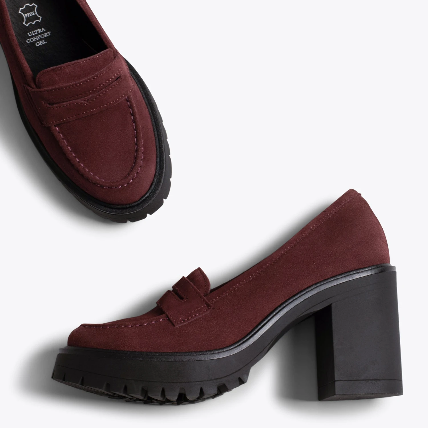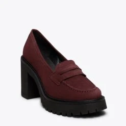 Mocassins pour femmes en NUBUCK BORDEAUX. Talons hauts de 9 cm et plateforme de 3 cm. Technologie de confort: semelle intérieure en cuir Ultra Confort Gel Semelle de piste en caoutchouc: dentelée et avec relief antidérapant Nouvelle collection automne-hiver de chaussures pour femmes Chaussures fabriquées en Espagne