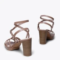 Sandale élégante NUDE à lanières croisées sur le devant et double lanière à la cheville. Cette sandale habillée NUDE a un talon de 7,5 cm de hauteur avec imprimé bois et une plateforme à l’avant de 1,5 cm. La fermeture de cette sandale est à boucle, elle sera donc très facile à ajuster à votre convenance. Elle a également une semelle intérieure dotée de la technologie de confort avec la goutte confort gel, vous irez confortablement à tous vos événements les plus importants.