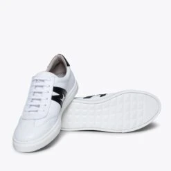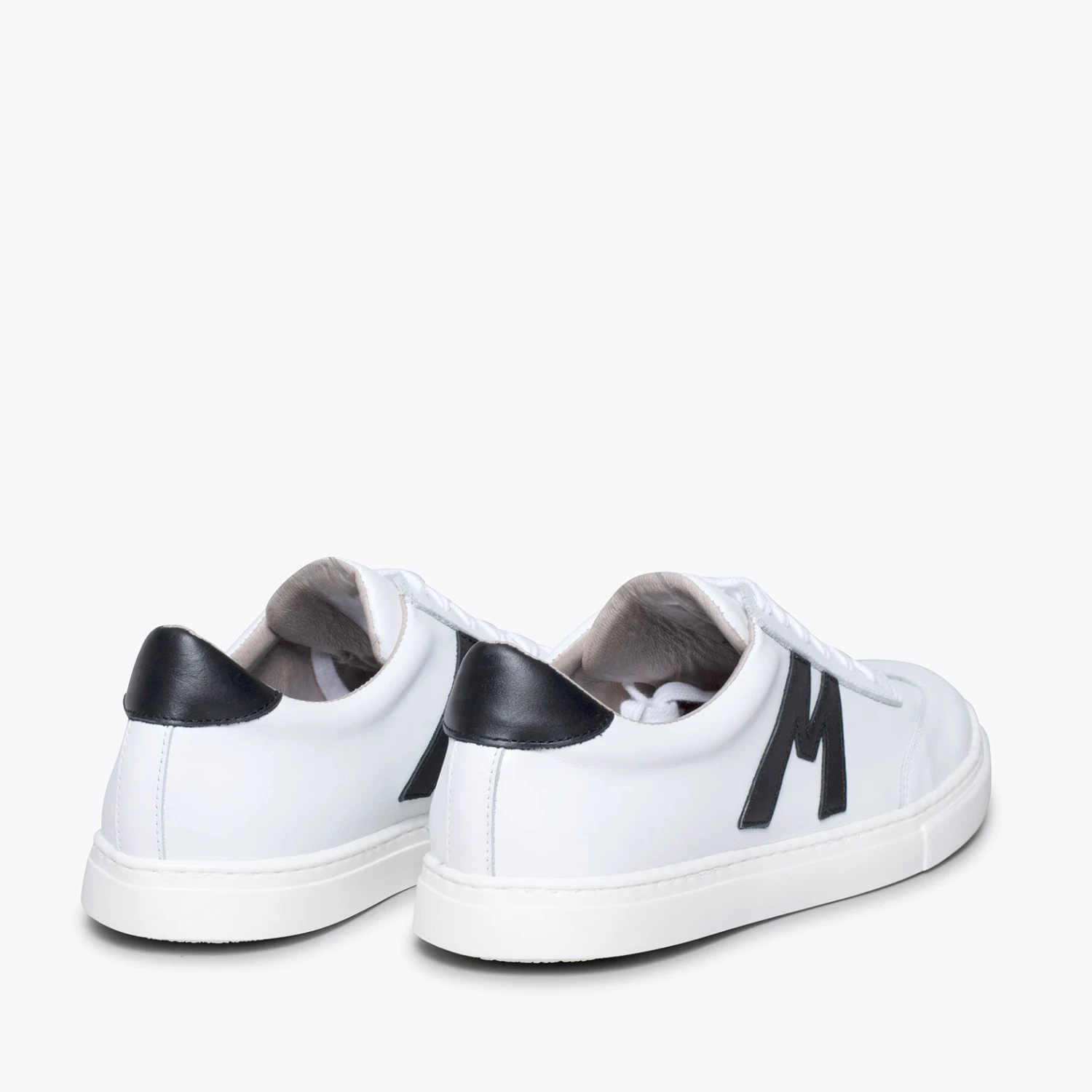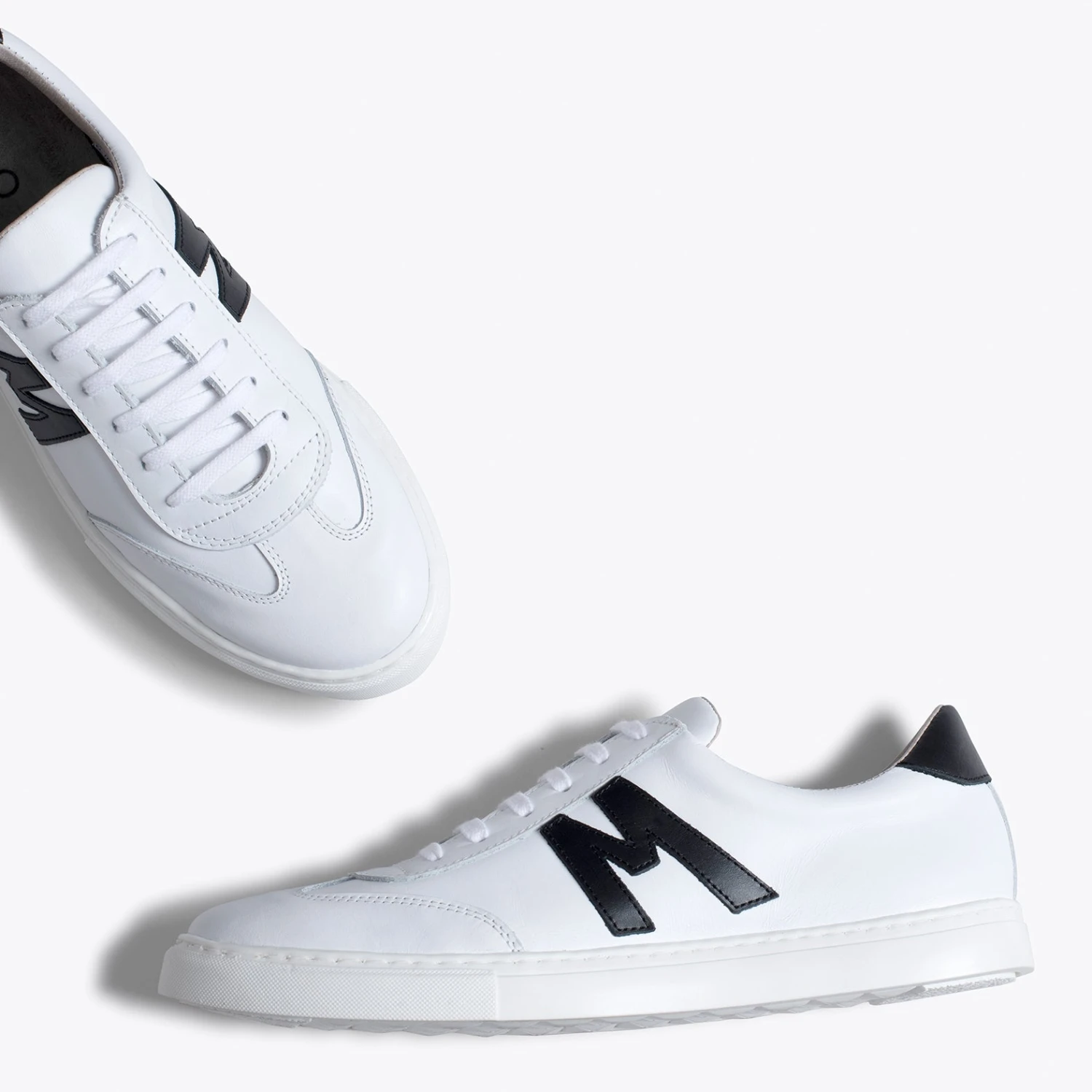 Sneakers pour homme BLANC avec ornement dĂ©coratif M couleur NOIR sur les cĂ´tĂ©s. Chaussures de sport avec lacets pour s’adapter parfaitement Ă votre pied. Ce sneaker BLANC avec une semelle extĂ©rieure en caoutchouc antidĂ©rapant blanche intègre la technologie confort Memory Absorber Foam. Grâce Ă cette technologie, la semelle intĂ©rieure amovible prendra la forme de votre pied après plusieurs utilisations, elle ressemblera donc Ă une semelle intĂ©rieure faite sur mesure. Cette chaussure BLANC est fabriquĂ©e en cuir lisse en Espagne.