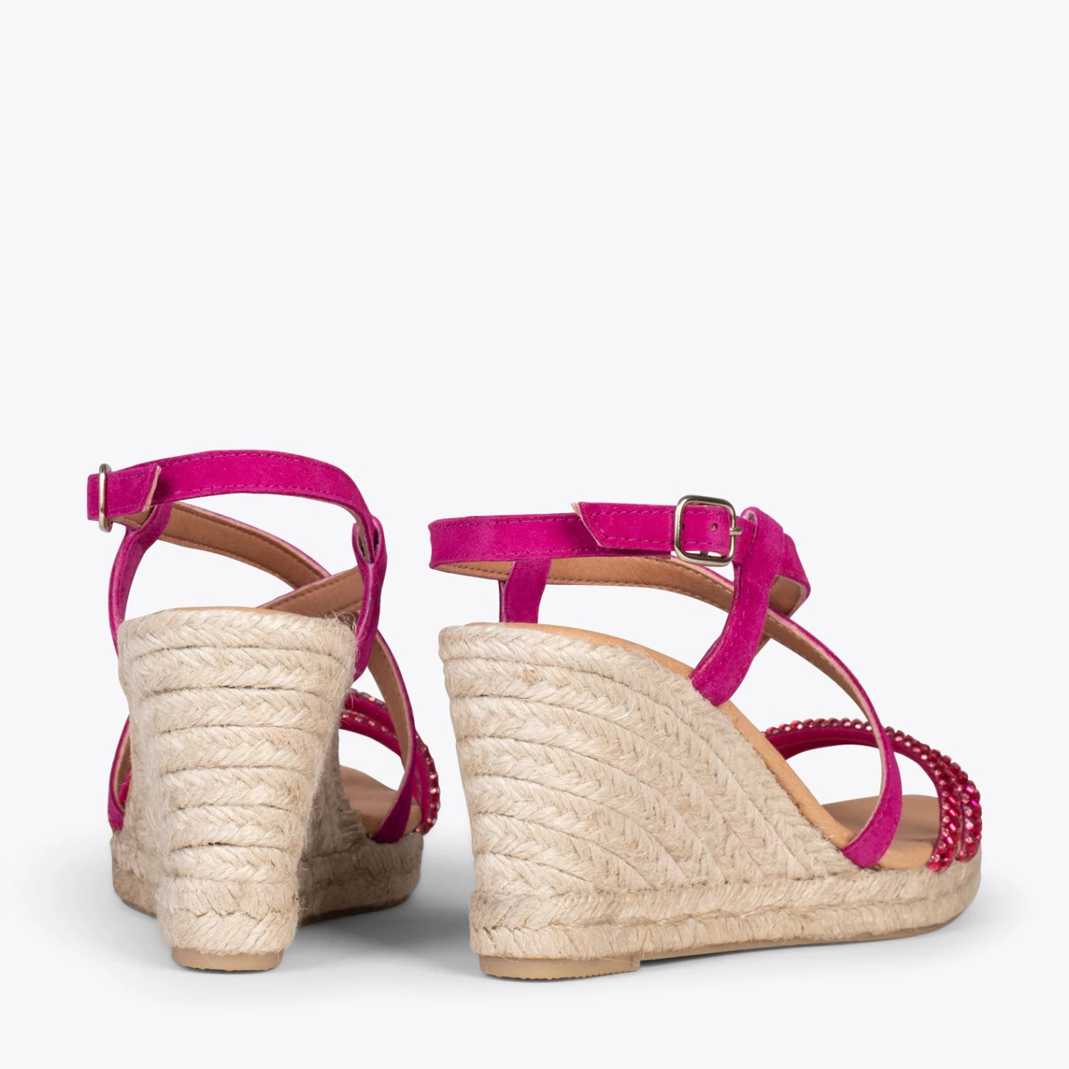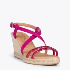 La hauteur du compensé est de 9 cm et celle de la plateforme est de 2,5 cm. Cette espadrille compte avec une paire de brides avant avec micro-strass, qui offre une touche festive et amusante. Les lanières arrière sont munies d’une boucle, qui forme une tresse enveloppant le pied et mettant en valeur la silhouette du pied.